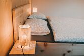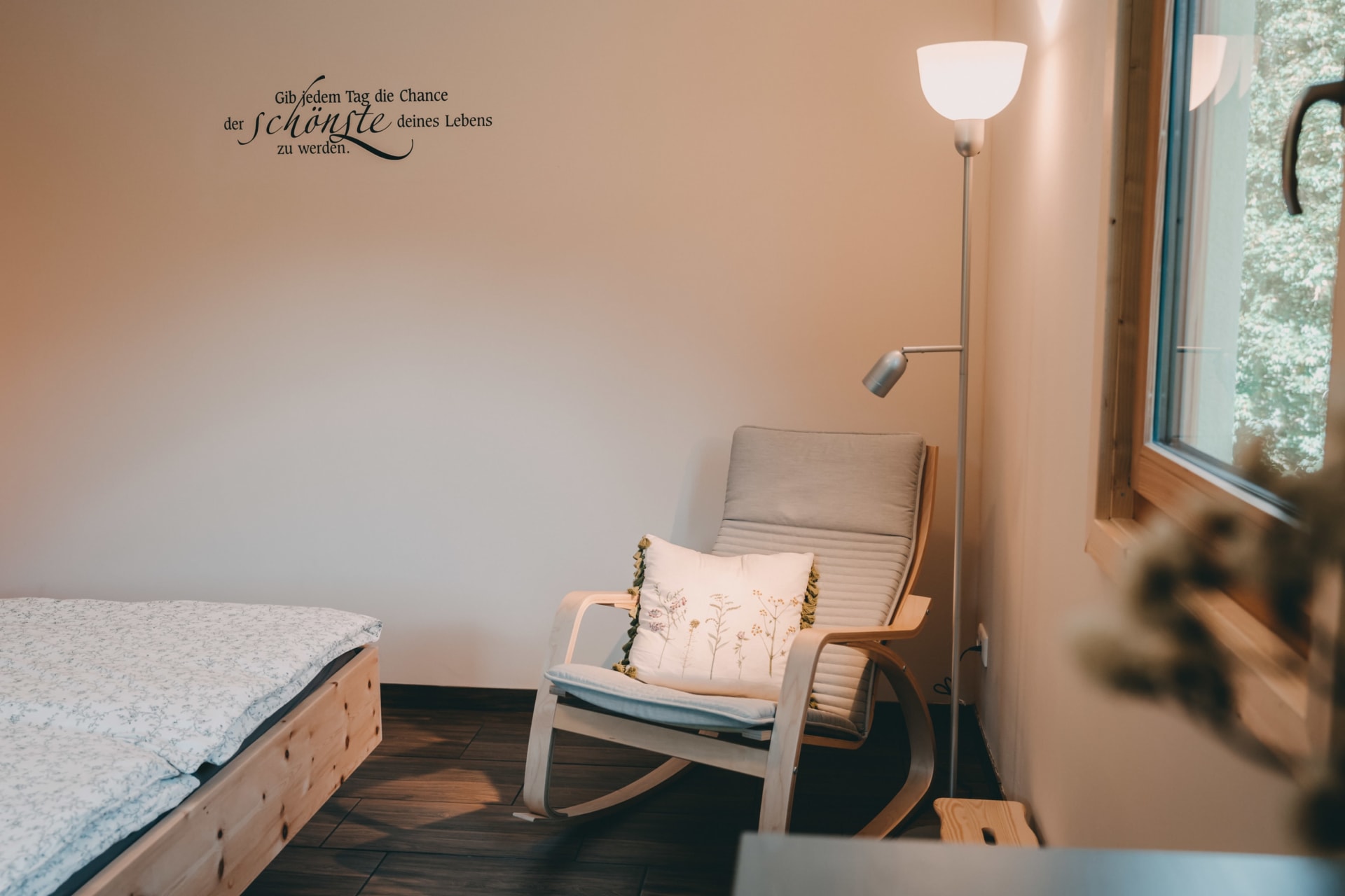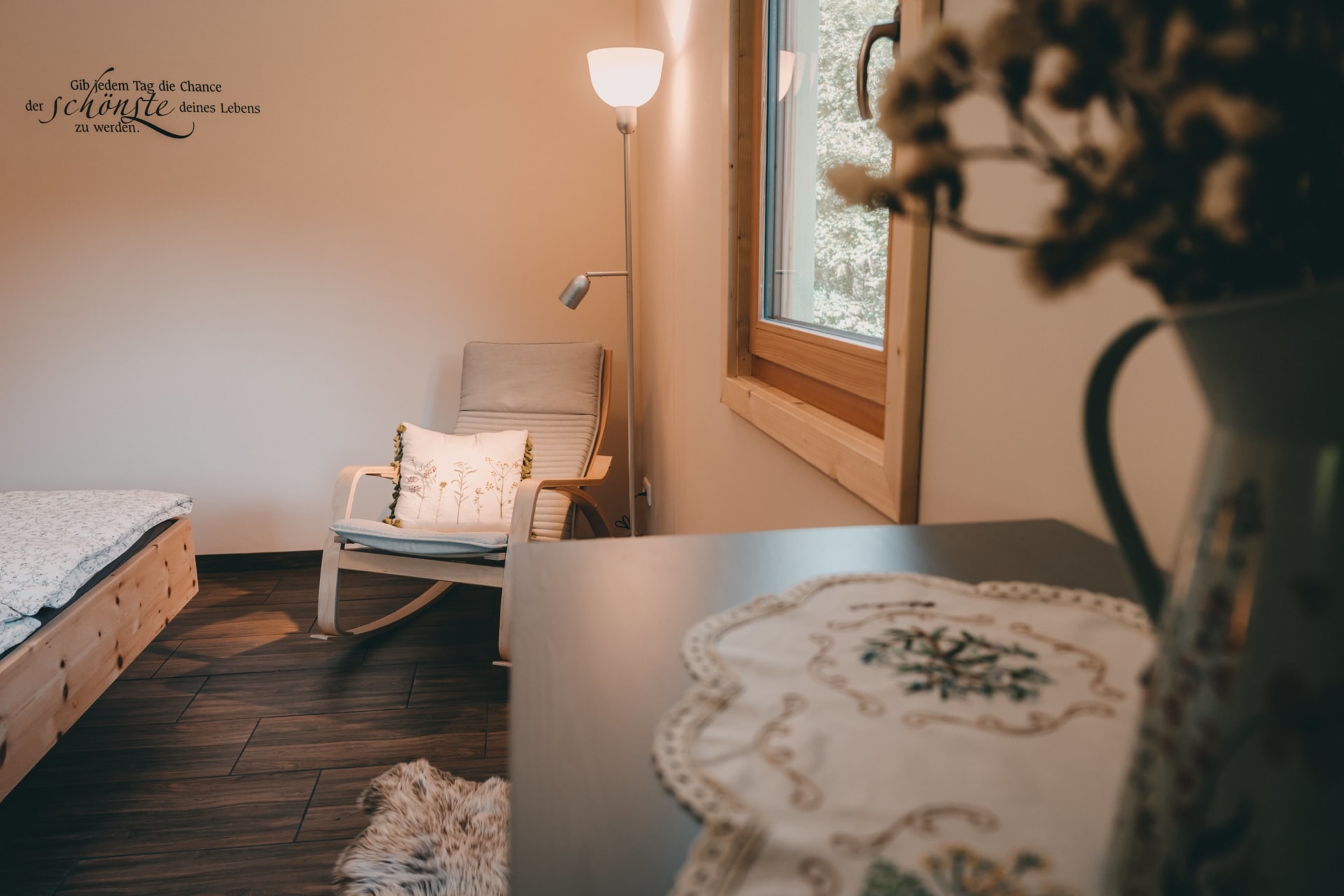 • Schlafzimmer mit Doppelbett aus Zirbenholz und Schaukelstuhl