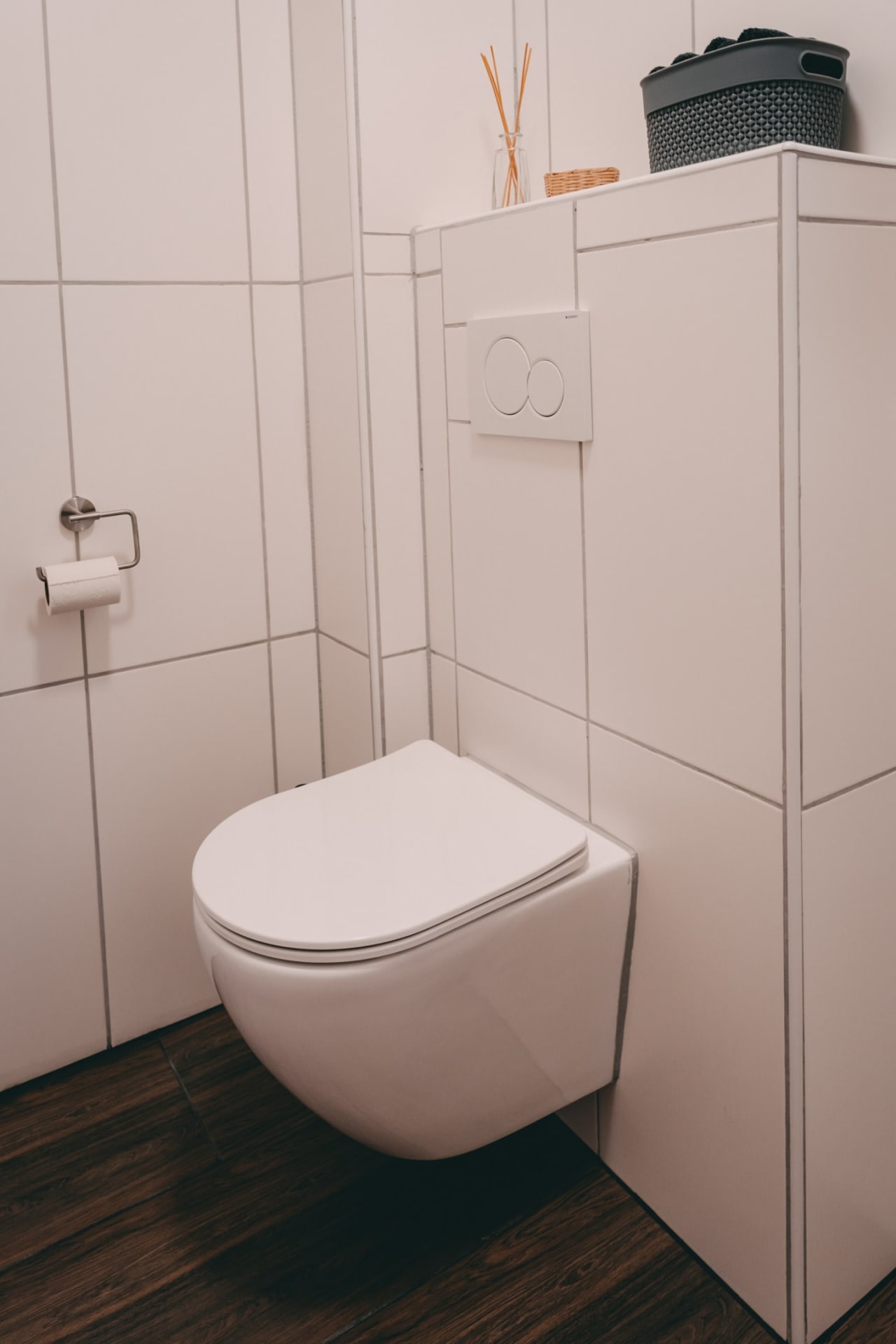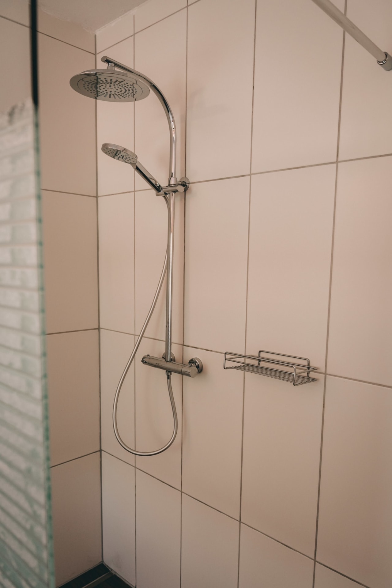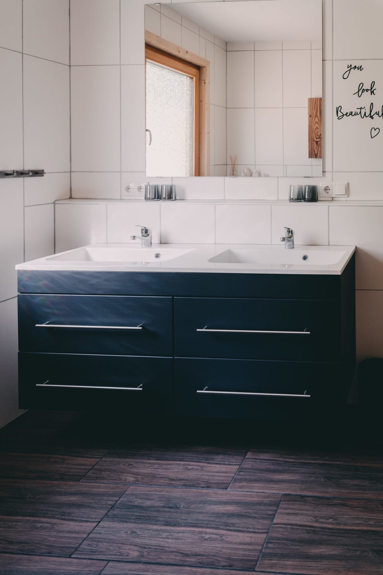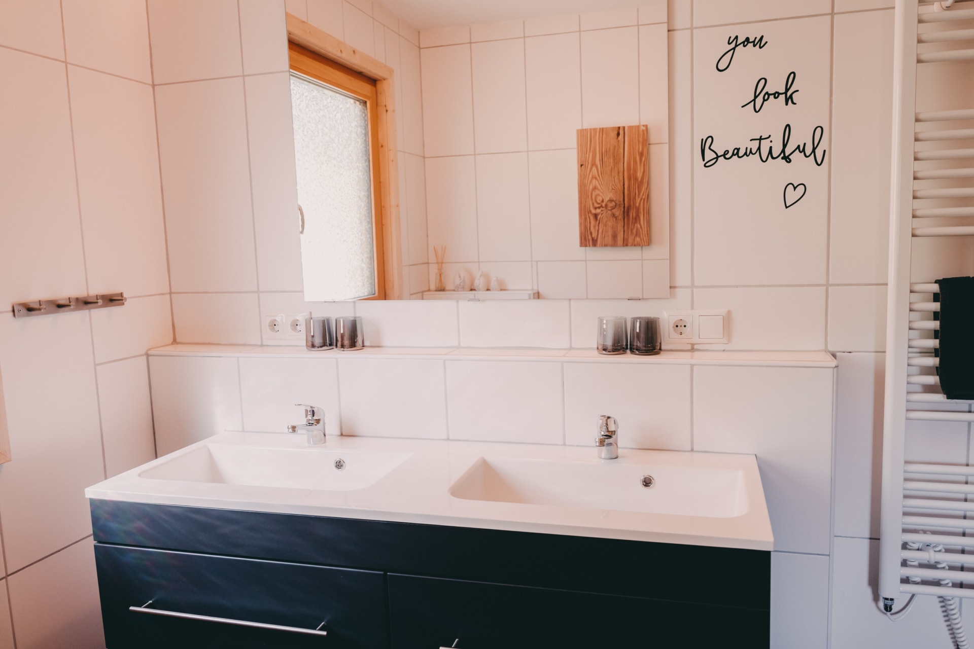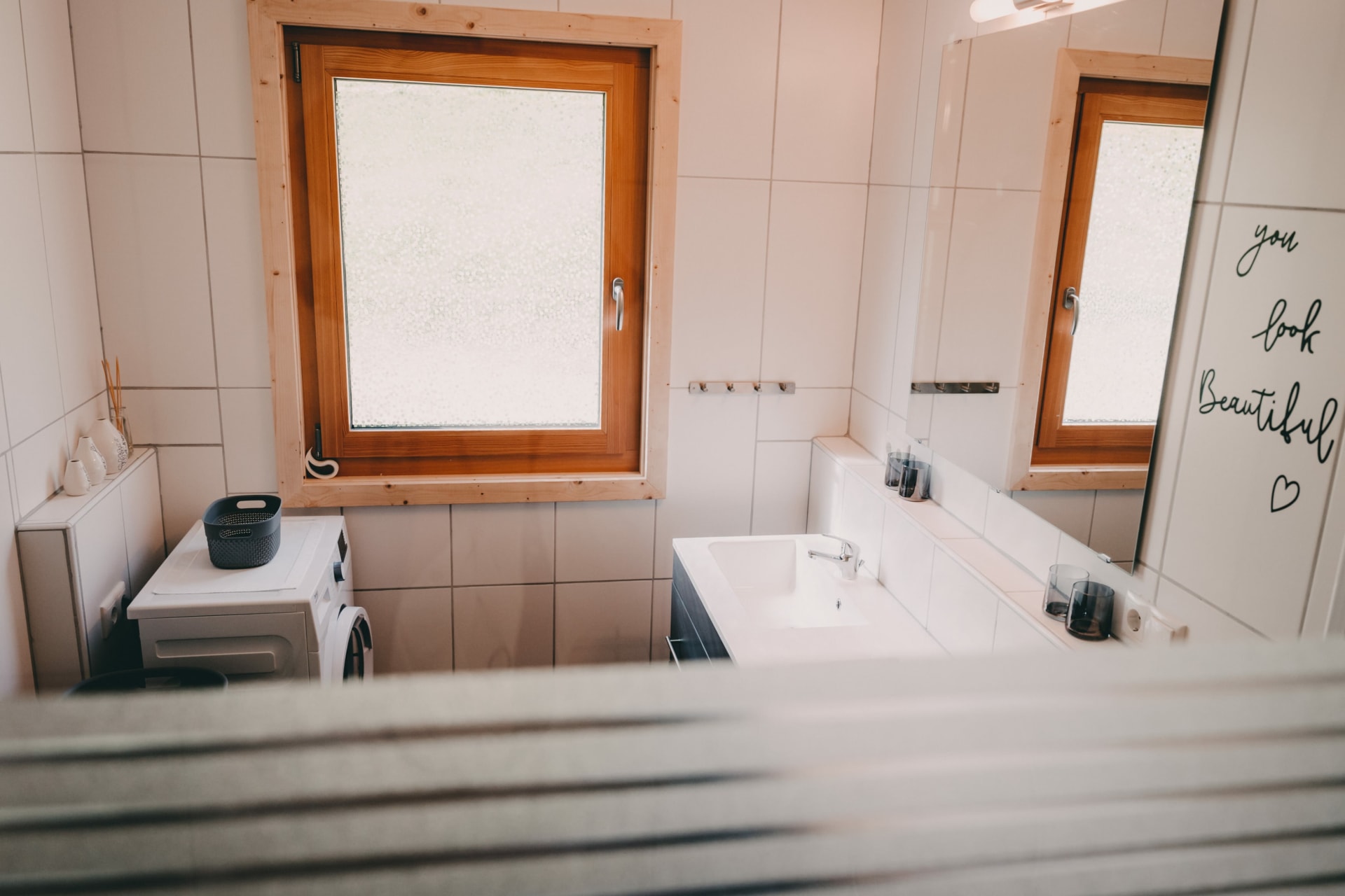• Badezimmer mit geräumiger Dusche, Doppelwaschbecken und Waschmaschine