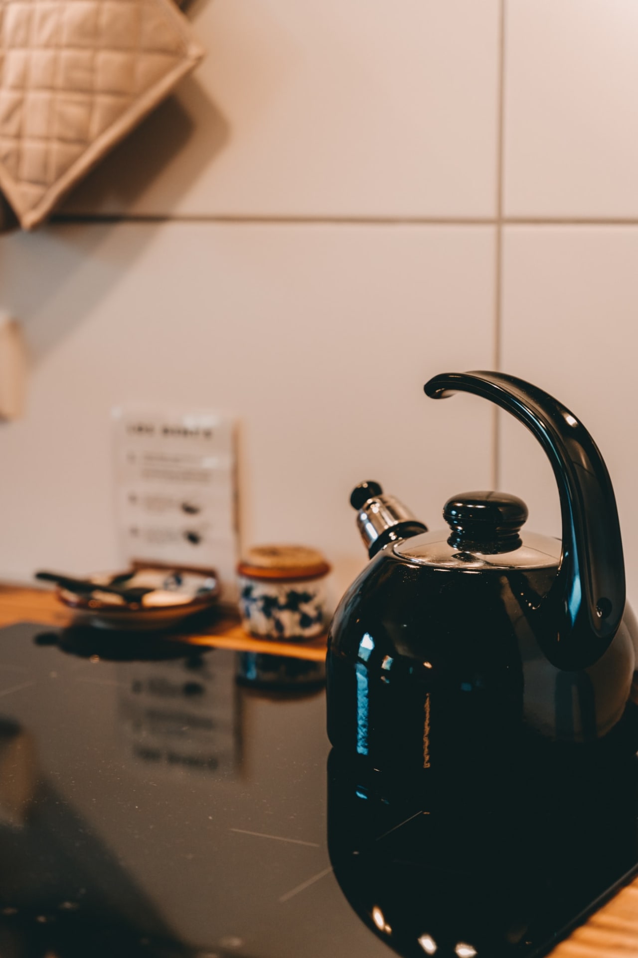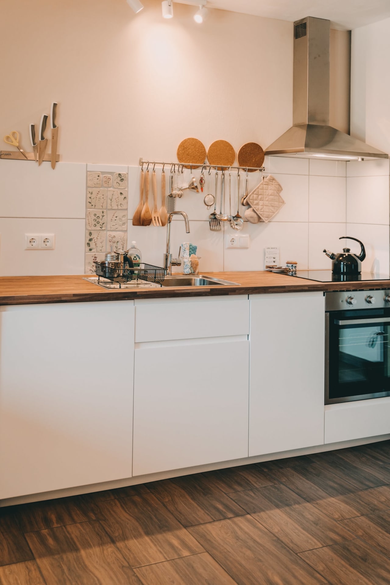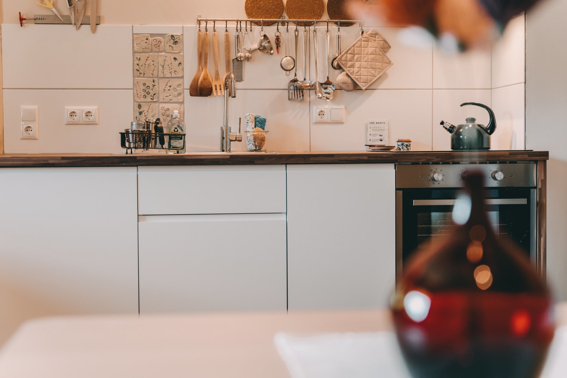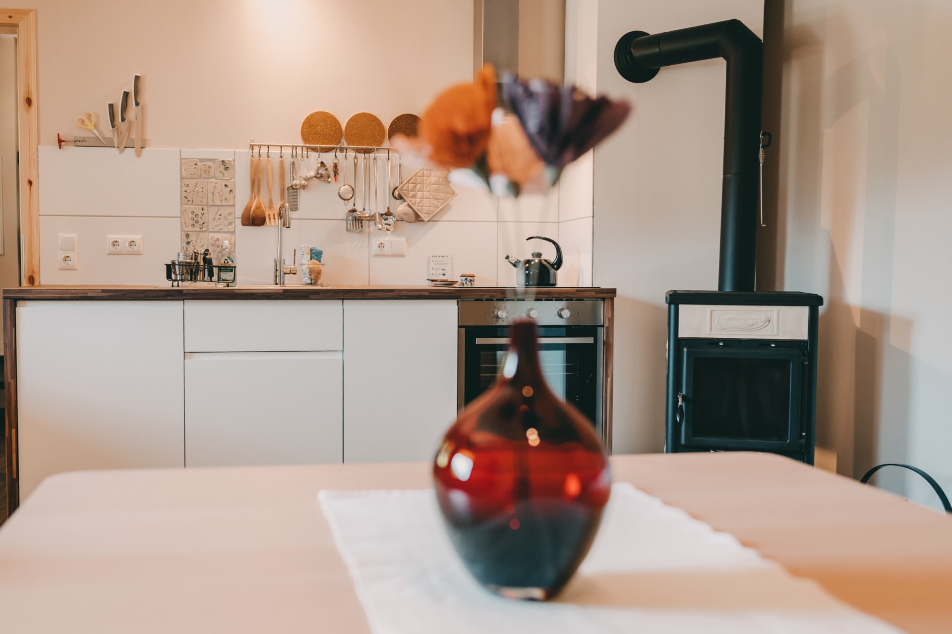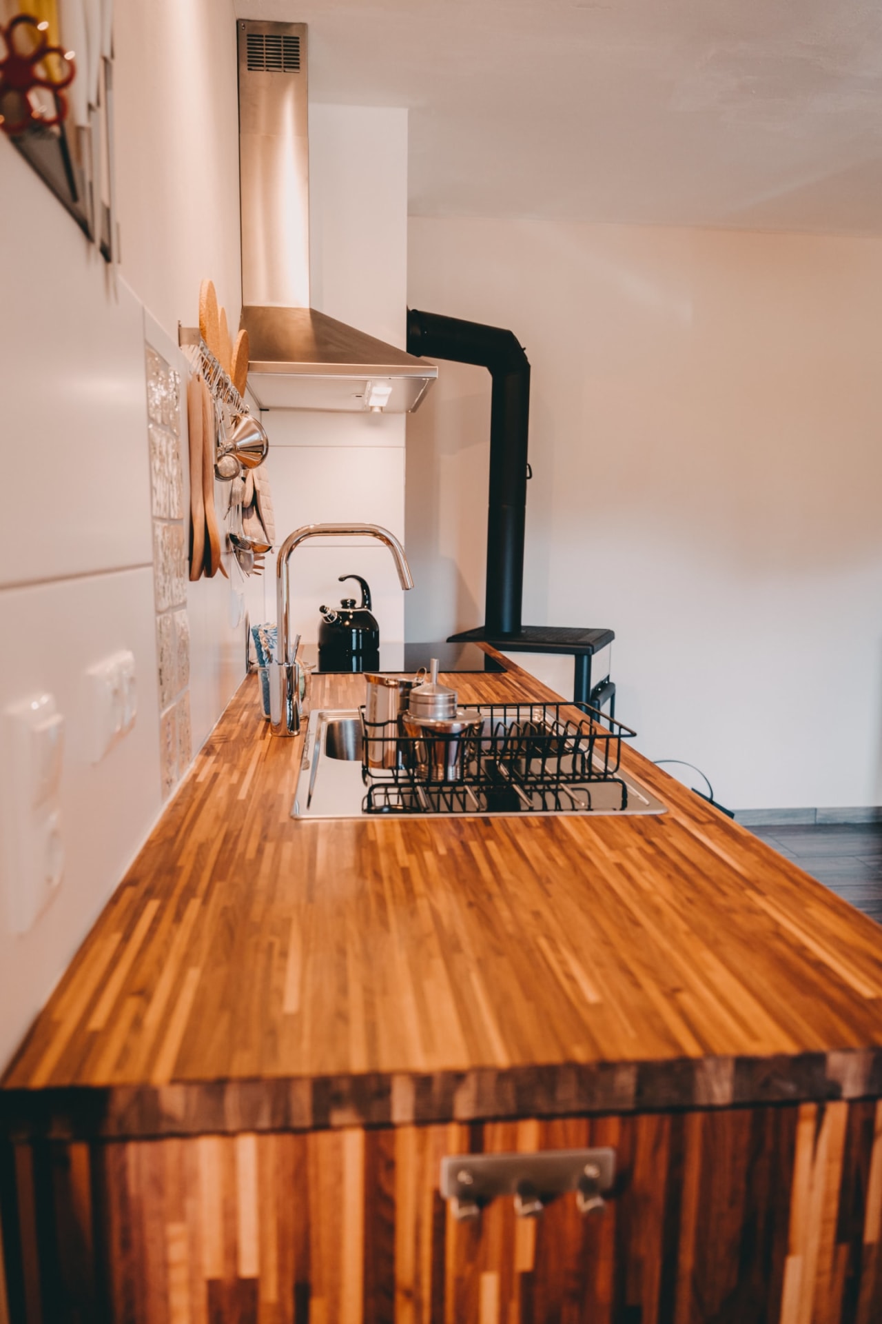 • Voll ausgestattete Wohnküche mit Holzofen, Kühlschrank mit Gefrierfach, Spülmaschine, Induktionskochfeld und Backofen