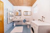 • Badezimmer mit Doppelwaschbecken, Dusche, WC, Waschmaschine