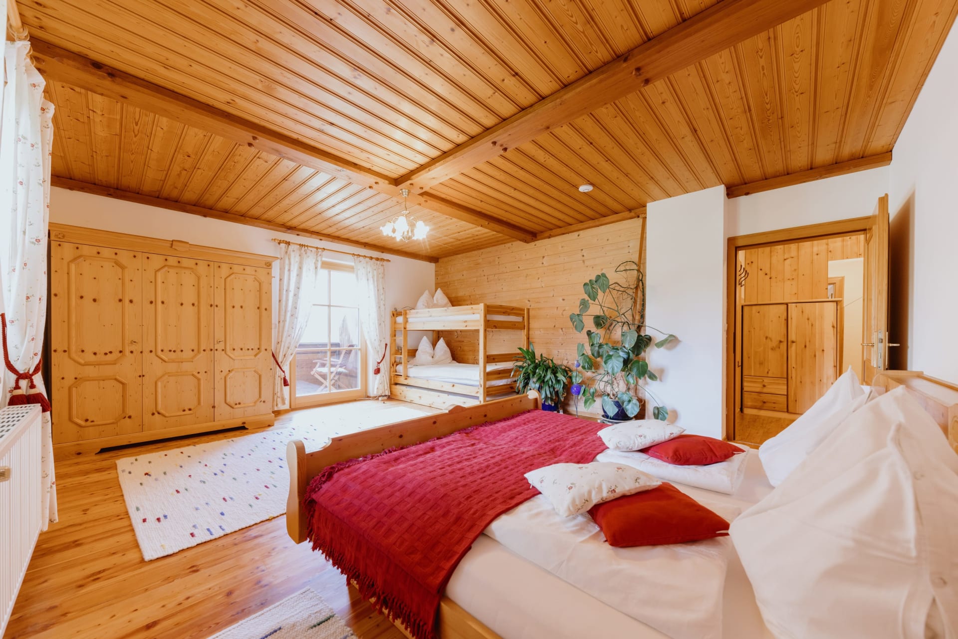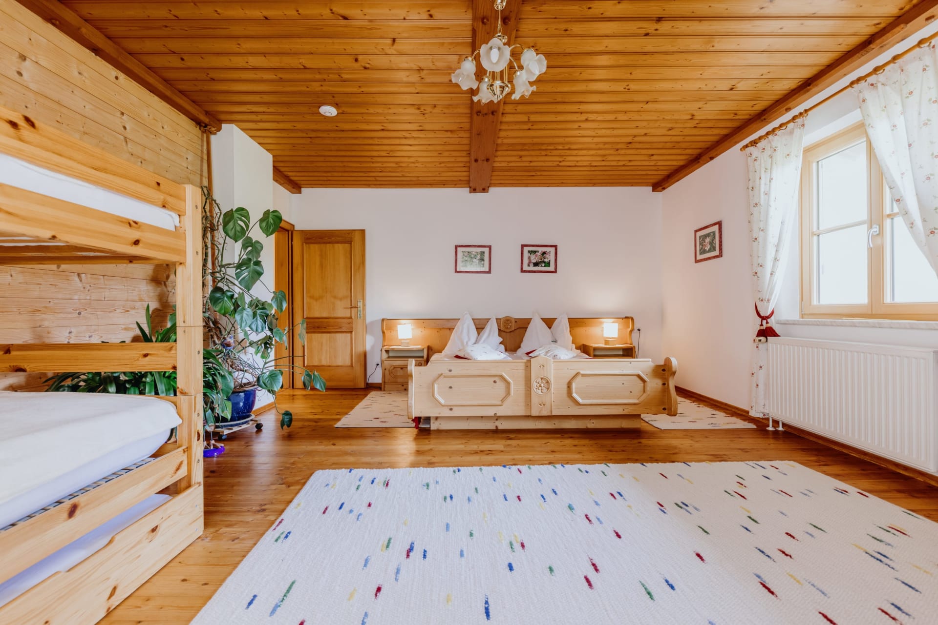 • großes Schlafzimmer mit Doppelbett und Stockbett