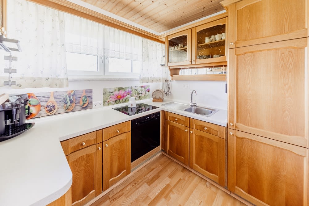 Die Wohnung ist gemütlich mit viel Holz eingerichtet. Es gibt viele Vollholzmöbel, selbst verlegten Holzboden, Geschirrspüler, Waschmaschine, Kaffeevollautomat, Backofen, Kühlschrank mit Gefrierfach.