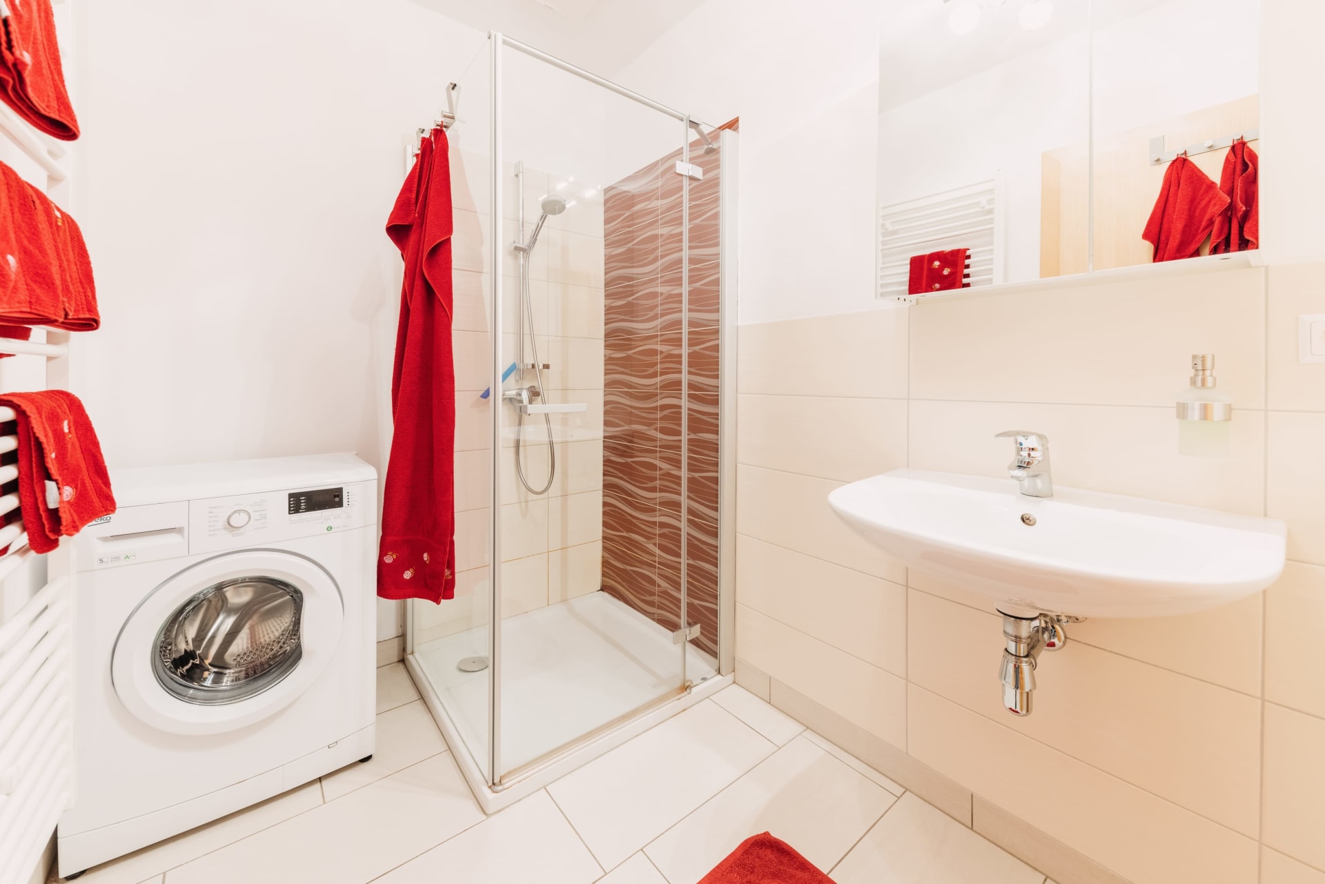 • ein Badezimmer mit Dusche und Waschmaschine