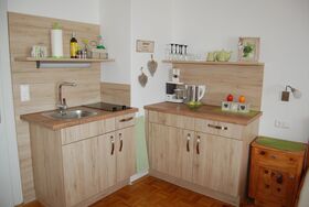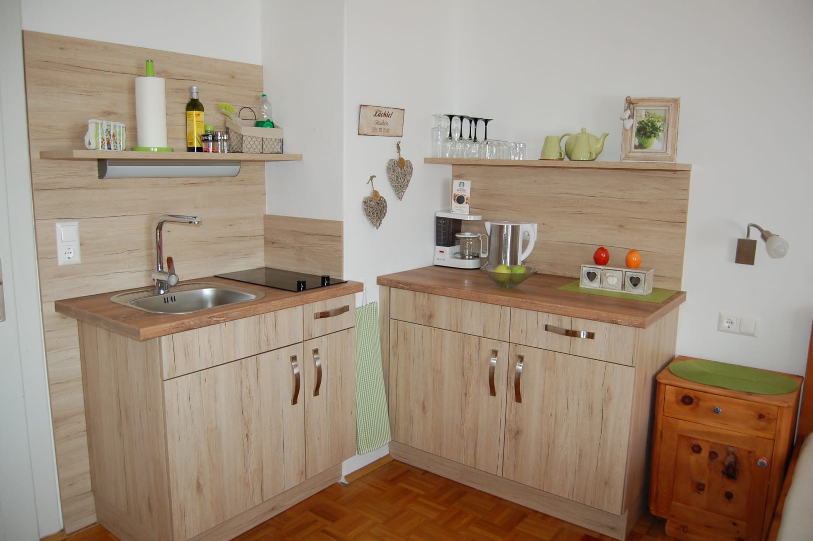 Unser Studio besteht aus Kochnische mit 2 Kochplatten, Gefrierschrank, Kaffeemaschine, Wasserkocher, Toaster, Ausziehcouch, Essplatz