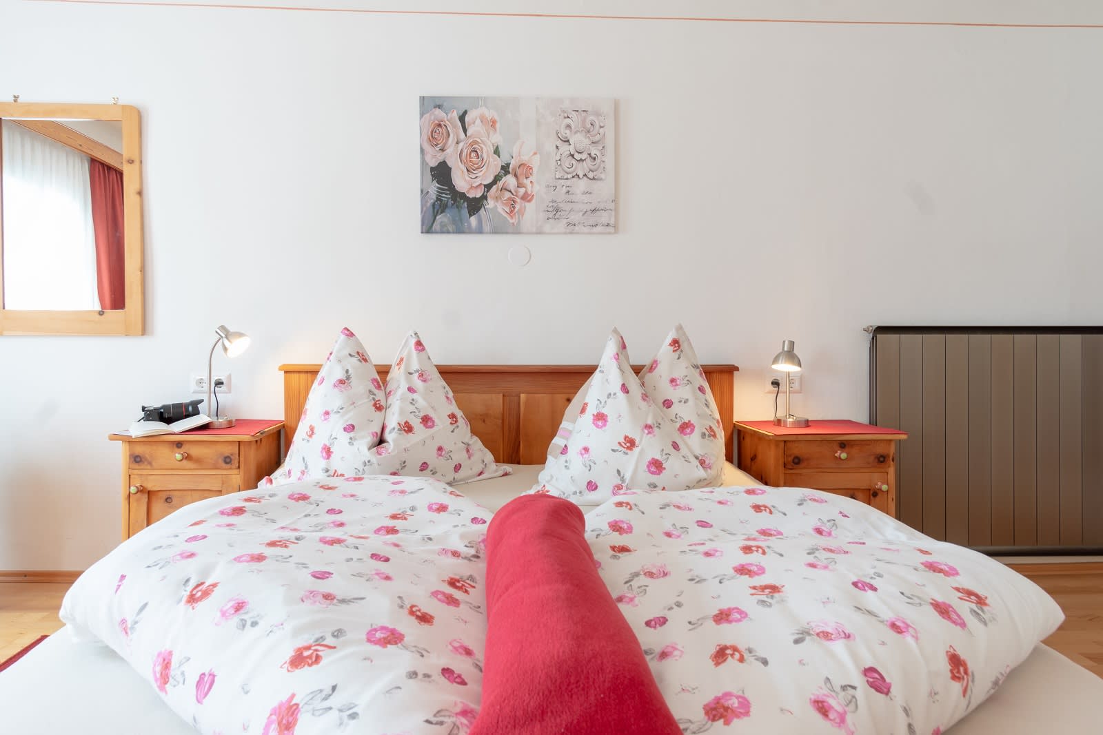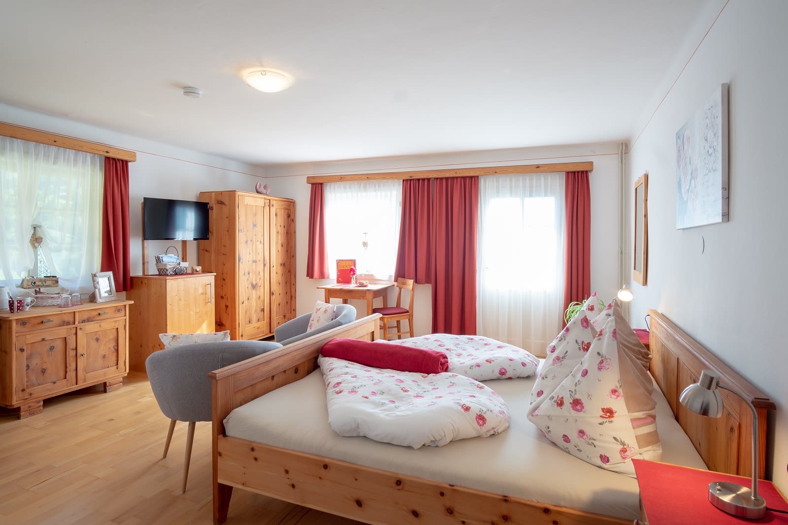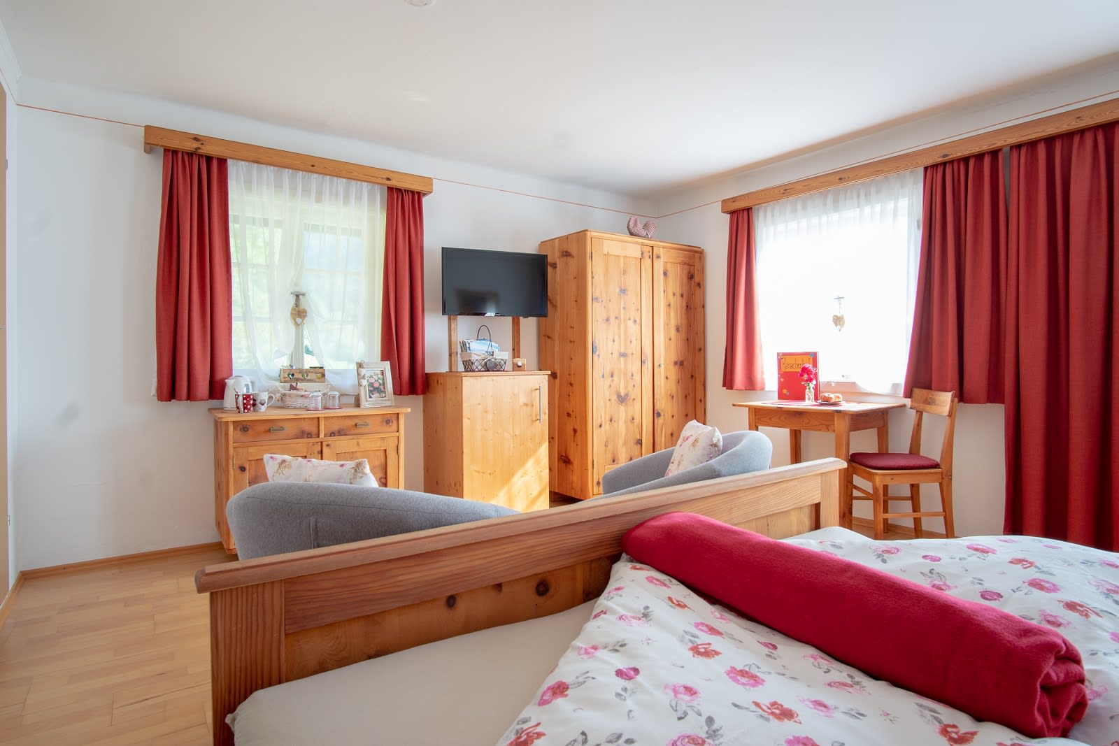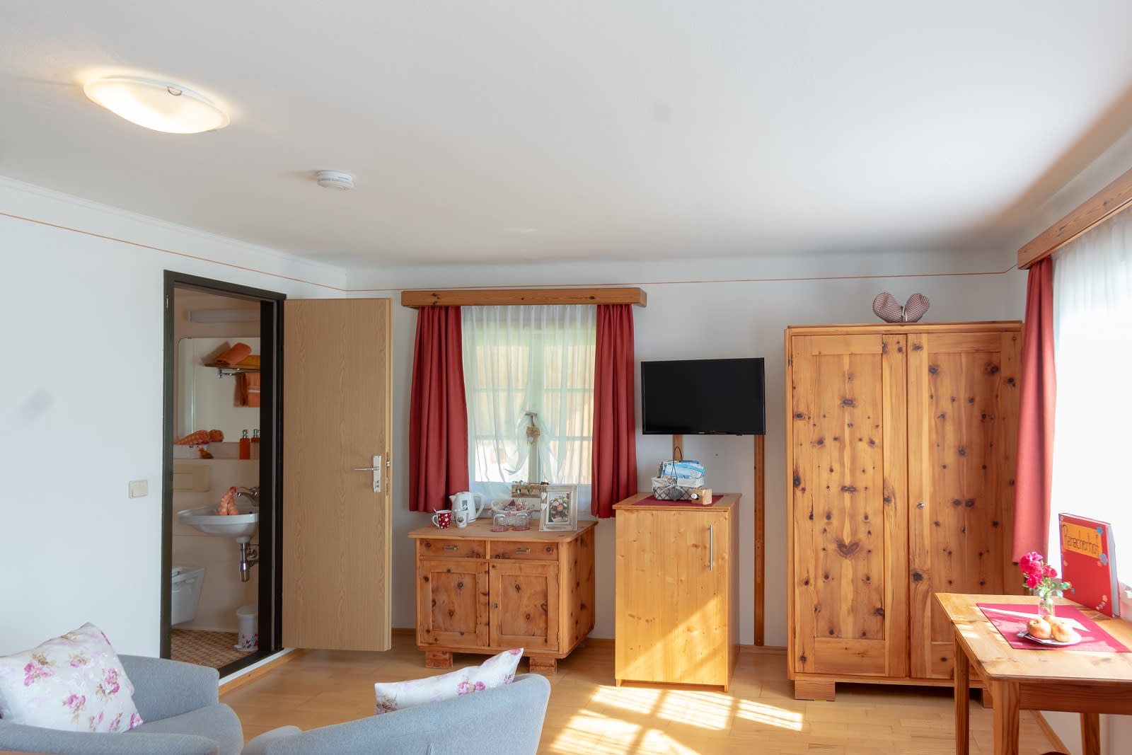 Unser Wohlfühlzimmer mit Zirbenholzeinrichtung für einen wohlverdienten gesunden Schlaf, Kühlschrank, kleiner Teebar mit Wasserkocher, verschiedene Teesorten, Teehäferln, Sat-TV, Dusche/WC, Balkon mit einer wunderschönen Aussicht ins Tal.