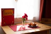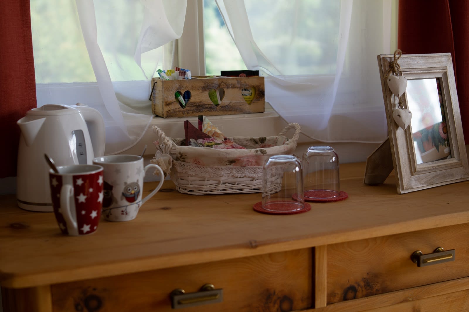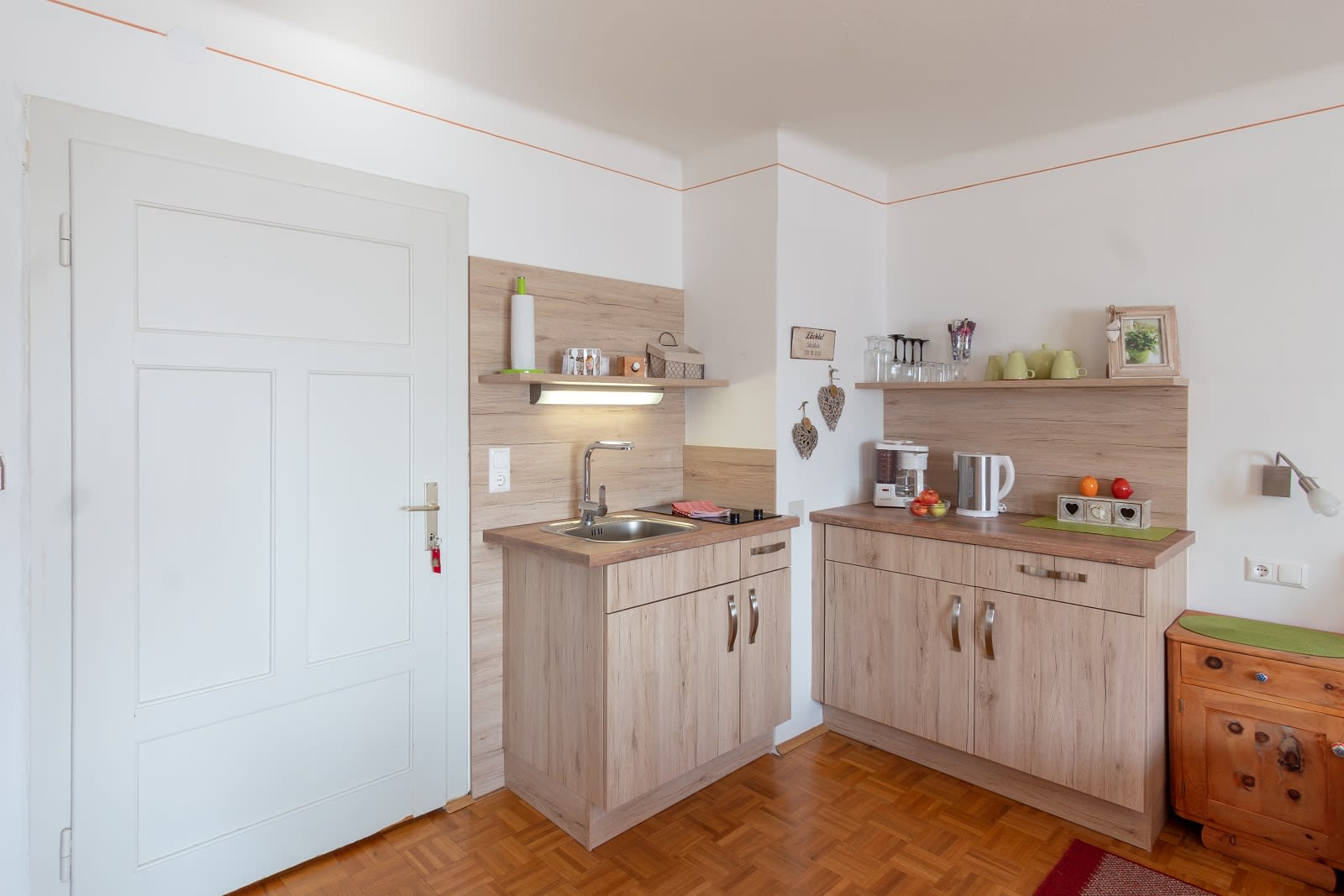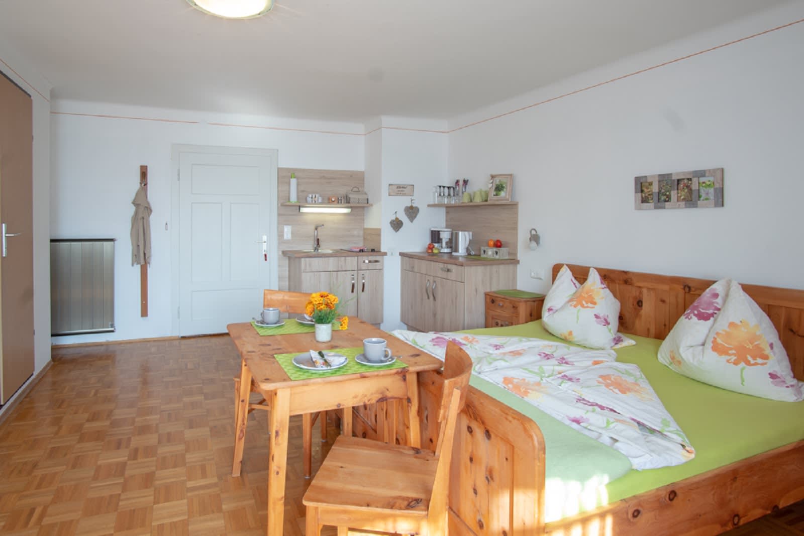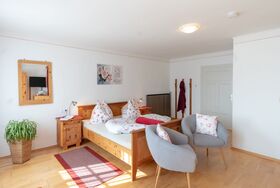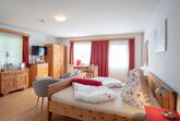 Unser Wohlfühlzimmer mit Zirbenholzeinrichtung für einen wohlverdienten gesunden Schlaf, Kühlschrank, kleiner Teebar mit Wasserkocher, verschiedene Teesorten, Teehäferln, Sat-TV, Dusche/WC, Balkon mit einer wunderschönen Aussicht ins Tal.