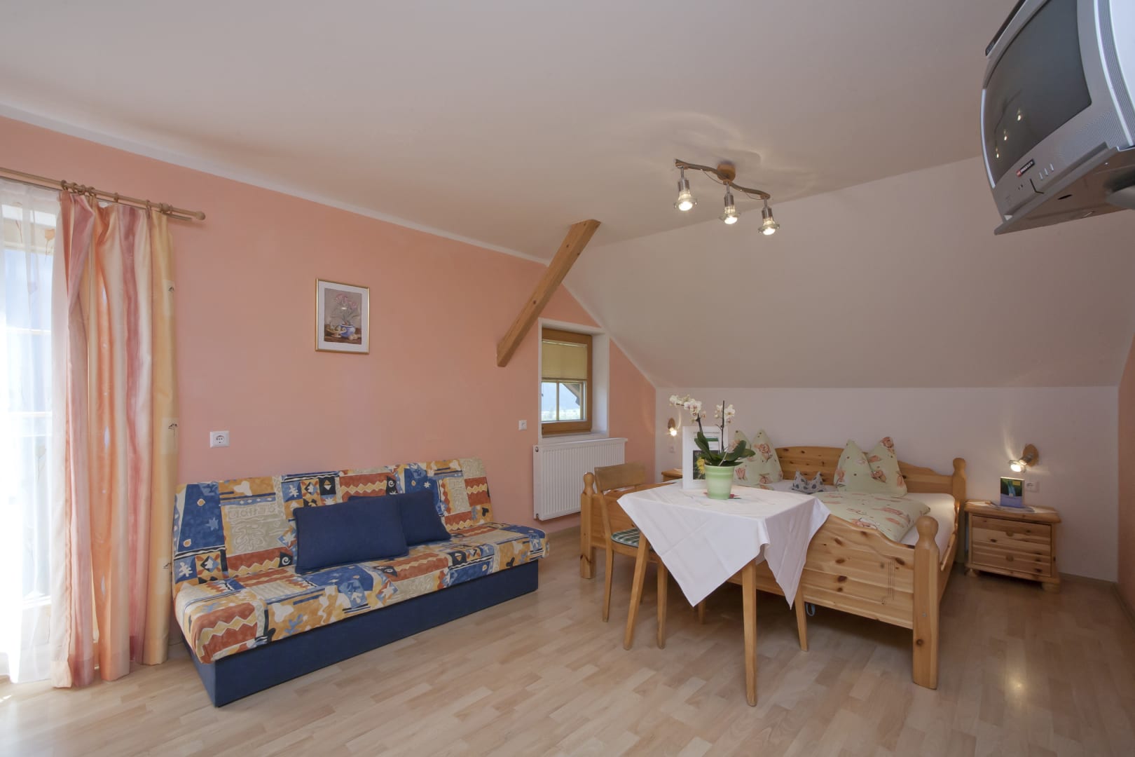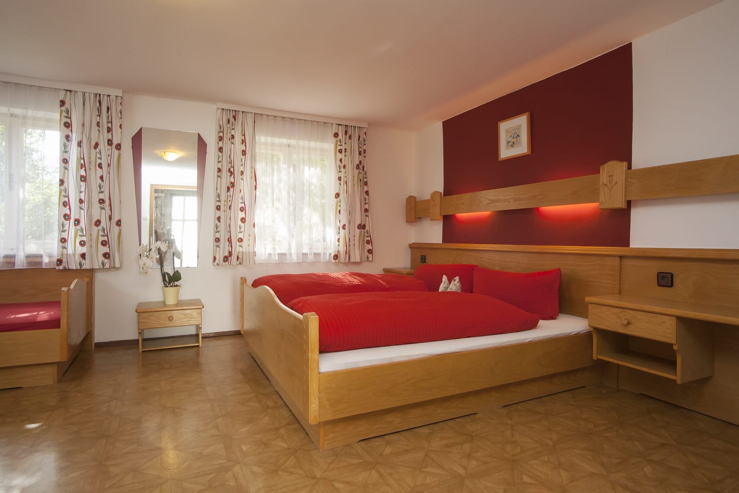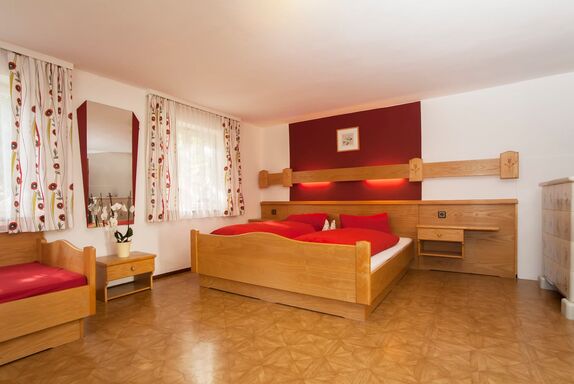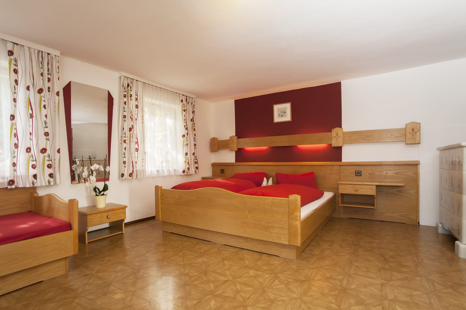 Unsere Familienzimmer sind hell, geräumig und mit Vollholzmöbeln ausgestattet. Sie verfügen über zwei Schlafräumen, Dusche/WC, Fön, SAT-TV und teilweise Balkon.