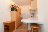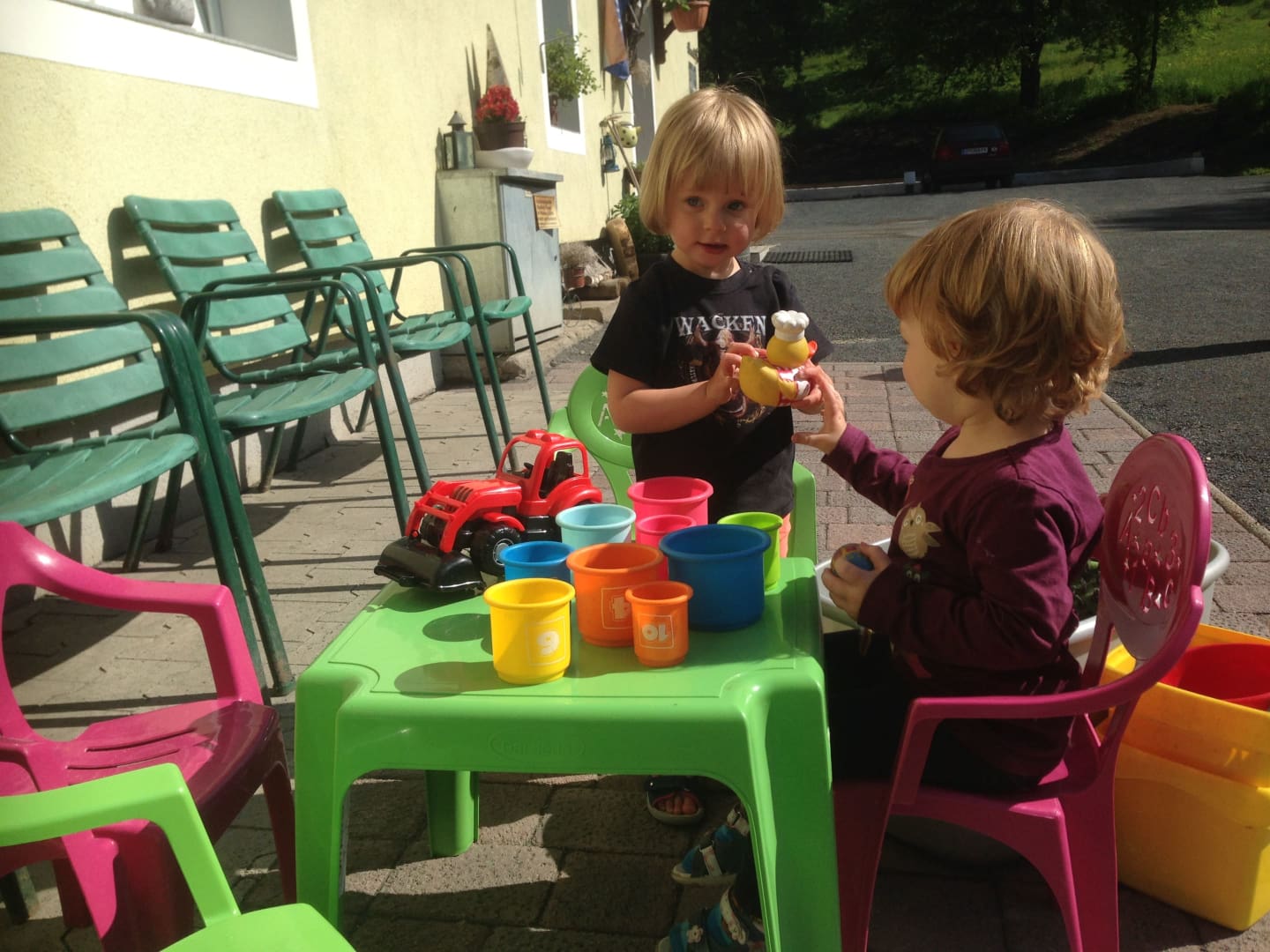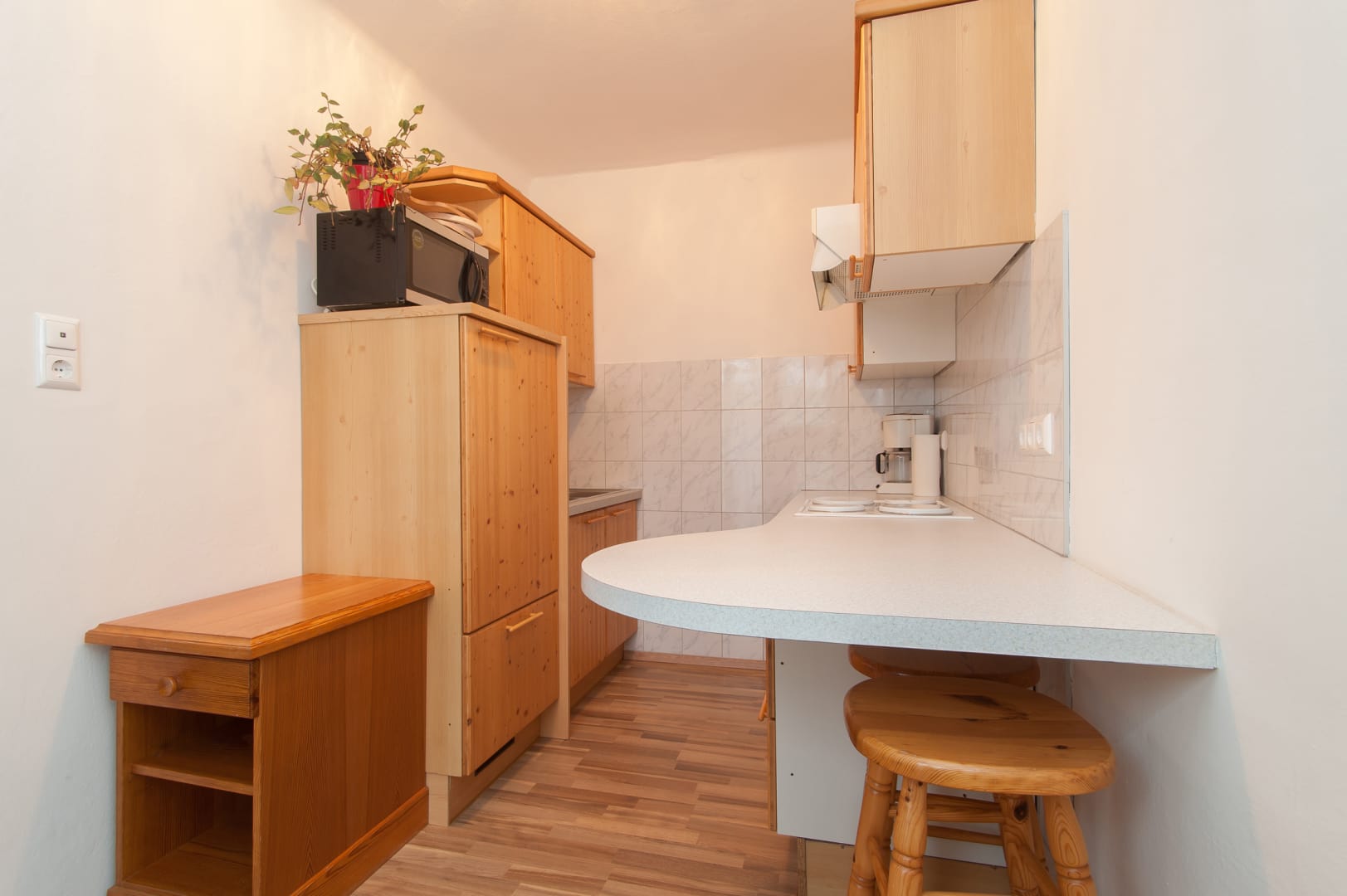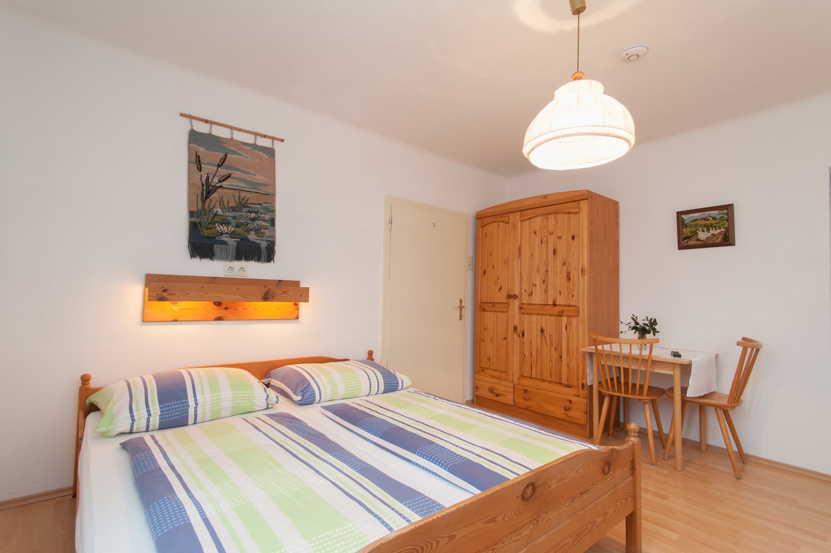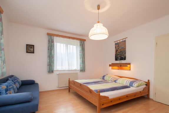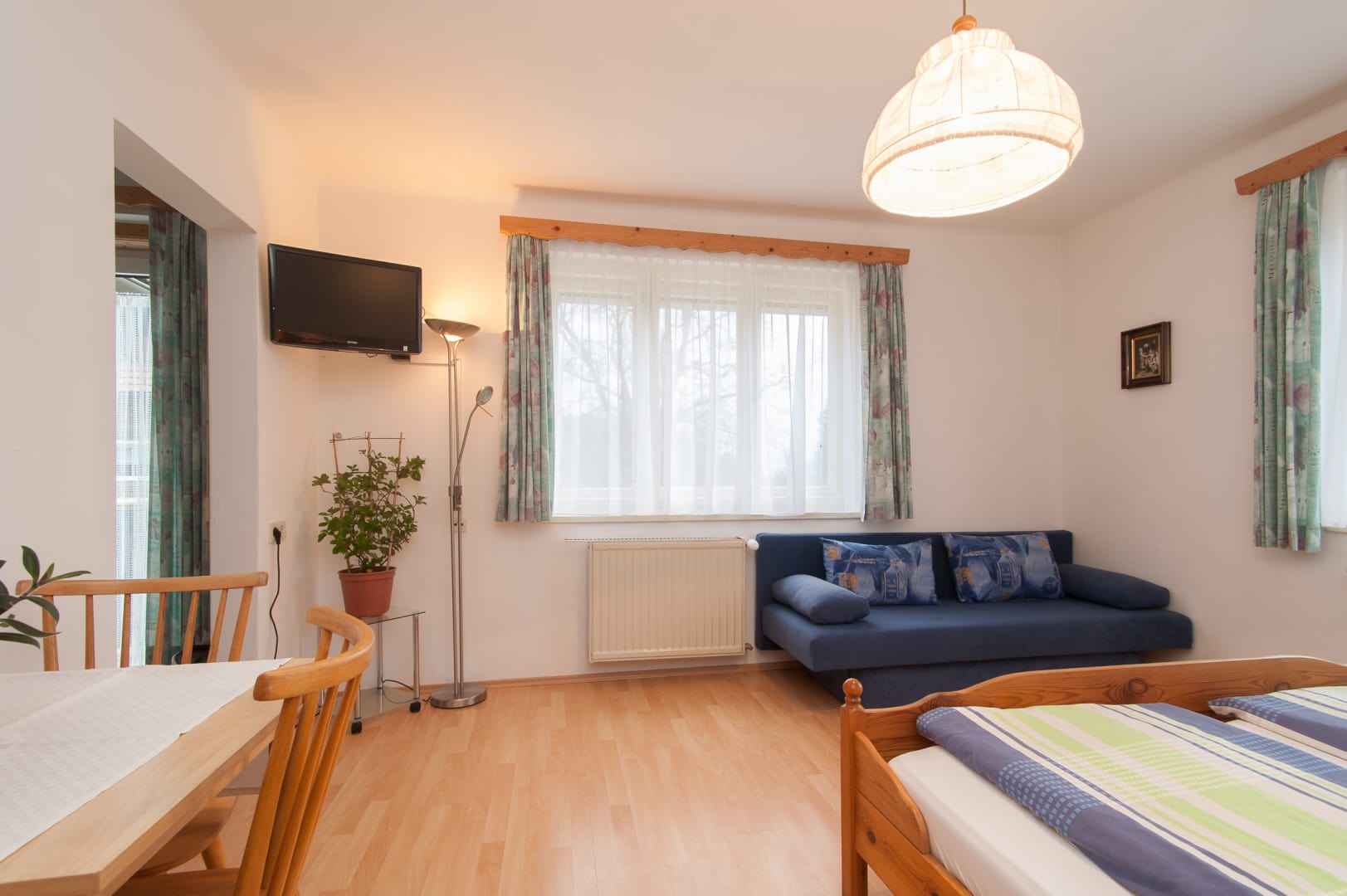 Diese Ferienwohnung im Nebengebäude im 1.Stock ist mit einer Ausziehcouch ideal für eine 3köpfige Famlie und hat mit ihren kleinen Balkon perfekte Übersicht über den Gastgarten und Teile des Hofes.