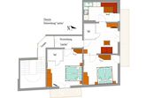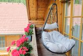 70 m2 Wohnfläche im 2. Stock laden ein zum Wohlfühlen. Die Ferienwohnung bietet Platz für 2 bis 4 Personen und ist ausgestattet mit Fichtenholzmöbeln, kleine Wohnküche mit Kühlschrank, Mikrowelle, Kaffeemaschine, Wasserkocher, E-Herd mit Backrohr, Geschirrspüler, extra Wohnzimmer mit gemütlicher Sitz-Couch, Flachbildschirm mit SAT-TV, Radio, gratis W-LAN, 2 getrennte Doppelbettzimmer mit eigener Dusche und WC, Fön, 2 Balkone mit Sitzgelegenheit und Hängesessel.