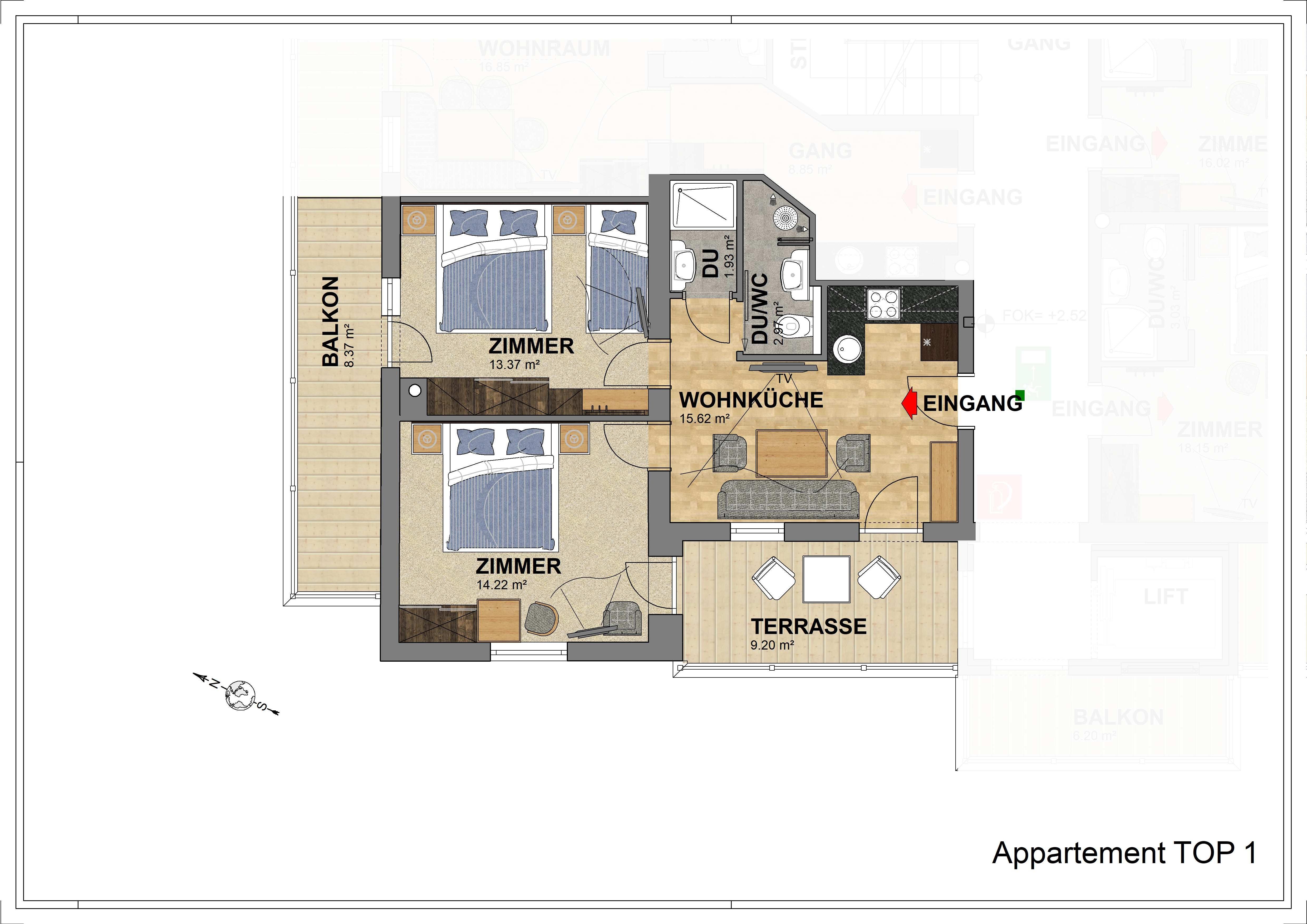 Appartement Top 1 im 1. Stock mit 2 getrennten Schlafzimmern (1x Doppelbett mit Zustellcouch, 1 x Doppelbett mit Enzelbett), 1 x Badezimmer mit Dusche/WC, 1 x Badezimmer mit Dusche - jeweils mit Haarföhn, 1 vollausgestattete Wohnküche mit Essbereich, Ceran-Kochfeld, Geschirrspüler, Kühlschrank, Mikrowelle uvm., Kabel-TV, Radio und Balkon. Größe: ca. 58 m².