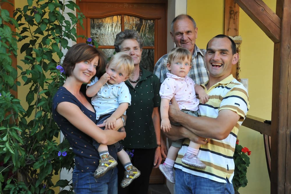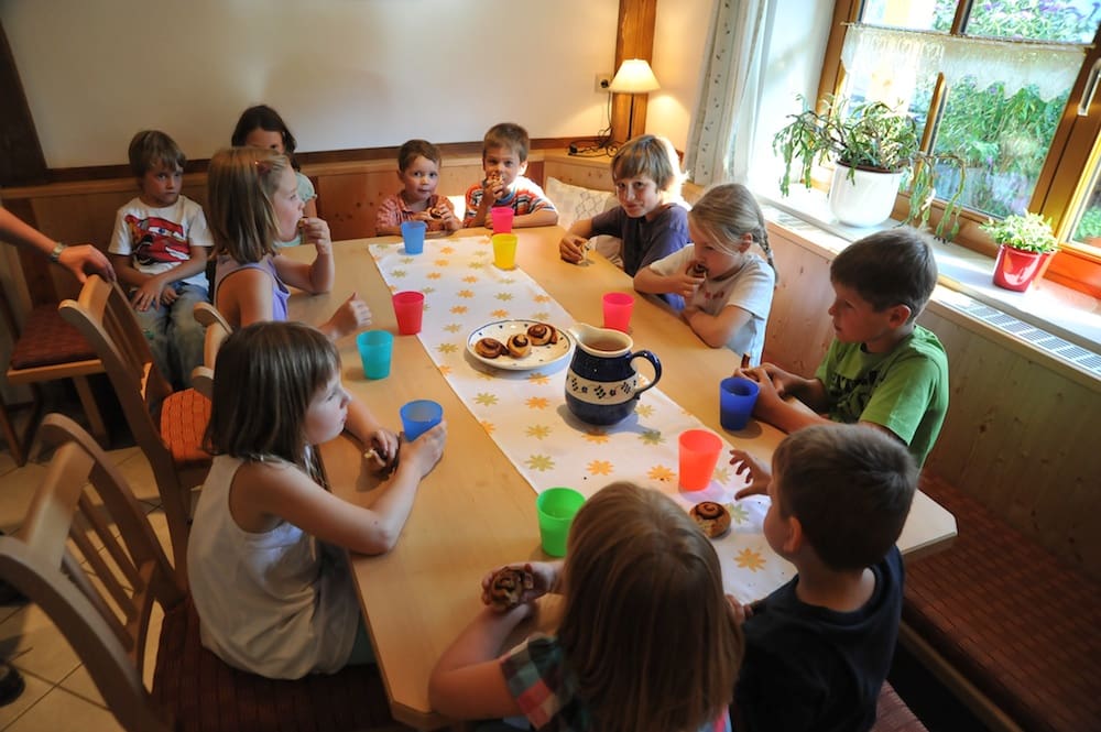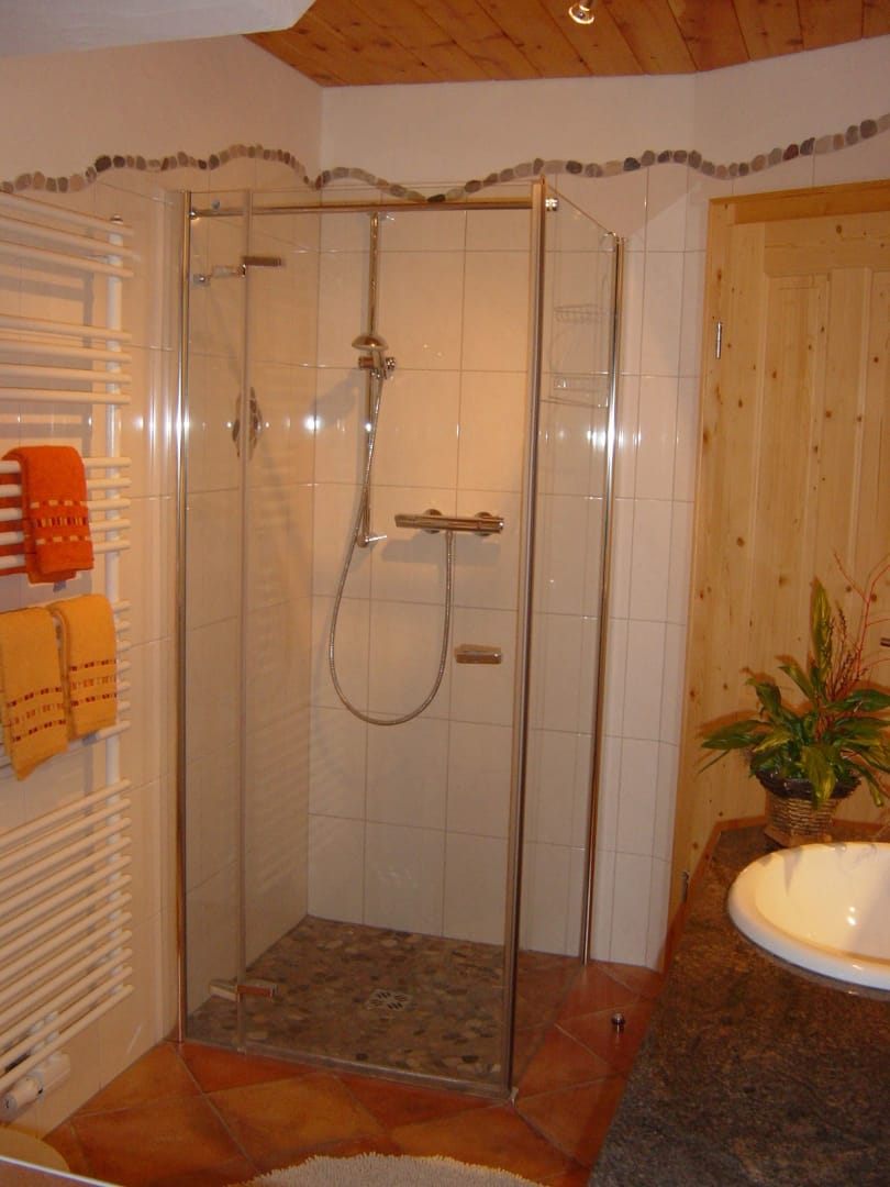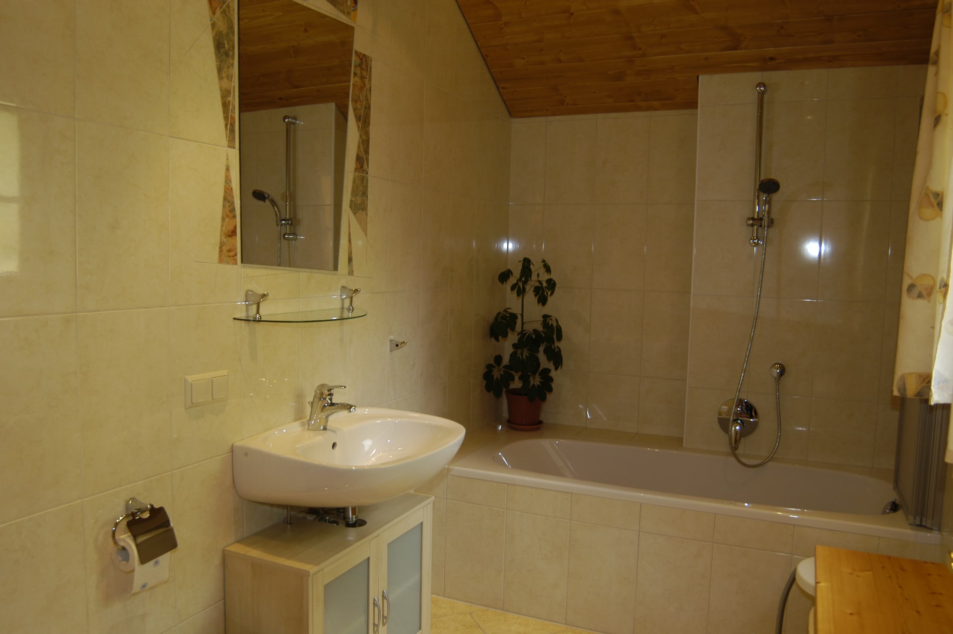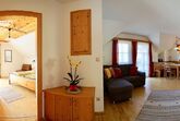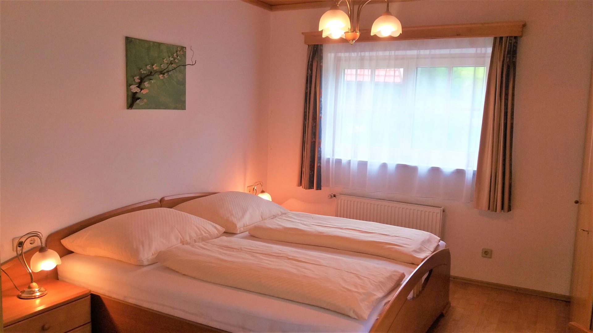 Ferienwohnung mit 70 m²: Wohnraum mit voll ausgestatteter Küche, Couch, TV, Stereoanlage, Elternschlafzimmer mit Zirbenholz-Einrichtung *), Kinderschlafzimmer, Dusche/WC und 2 x Balkon