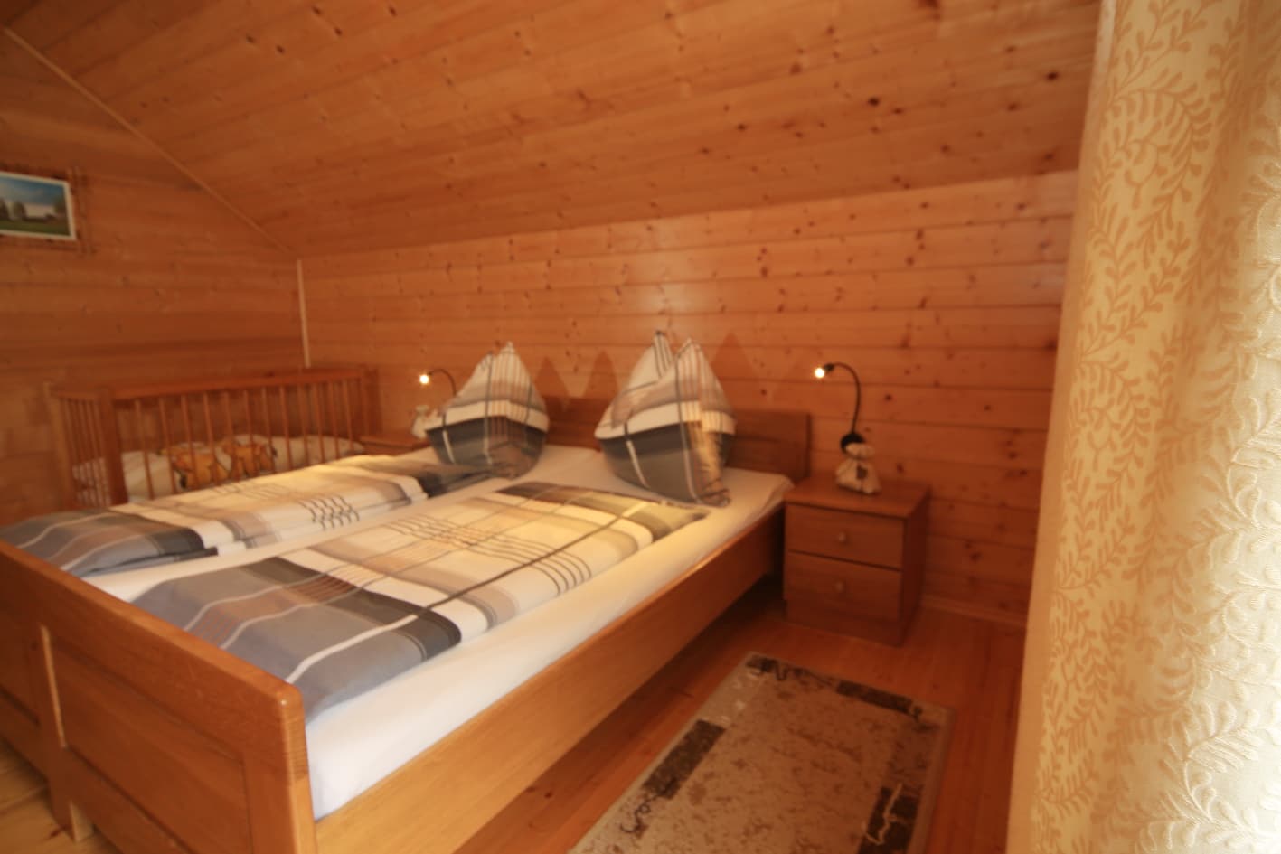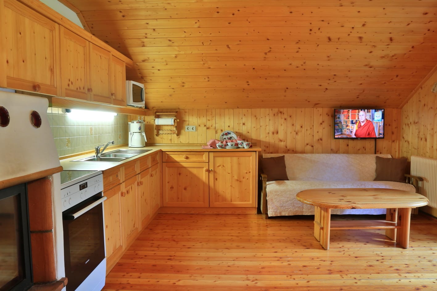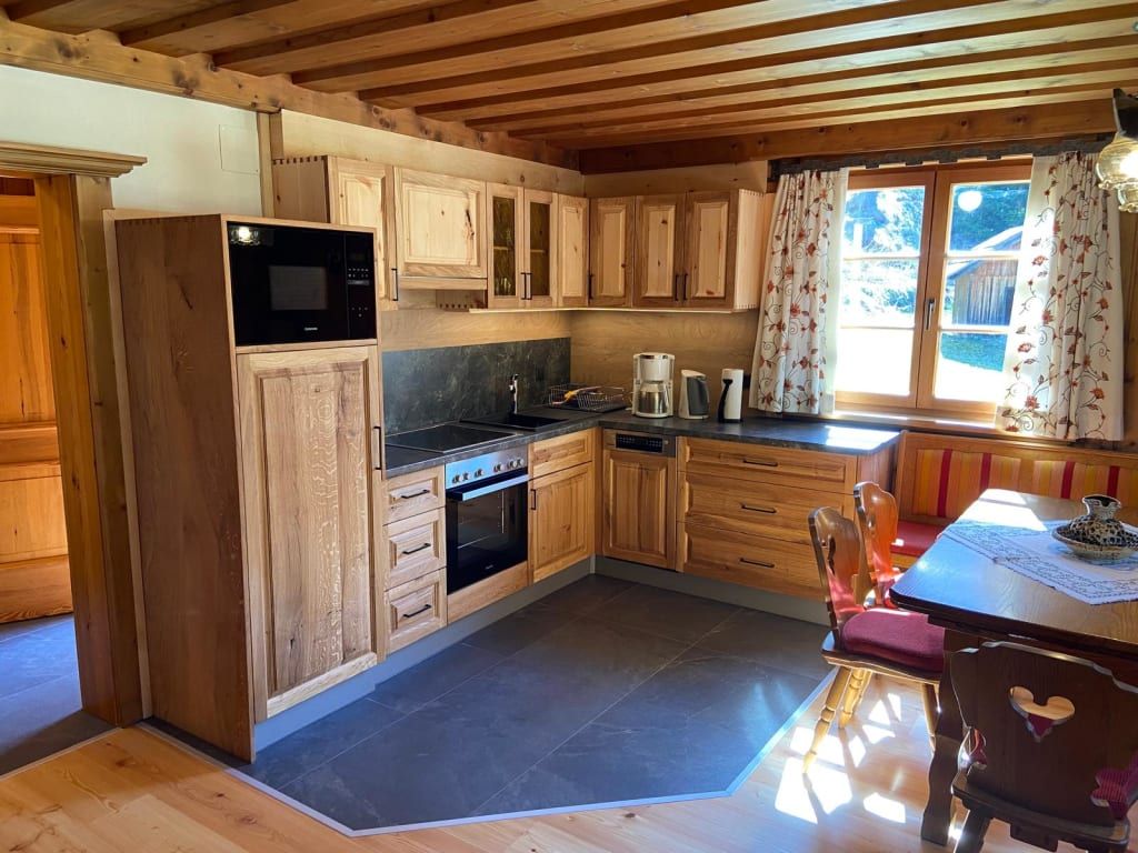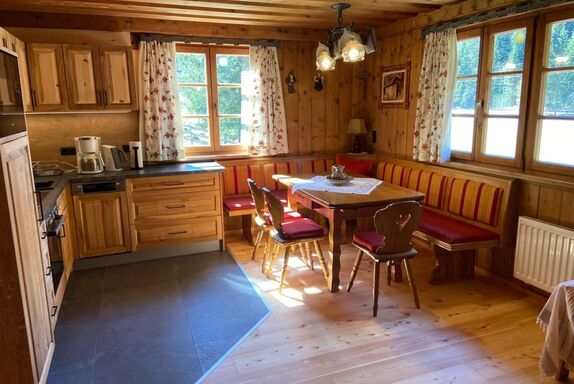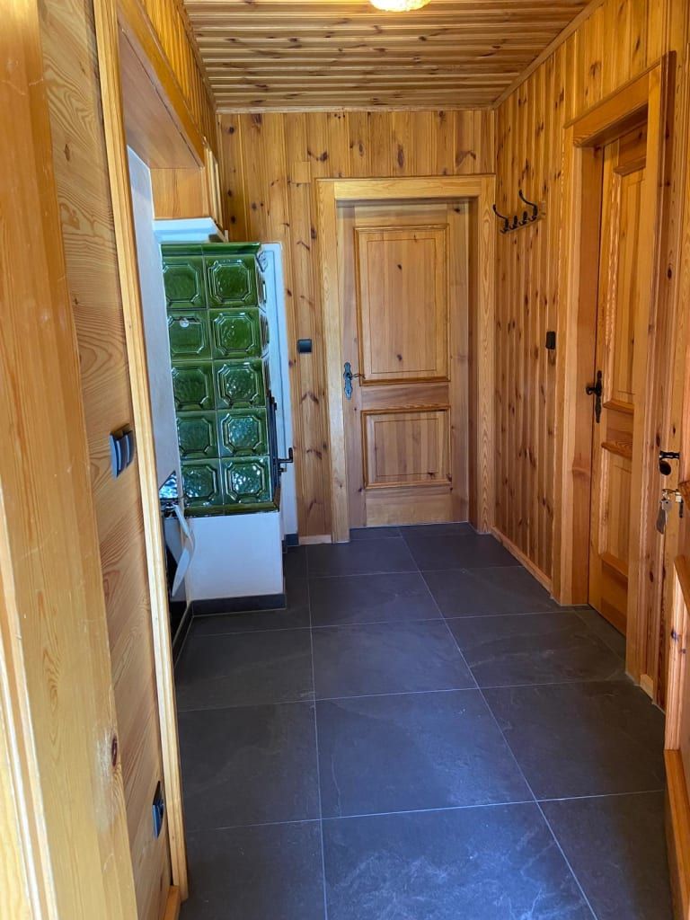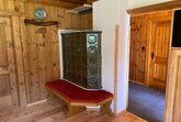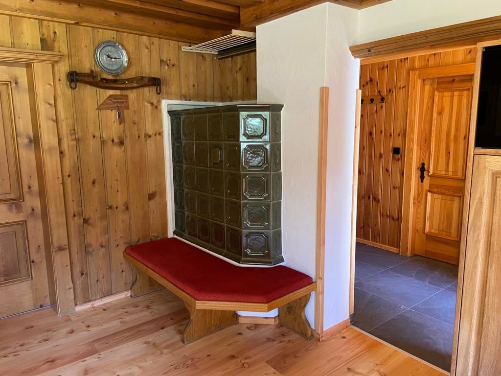 2 Doppelbettzimmer, Wohnküche mit Kachelofen, Kochecke, E-Herd, Mikrowelle, Geschirrspüler, Dusche mit WC, Vorratsraum, Sauna im Keller, Waschmaschine, Gitterbett, Wickeltisch, Hochstuhl, baby- und kindersicher, Hand- und Saunatücher, Bettwäsche, 60 m2 Wohnfläche, SAT-TV, freies WLAN