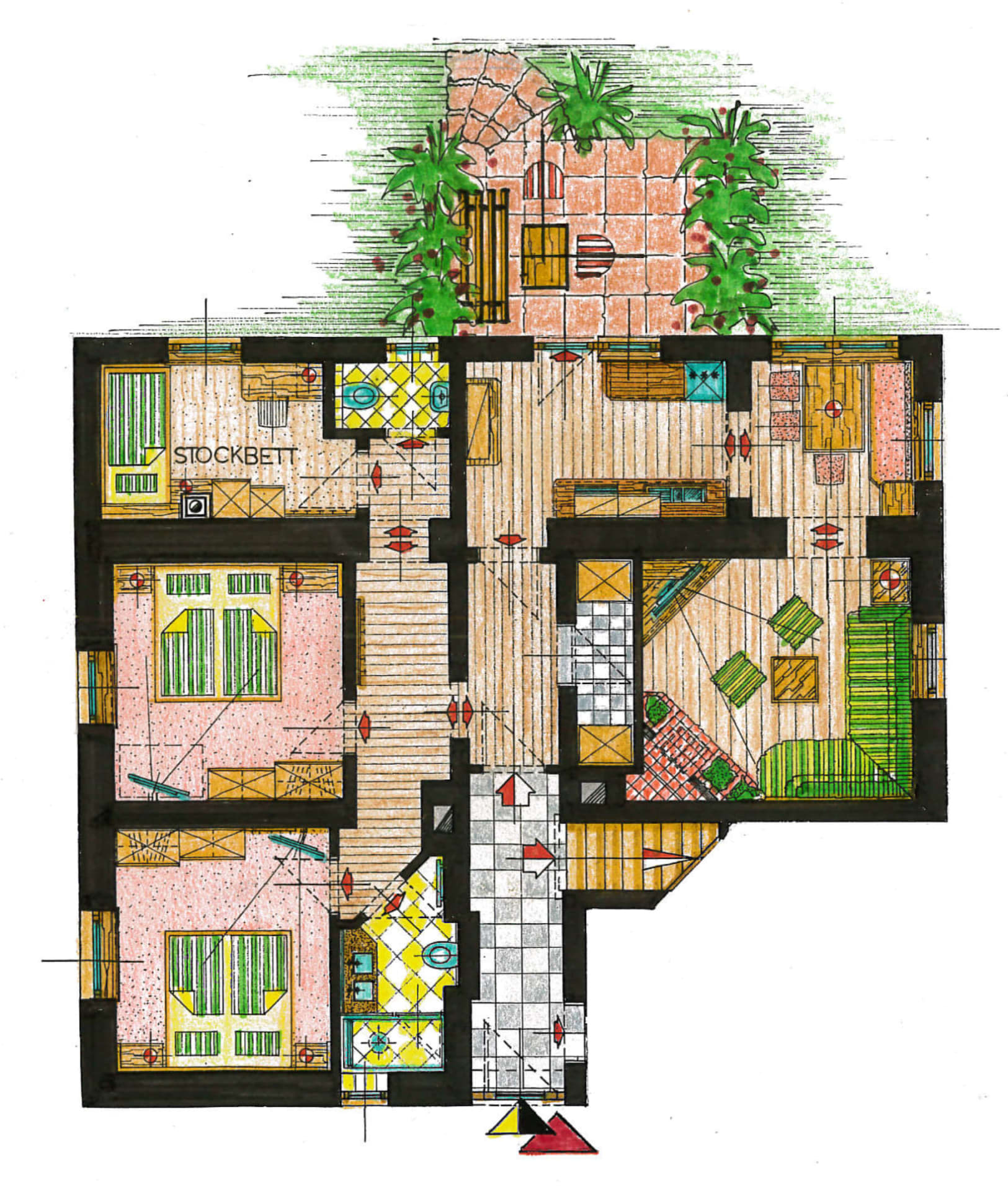 Smileys Chalet Wohnung Äsche besteht aus zwei Doppelzimmern und einem Zimmer mit Stockbett, Wohnzimmer Küche und Essbereich, Badezimmer mit WC und ein separates WC.