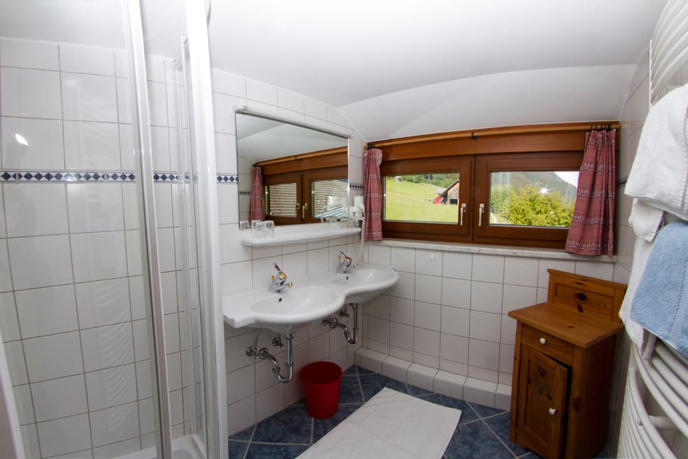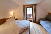 Obergeschoss: 1 Doppelzimmer mit Balkon zum See mit Zustellbett, 1 Doppelzimmer Richtung Wald, Badezimmer mit Dusche, Doppelwaschbecken, WC getrennt.