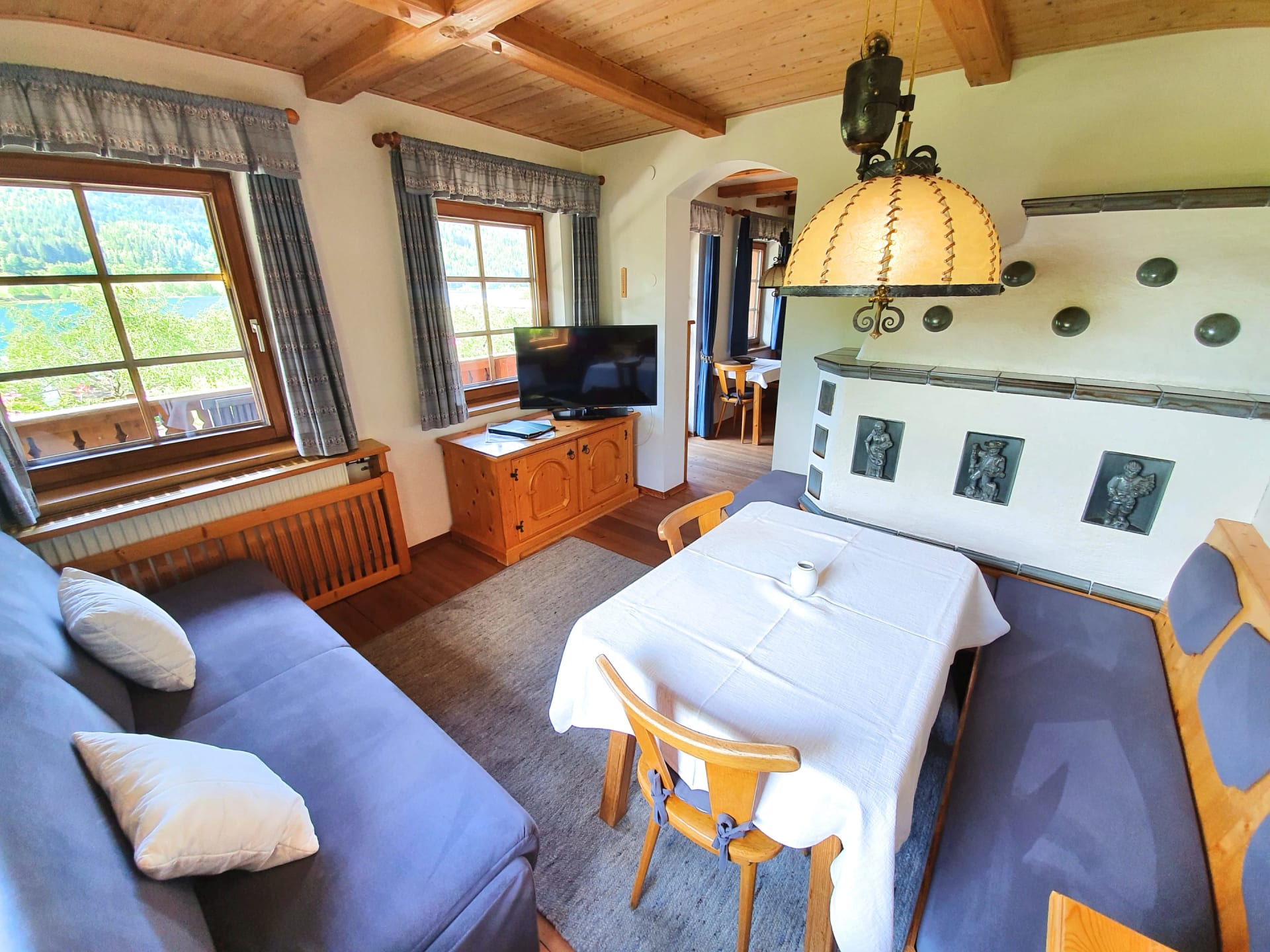 Erdgeschoss: Wohnzimmer mit Kachelofen, Tel, Internet, Smart-TV, Safe, Terrasse, Süd-Balkon, Küche, Spülmaschine, Kaffeevollautomat, Backofen, Vorraum, Abstellraum, Bad, WC, Föhn,