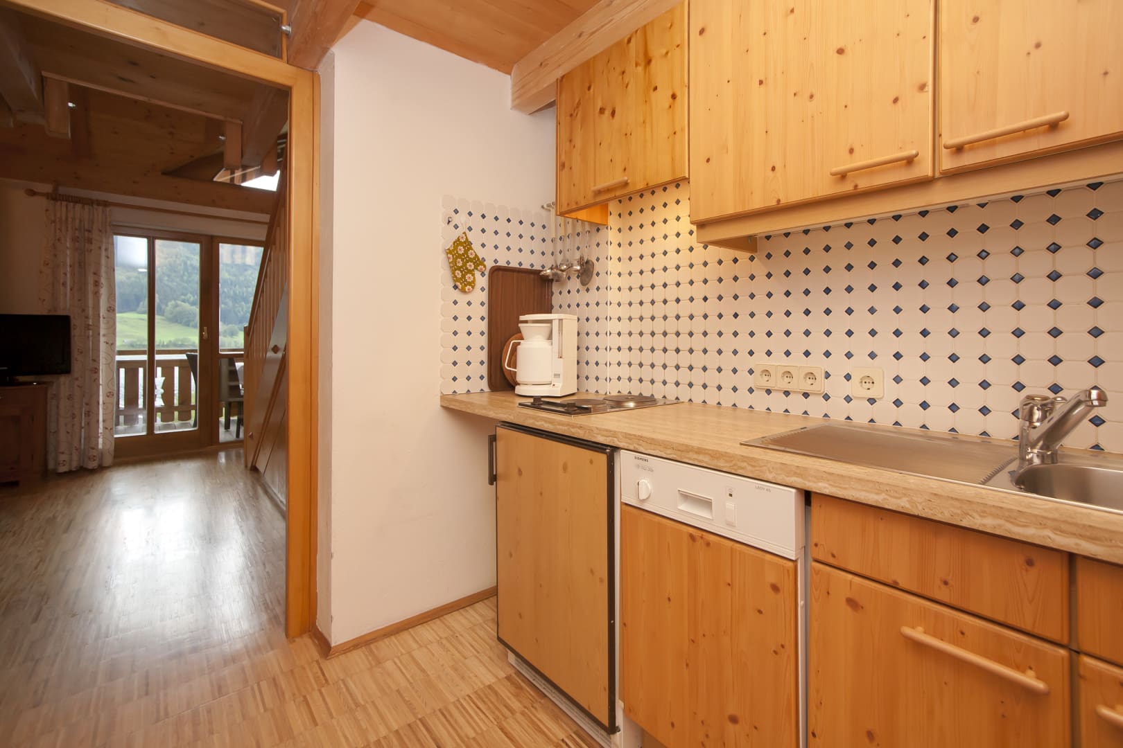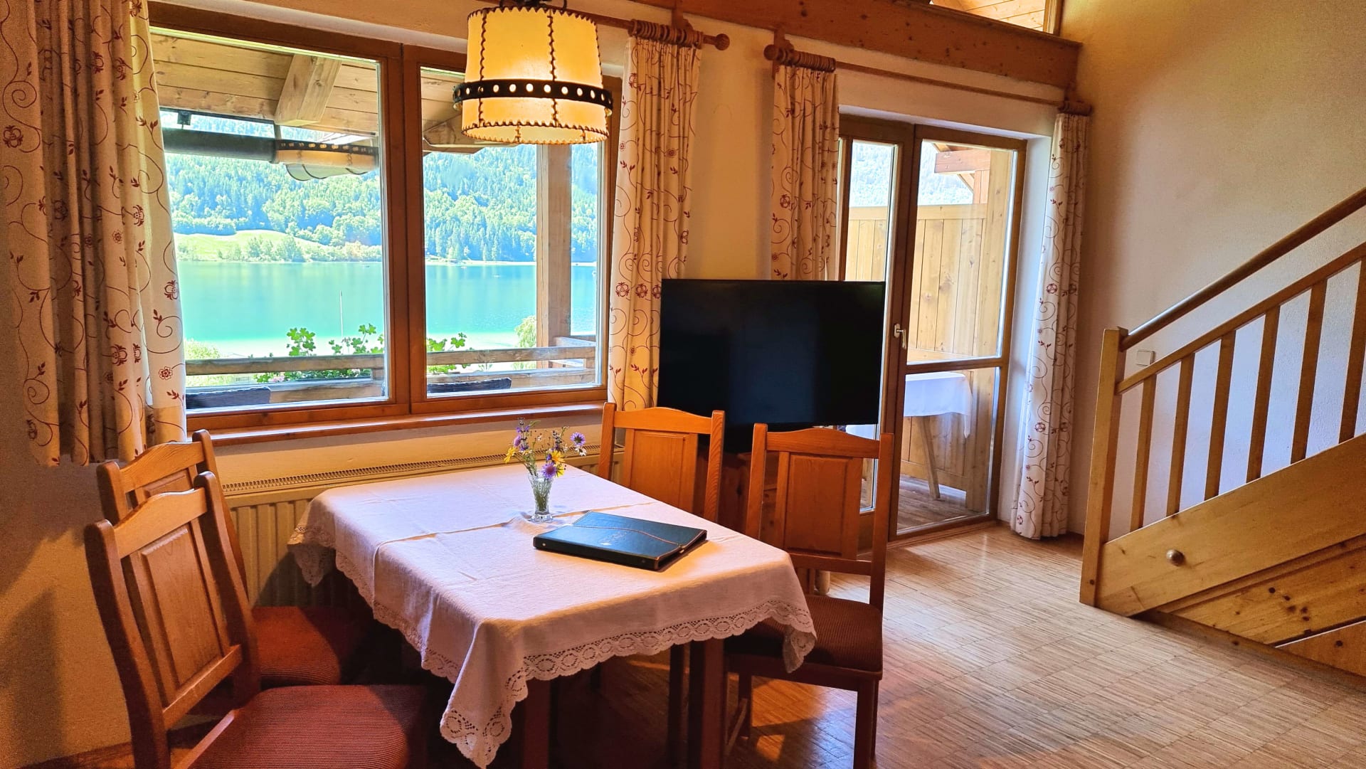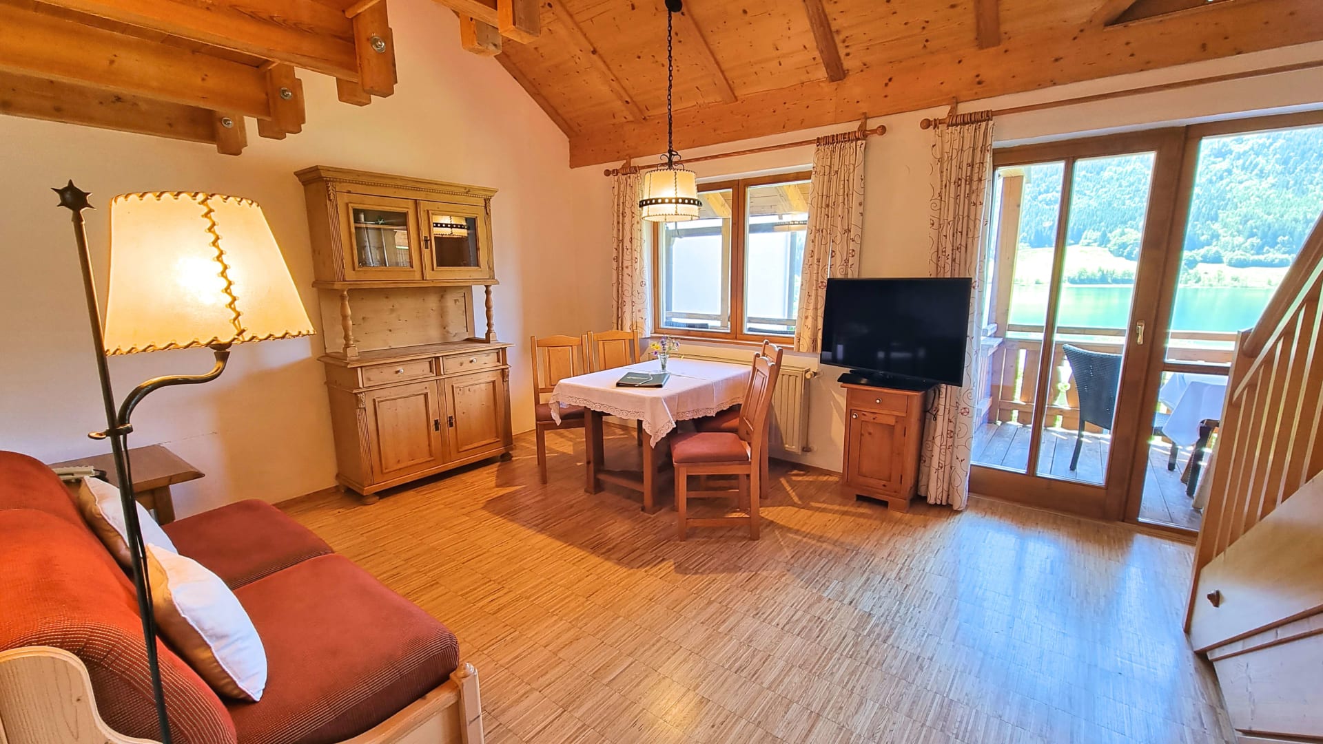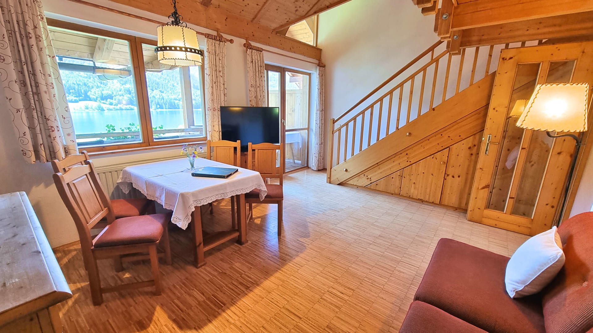 Eine gemütliche Ferienwohnung im Haus Bergblick, ca. 55m² mit Wohnzimmer, gemütliches Schlafsofa, abgechlossene Schlafgalerie über eine Treppe erreichbar, Sofasessel mit Schlaffunktion. Vorraum mit Kochnische (Geschirrspüler, 4-Plattenherd, Geschirr, Besteck, Kühlschrank mit Gefrierfach, Wasserkocher und Kaffeemaschine Filter). Dusche und Doppelwaschbecken, WC abgetrennt, großer Balkon zum See, Tel, Smart-TV, Safe, Internetanschluss, Föhn, Parkplatz. Nebenkosten Endreinigung.
