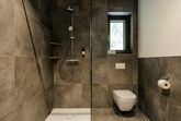 Großes Badezimmer (6m²) teilweise mit Fenster, ebenerdiger Dusche, Waschbecken und WC, Föhn, Seife, Duschgel.