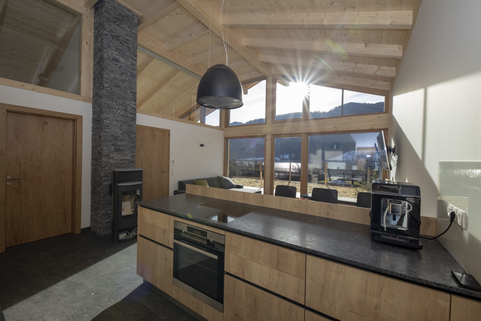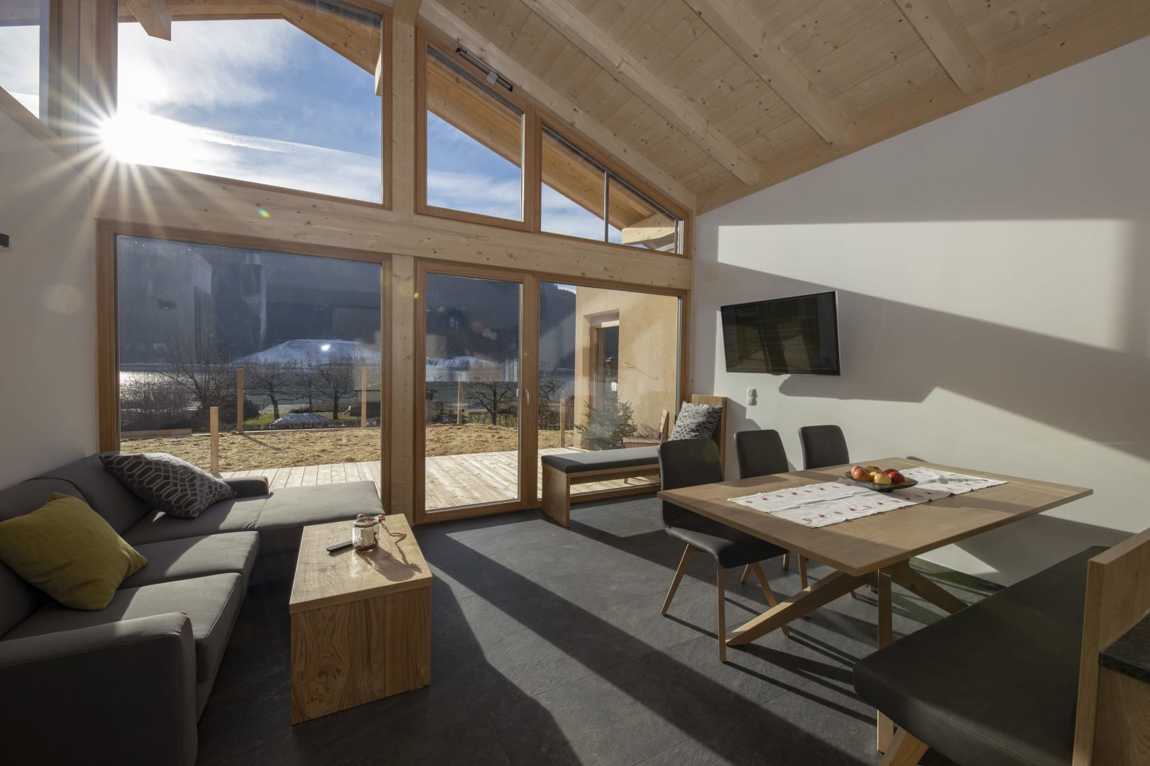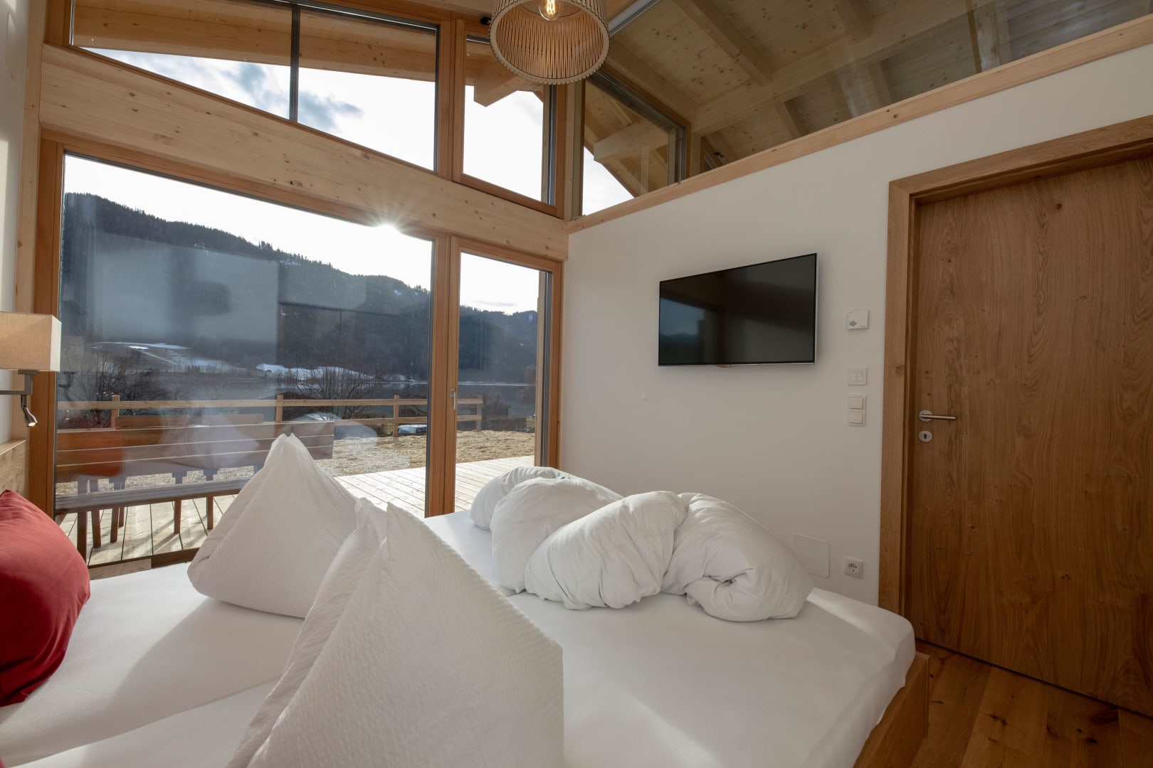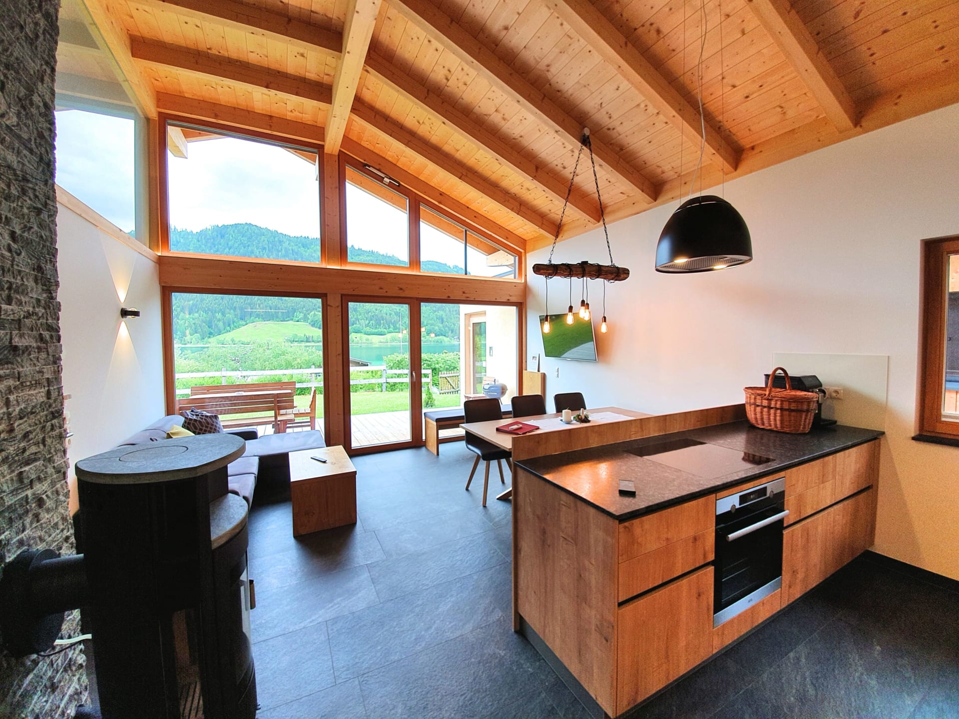Terrasse mit Garten und privater Sauna, Privatstrand mit Ruderboot, Liegen, Tischtennis und Surfbrett.  Helles Wohnzimmer mit Scheitholzofen, Sichtdachstuhl, Esstisch, Couch, Flat-TV, Safe. Offene Kücheninsel mit Kaffeevollautomat, Geschirrspüler und E-Herd mit Backofen.  1 Schlafzimmer mit Doppelbett und Flat-TV, 1 Zimmer mit Doppelbett (auseinander-schiebbar) und Einzelbett (Hochbett). Badezimmer mit Dusche, Doppelwaschbecken und WC getrennt.  Technikraum mit neuen Mountainbikes, Grill und Waschmaschine. Carport.