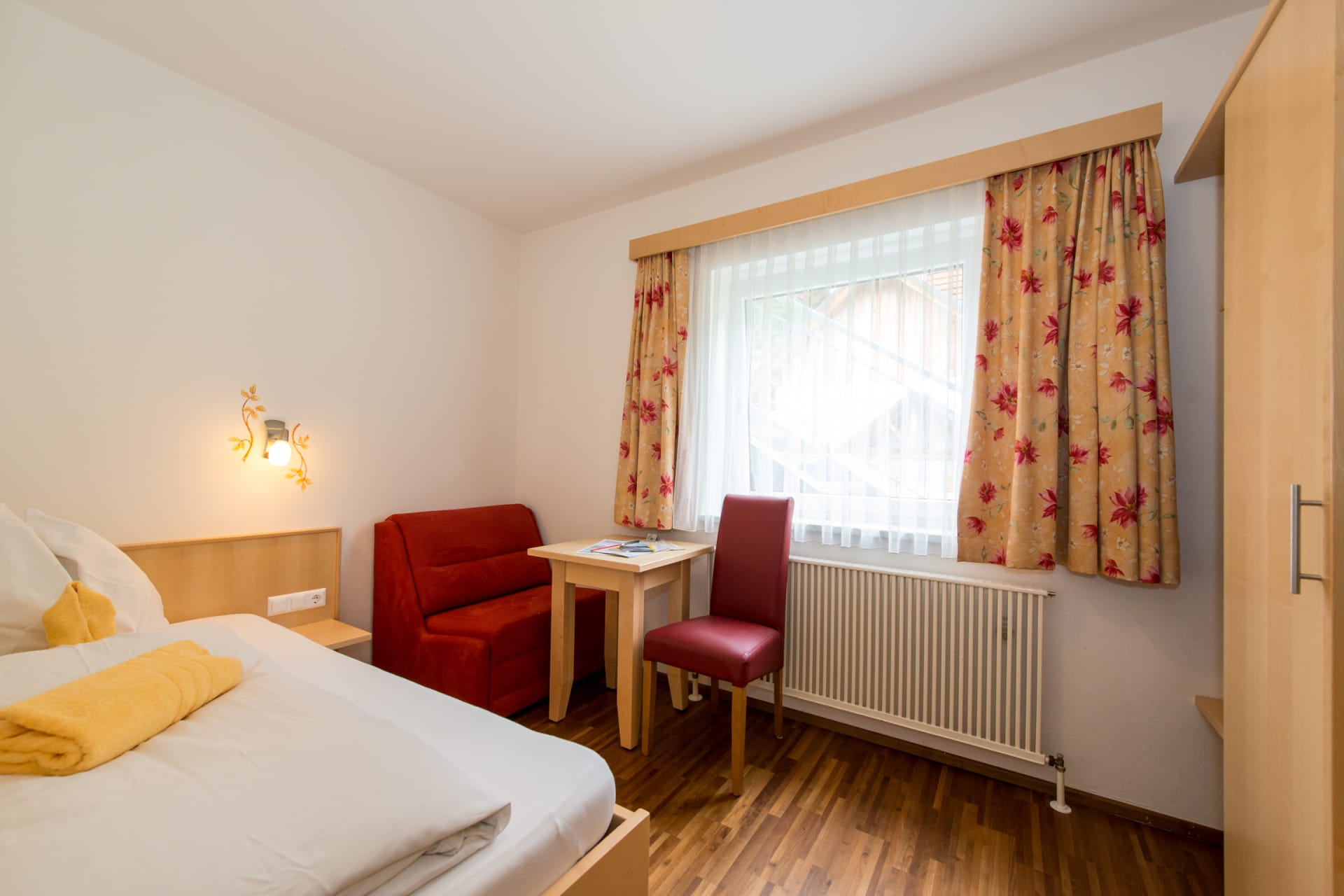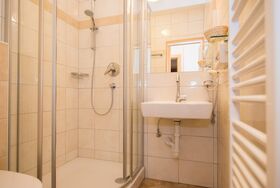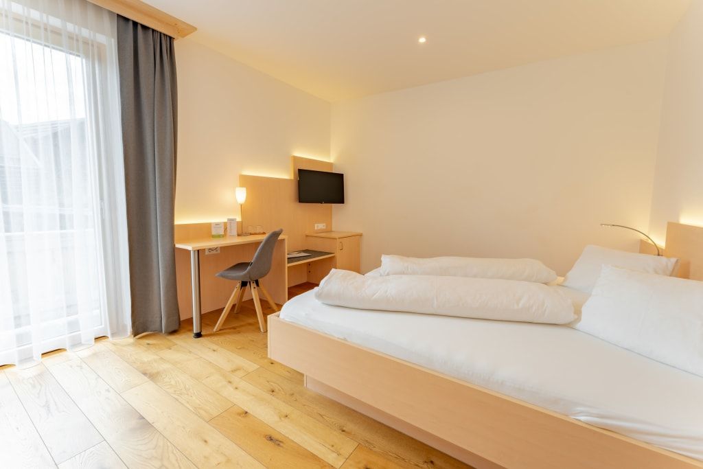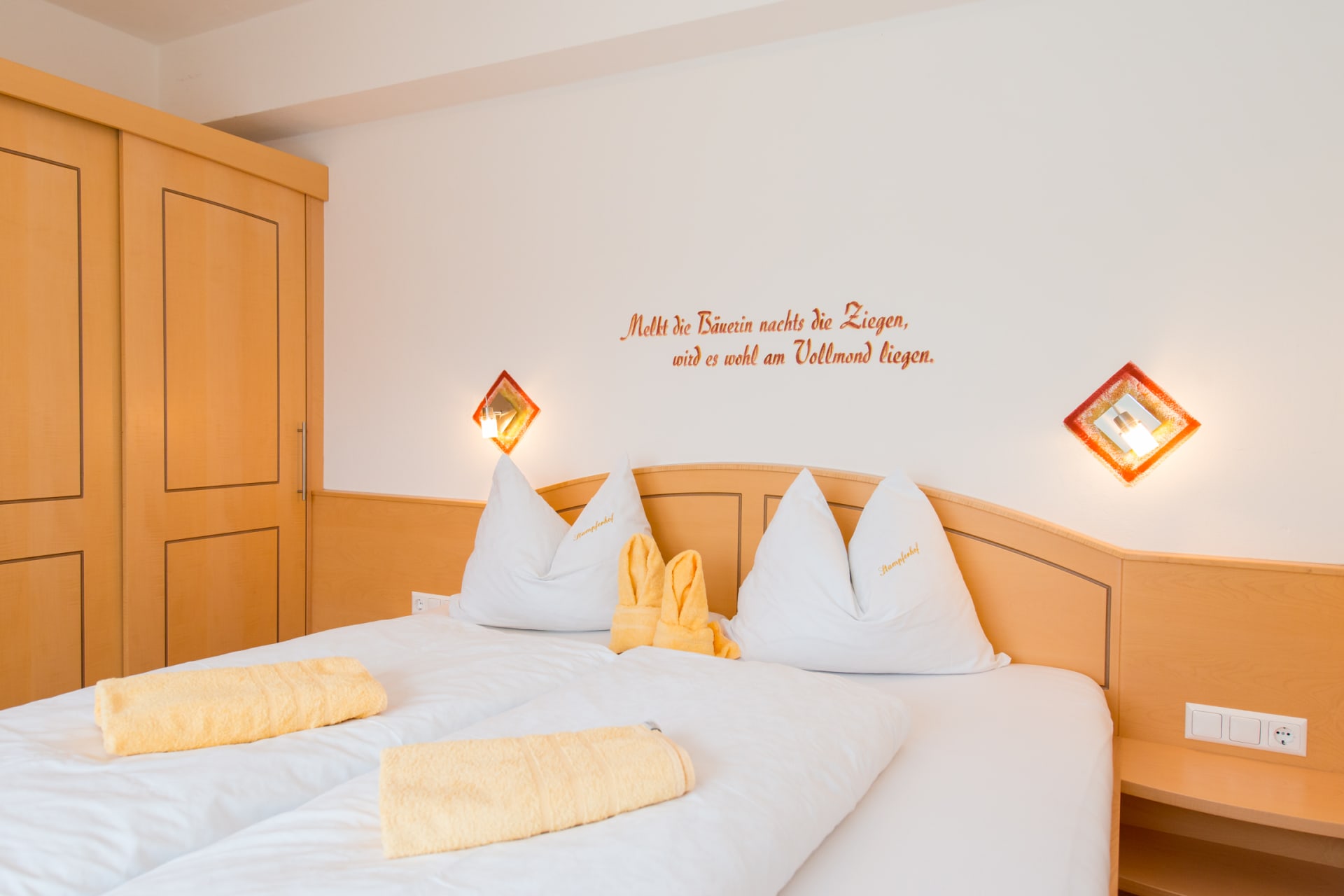 2 Doppelzimmer für 2 Personen mit Dusche/WC, Fön, Sat-TV, Telefon, Internet (W-Lan), Kühlschrank und Balkon mit Seeblick. Die Doppelzimmer Bienenstock sind durch eine Verbindungstür mit den Appartements Schwalbennest kombinierbar.