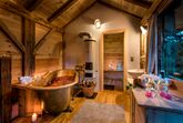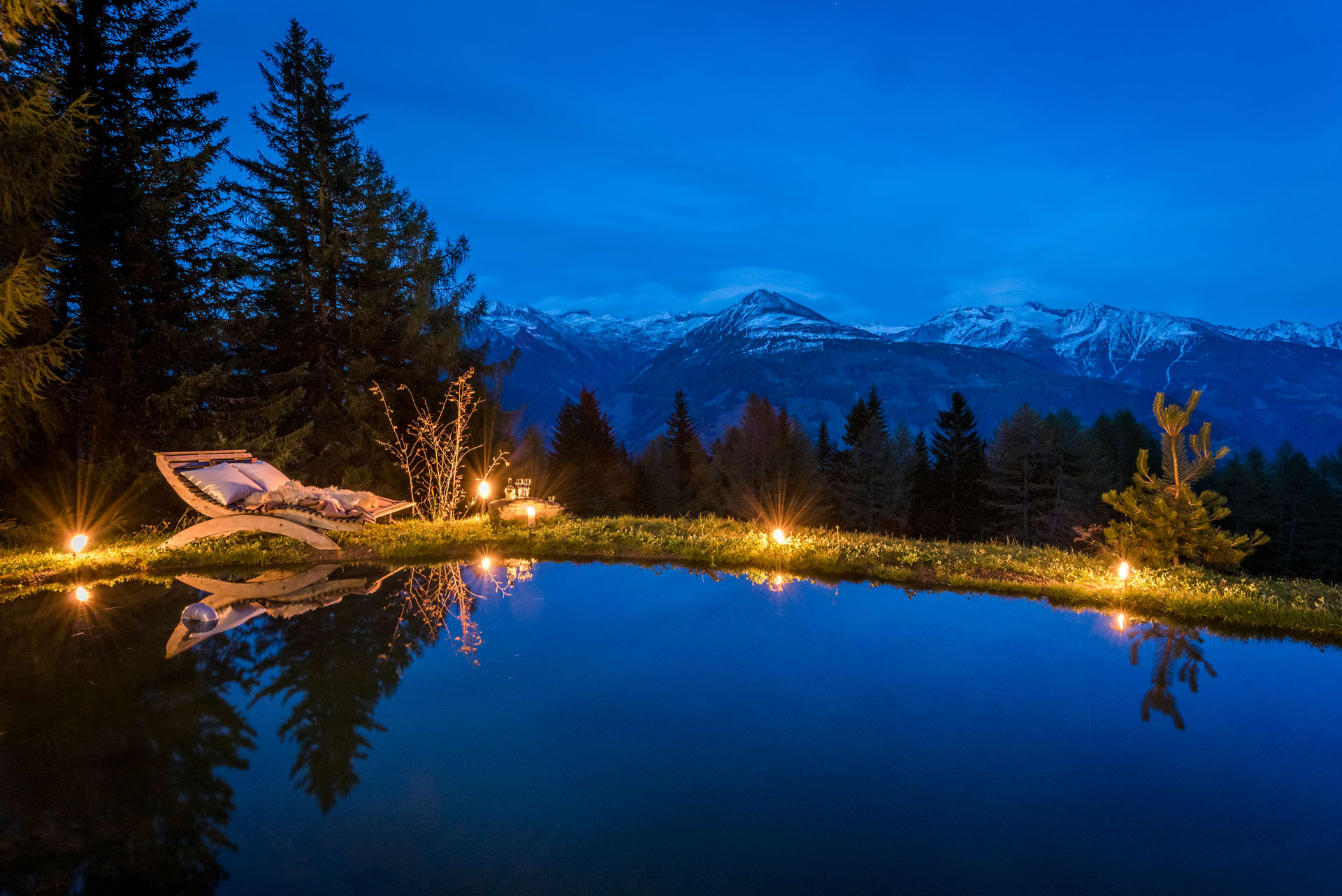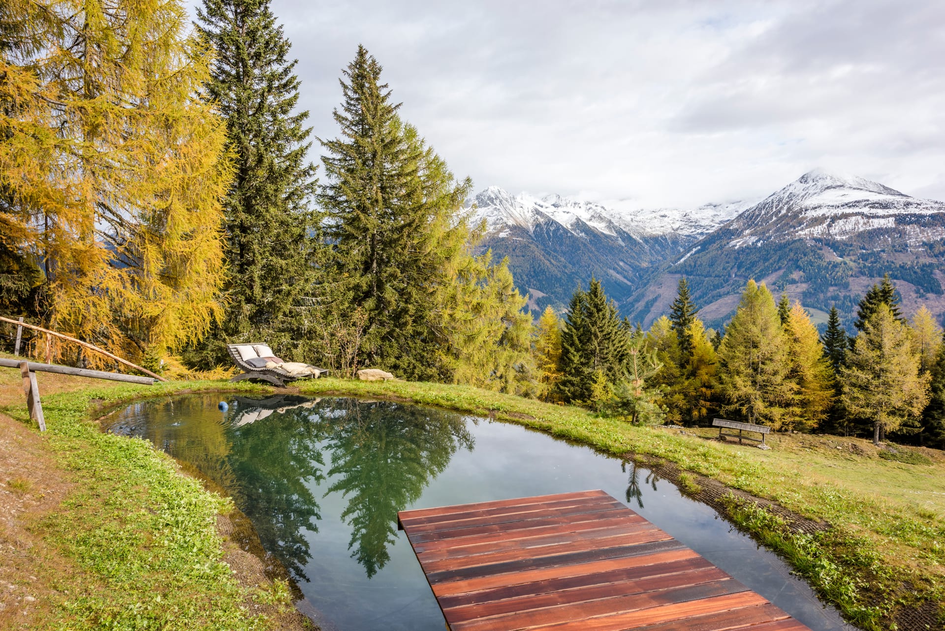 Im Erdgeschoss wurde eine Außen-Terrasse für entspannte Stunden und Grillabende im Freien angelegt. Wellness-Besonderheiten sind ein alpines Badehaus mit frei stehender Wanne, Holzofen und zur Talseite verglaster Sauna sowie ein Natur-Badeteich und ein Dachboden mit einem duftenden Almheulager