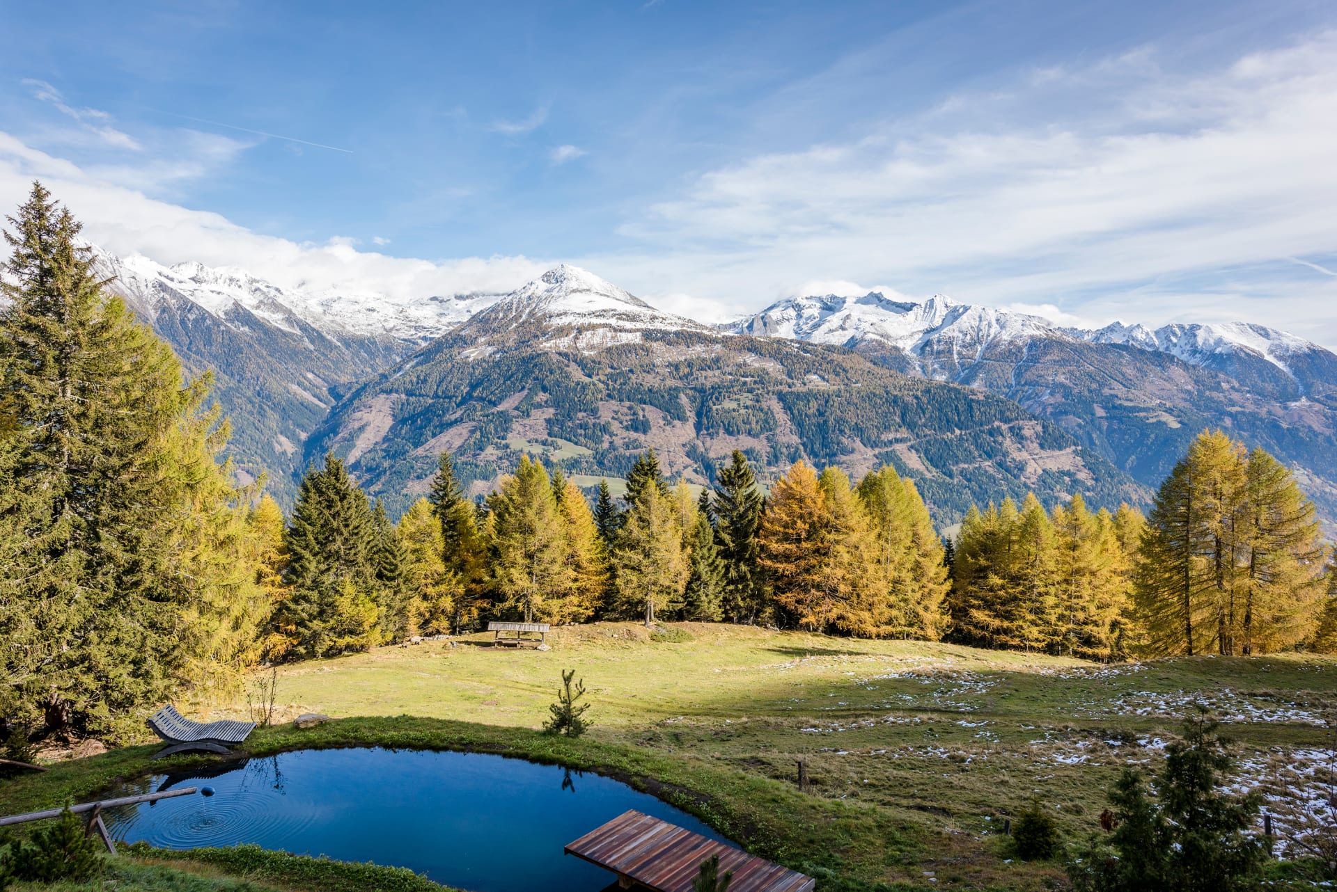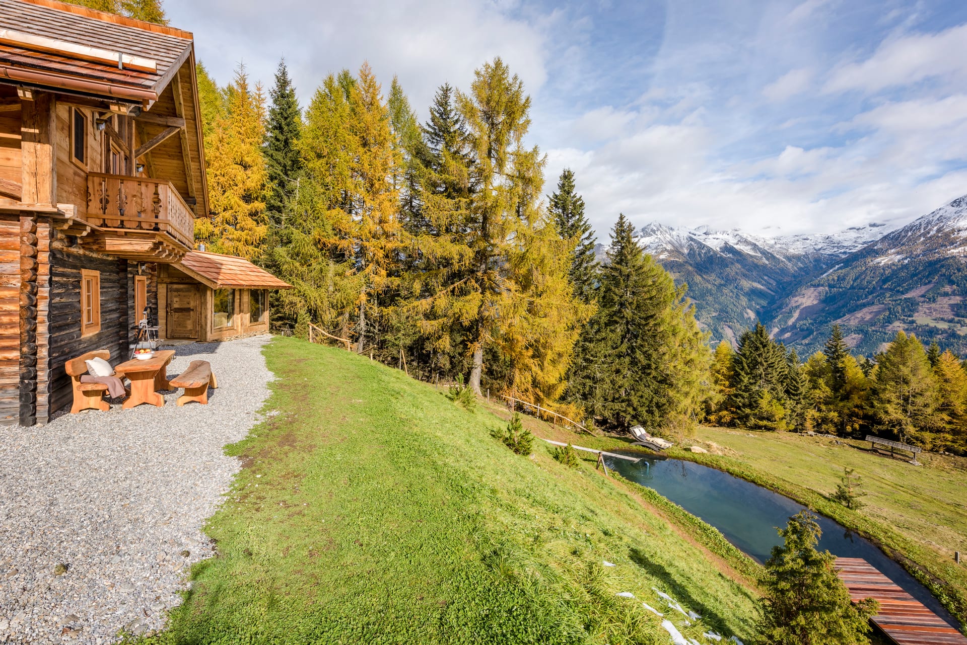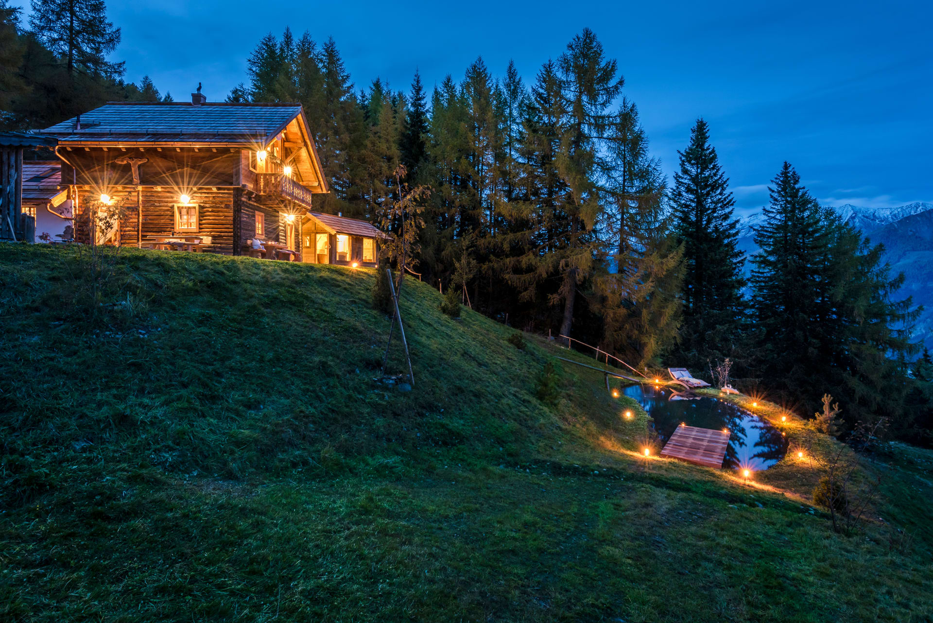 Vor der Hütte finden Sie eine Außen-Terrasse für entspannte Stunden und Grillabende im Freien. Es erwarten Sie ein alpines Badehaus mit frei stehender Wanne, Holzofen und zur Talseite verglaster Sauna sowie ein Natur-Badeteich und ein Dachboden mit einem duftenden Almheulager.