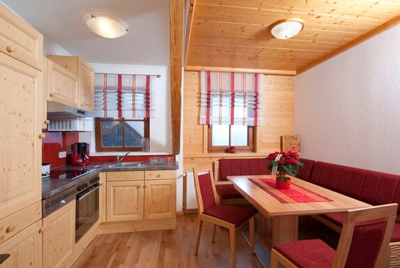 • 1 große Küche mit Sitzecke, E-Herd mit Backrohr, Microwelle, Kühlschrank, Kaffeemaschine, Geschirrspüler, Geschirr komplett