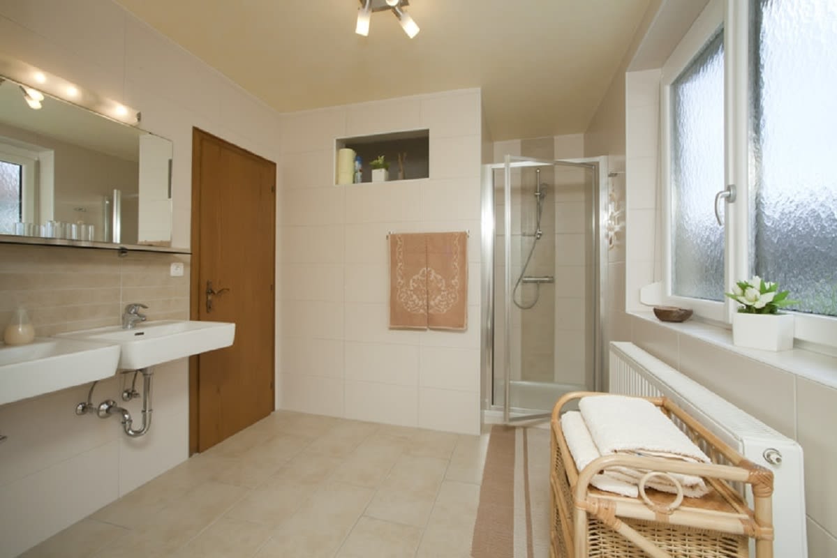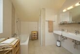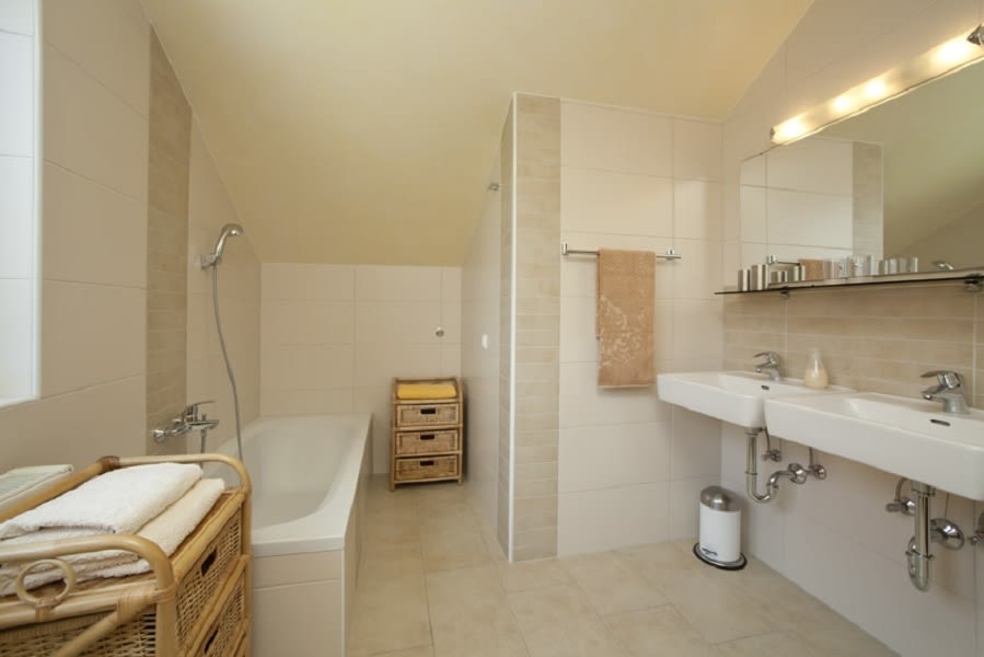 Das Bad hat 2 Waschbecken, Badewanne und Dusche; WC separat.