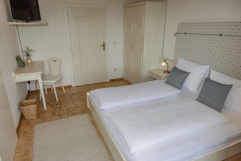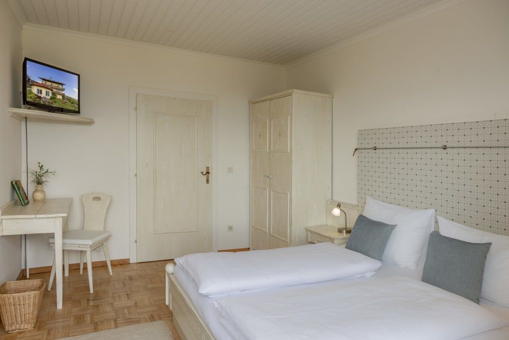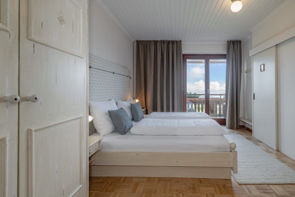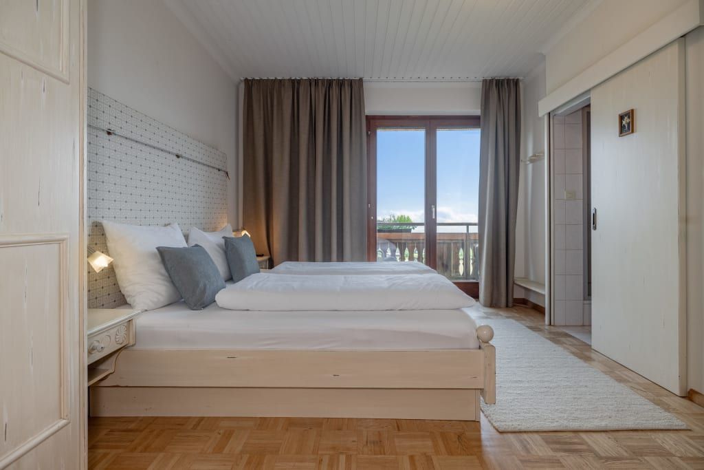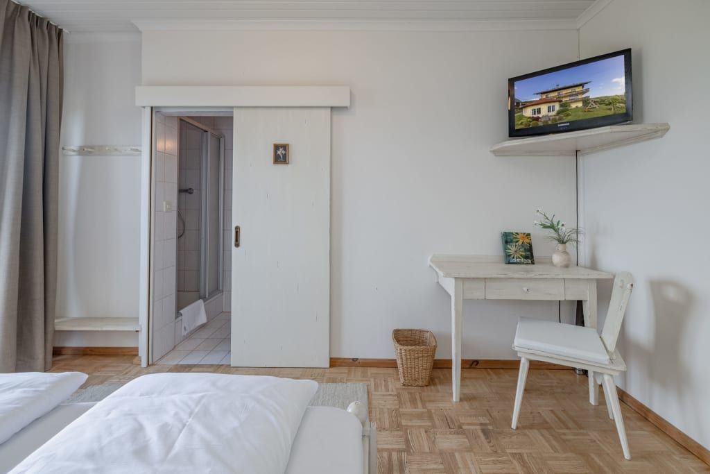 Sie wohnen im gemütlichen Doppelzimmer Edelweiß mit weißen Vollholzmöbel und Parkettboden, Dusche/WC und Balkon.