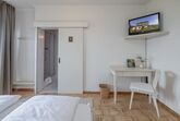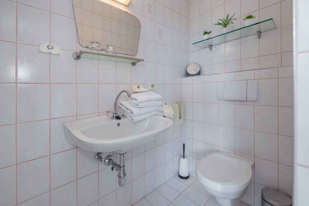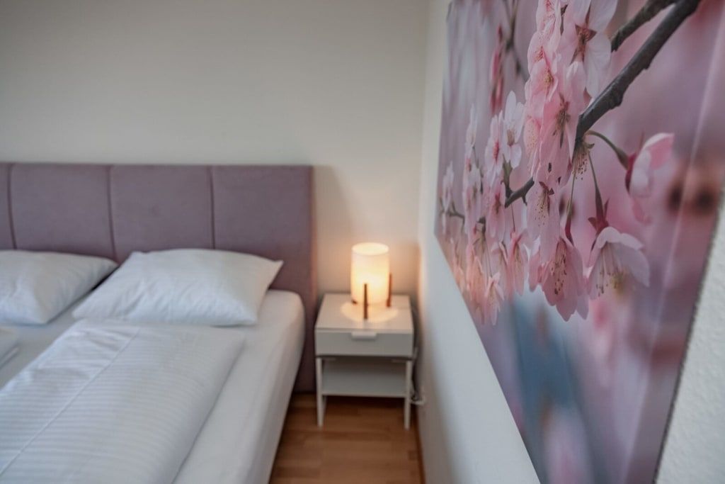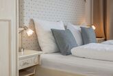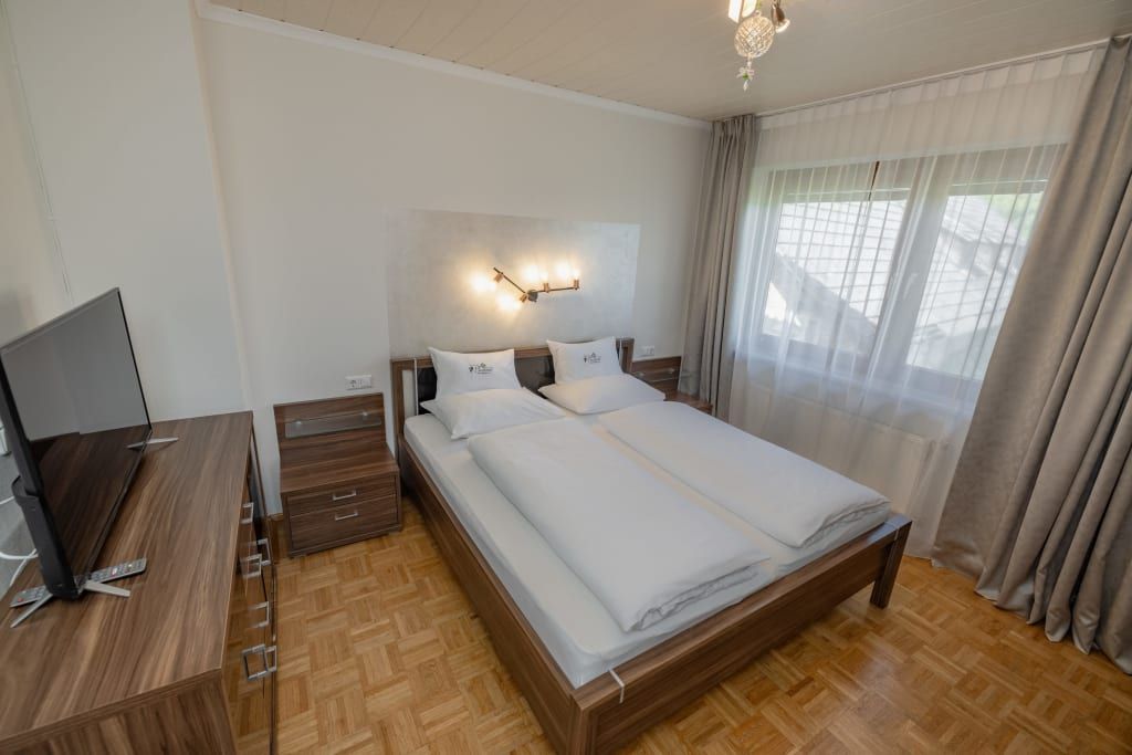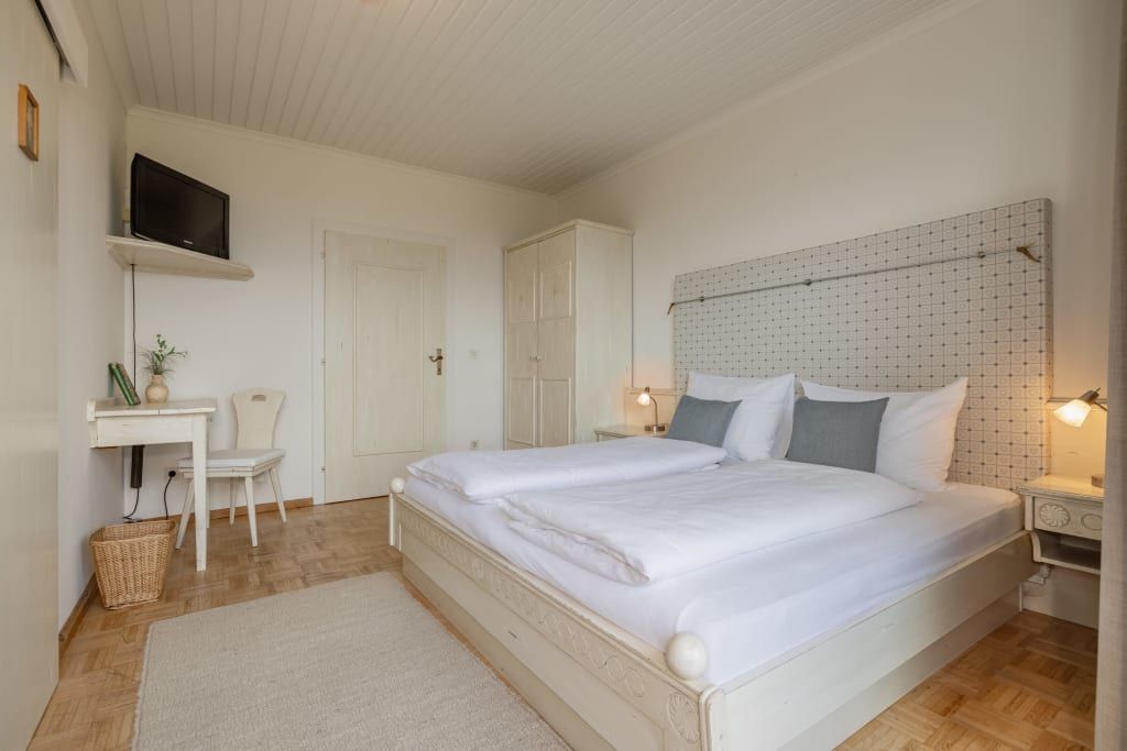 Sie wohnen im gemütlichen Doppelzimmer Edelweiß mit weißen Vollholzmöbel und Parkettboden, Dusche/WC und Balkon.