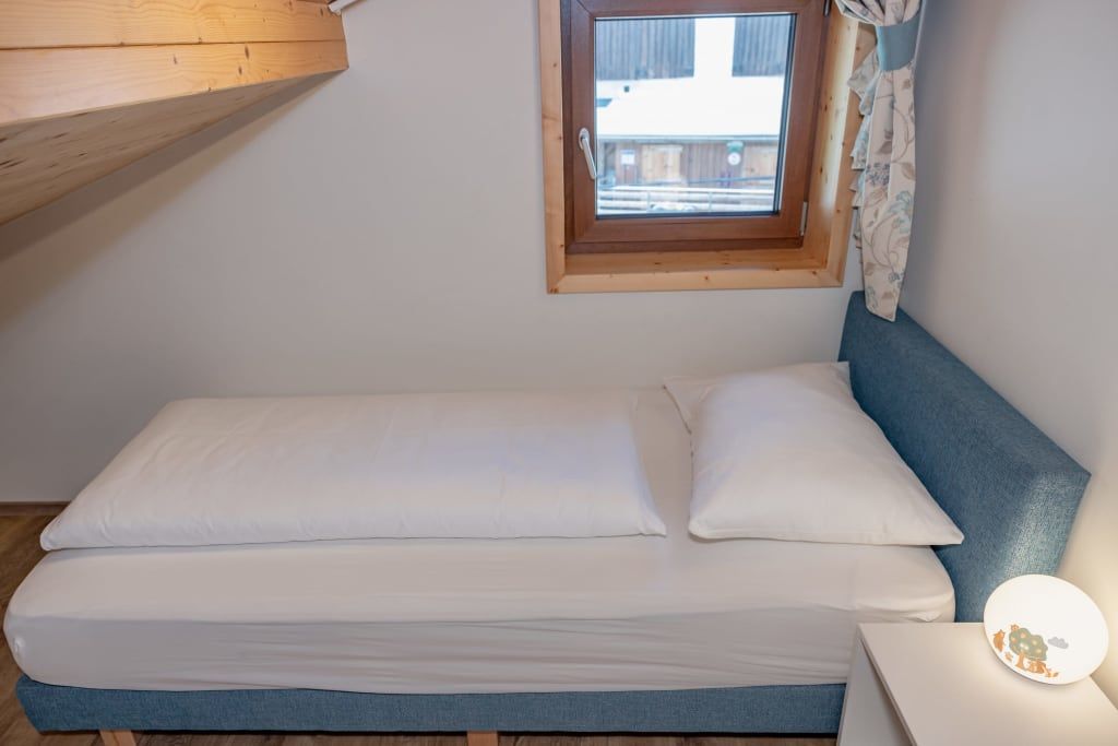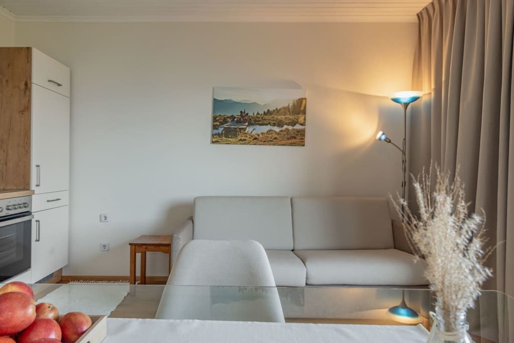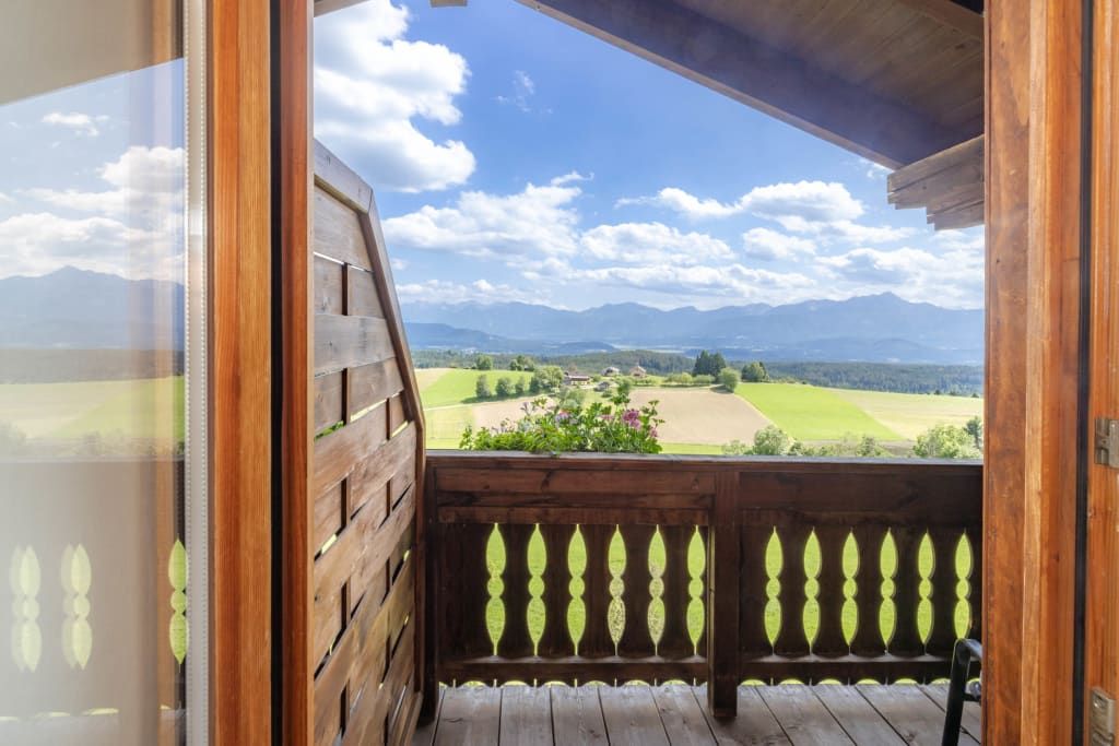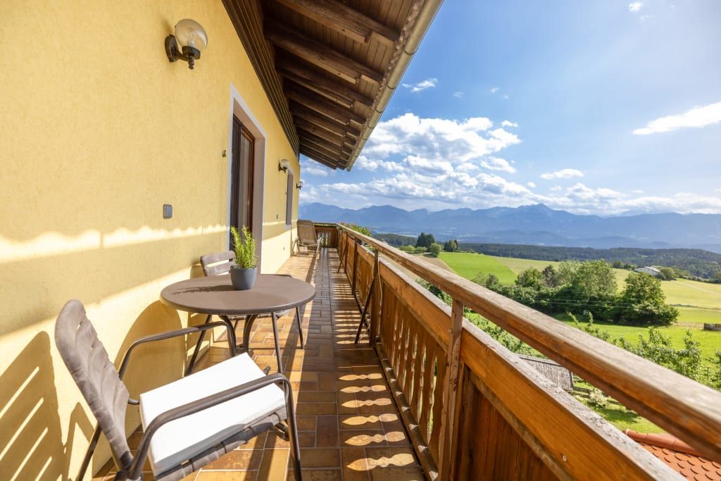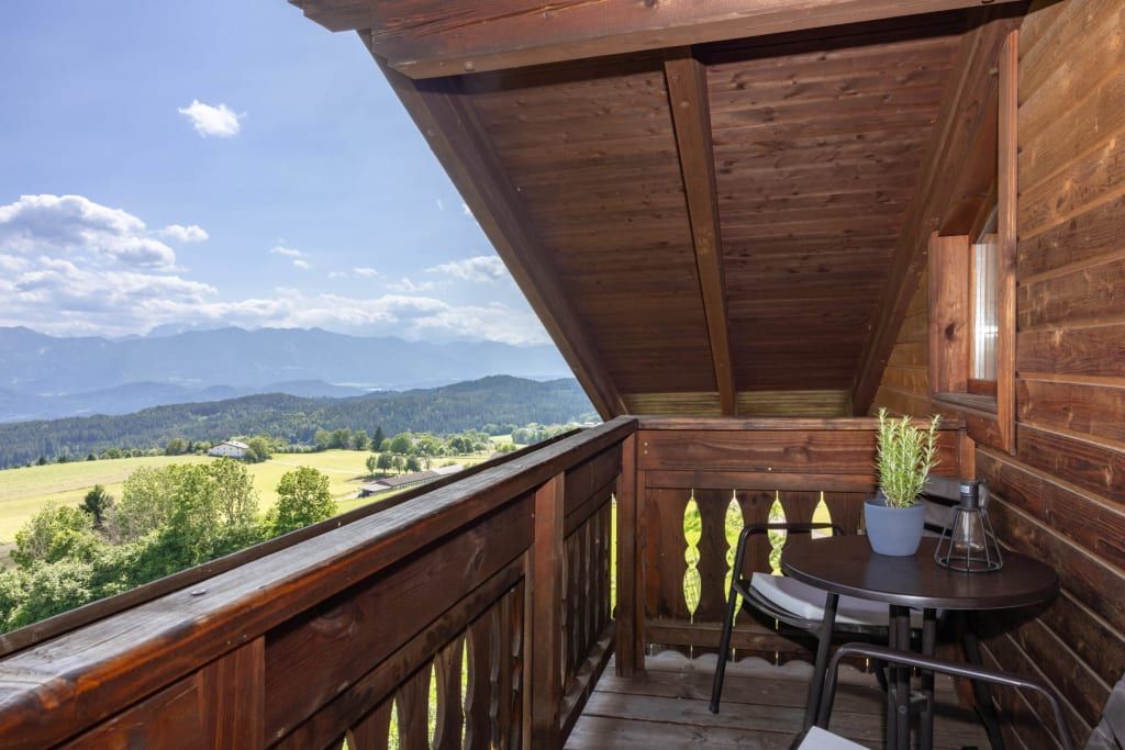 Auf ca. 65 m² erwarten Sie ein gemütliches Elternschlafzimmer mit Boxspringbett, Couch, TV und Panoramablick, ein separates Kinderzimmer mit zwei Einzelbetten und Blick auf die Pferde sowie eine voll ausgestattete Wohnküche mit Esstisch. Der Balkon mit Blick über halb Kärnten und gemütliche Bad runden das Wohnerlebnis perfekt ab.