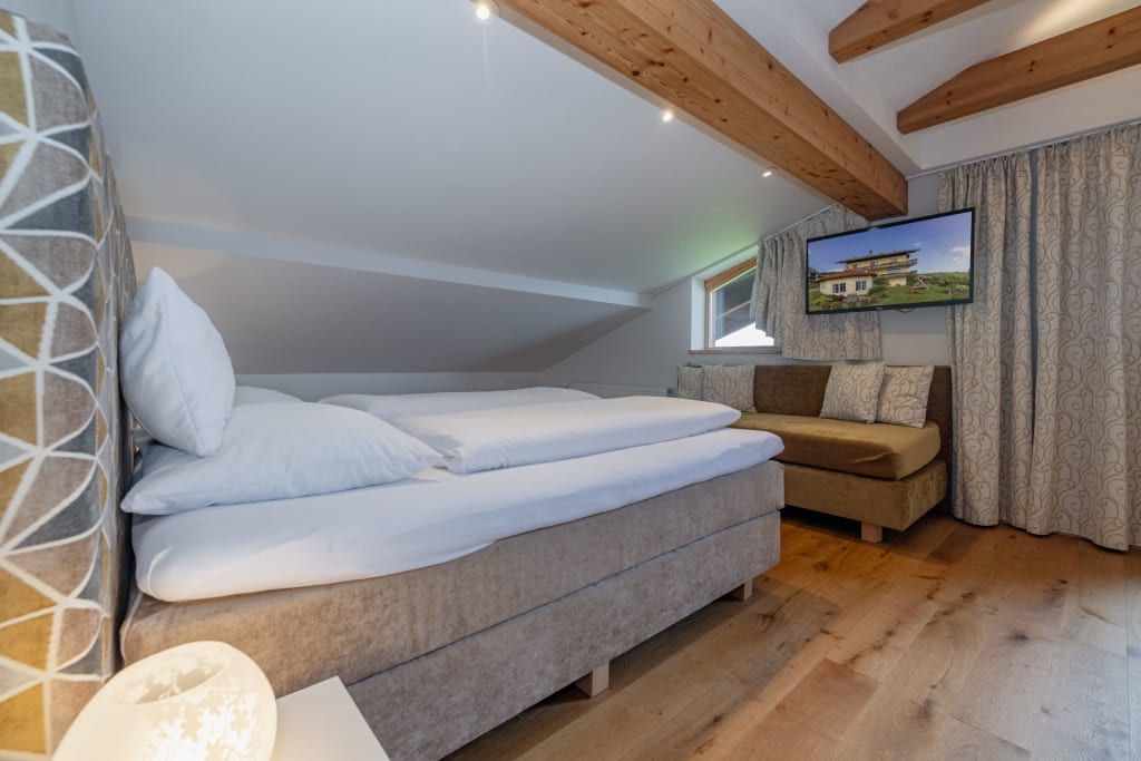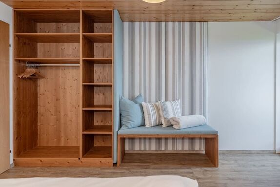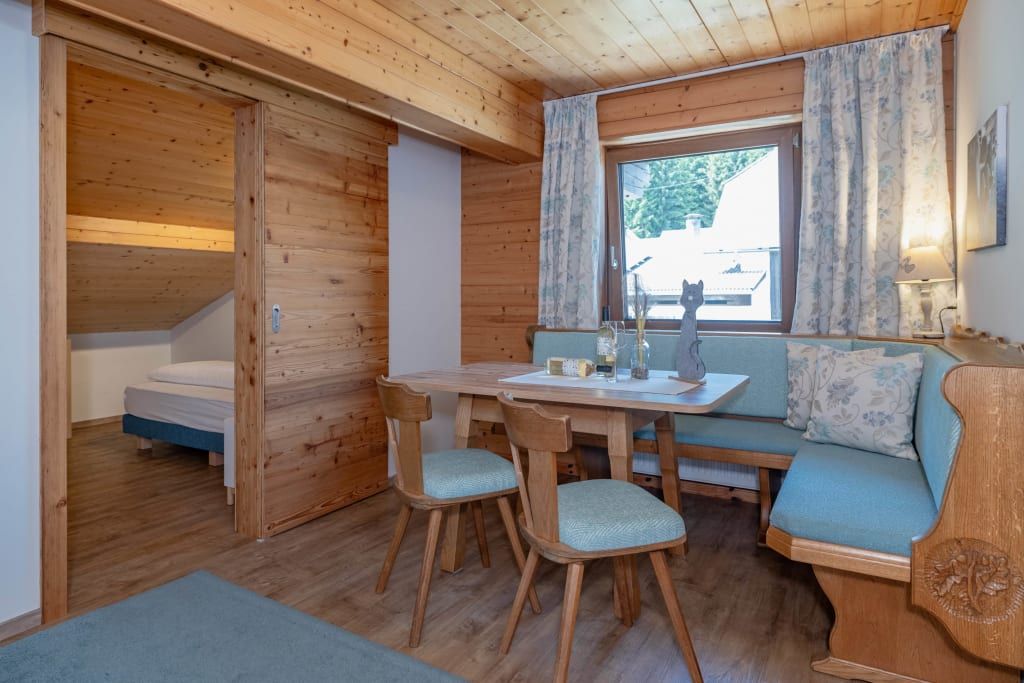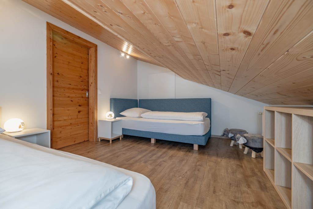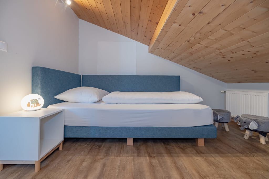 Auf ca. 65 m² erwarten Sie ein gemütliches Elternschlafzimmer mit Boxspringbett, Couch, TV und Panoramablick, ein separates Kinderzimmer mit zwei Einzelbetten und Blick auf die Pferde sowie eine voll ausgestattete Wohnküche mit Esstisch. Der Balkon mit Blick über halb Kärnten und gemütliche Bad runden das Wohnerlebnis perfekt ab.