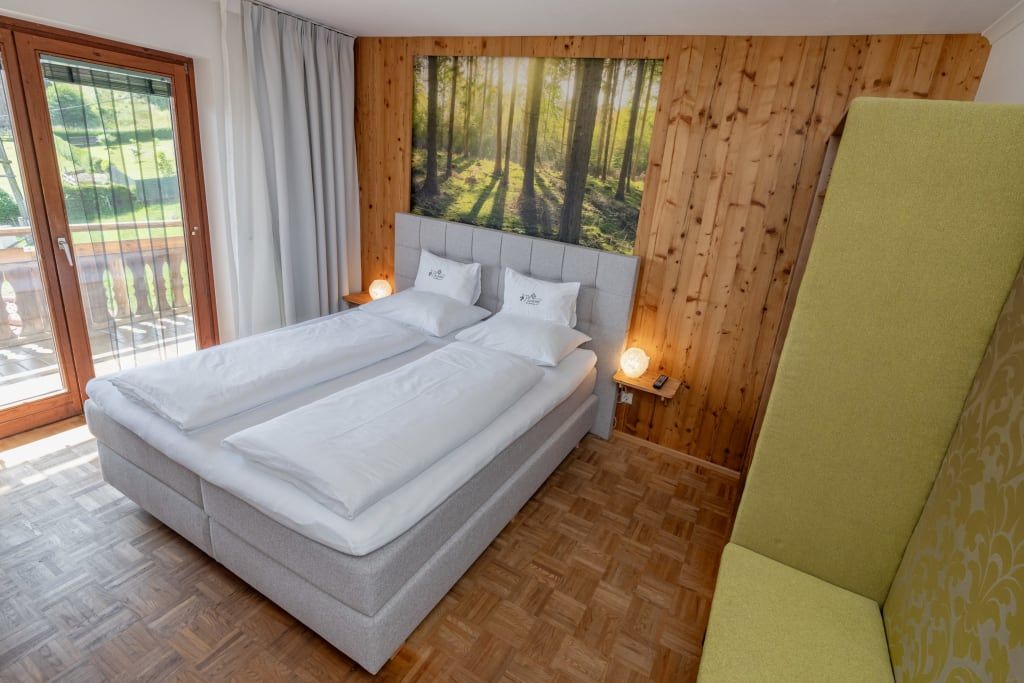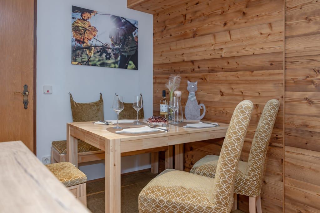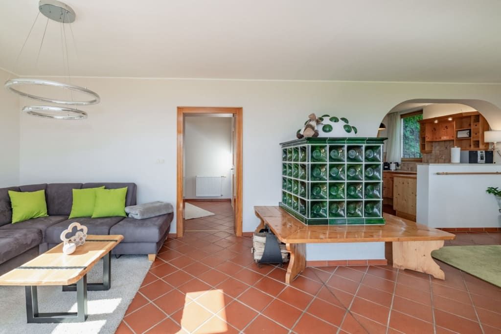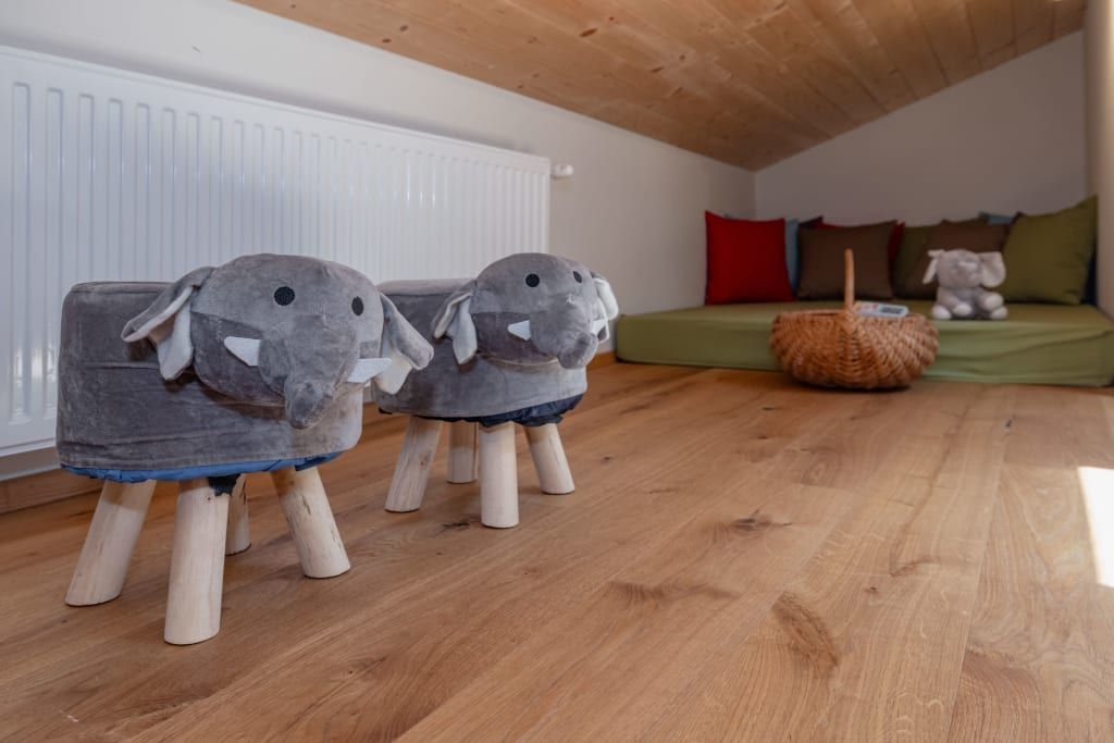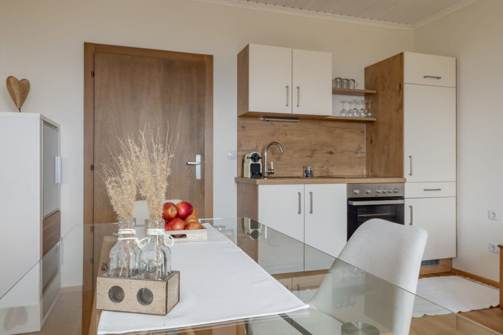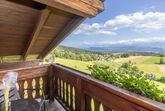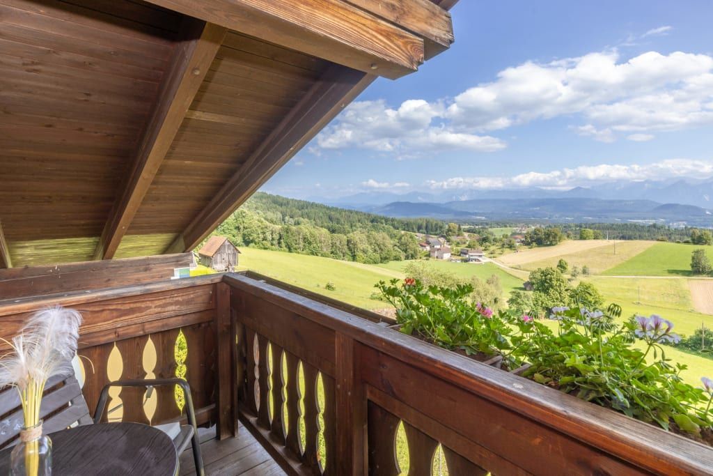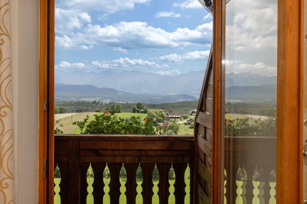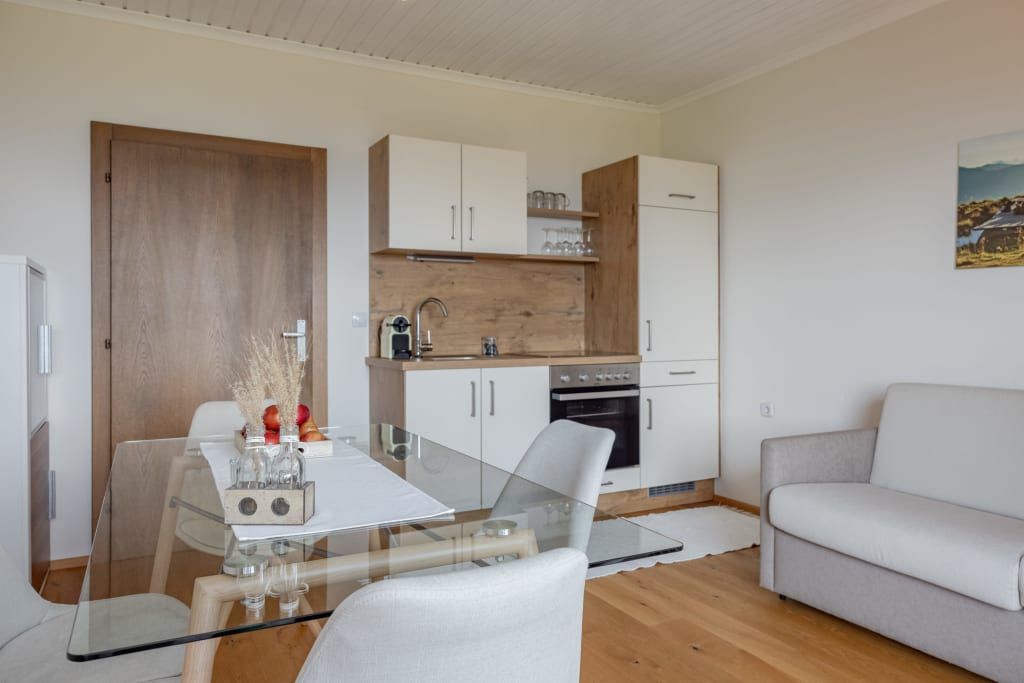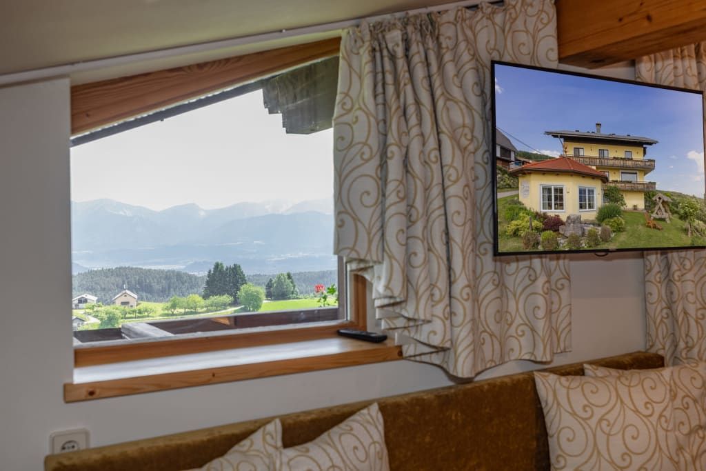 Auf ca. 65 m² erwarten Sie ein gemütliches Schlafzimmer mit Boxspringbett, Couch, TV und Panoramafenster mit Blick auf die Karawanken, ein separates Kinderzimmer mit zwei Einzelbetten sowie eine moderne Wohnküche mit Esstisch. Der Balkon lädt zum Entspannen ein – ideal für Familien, die Natur, Komfort und Erholung suchen.