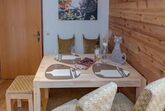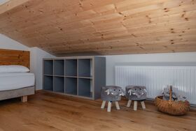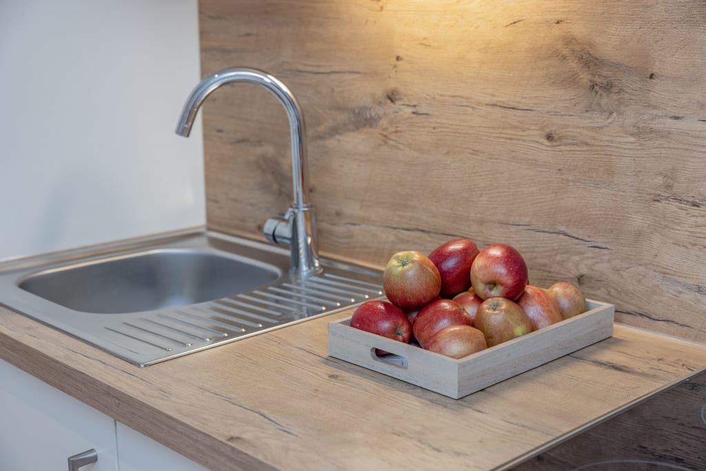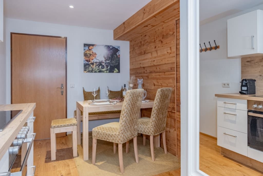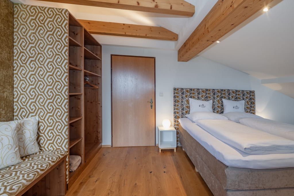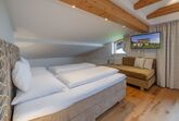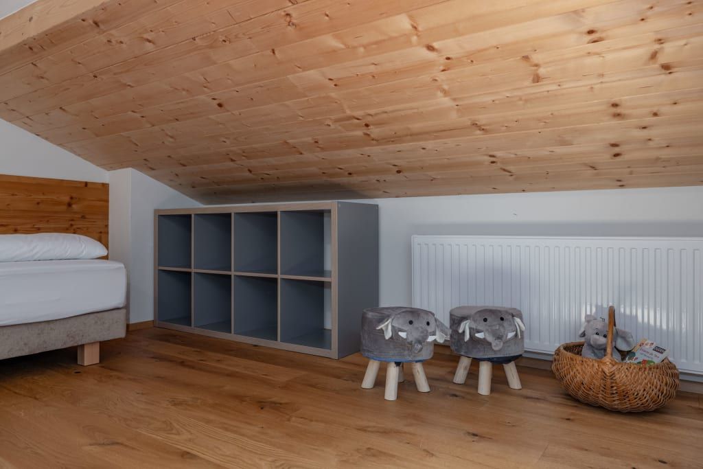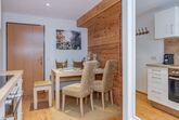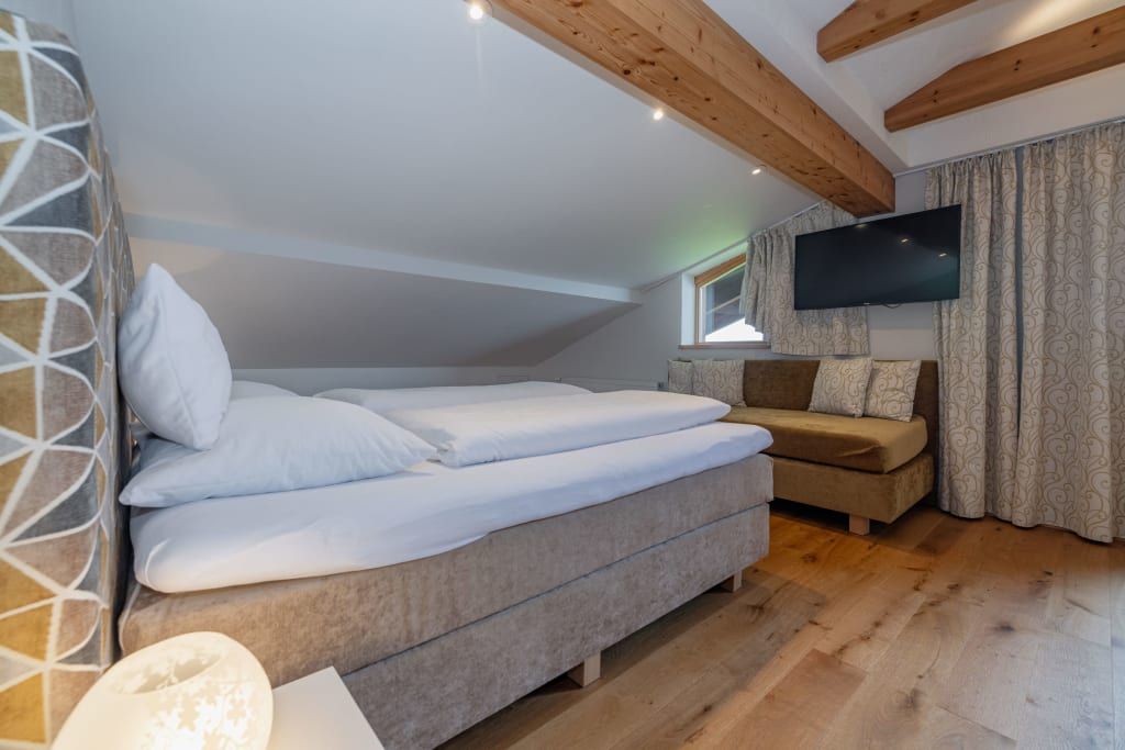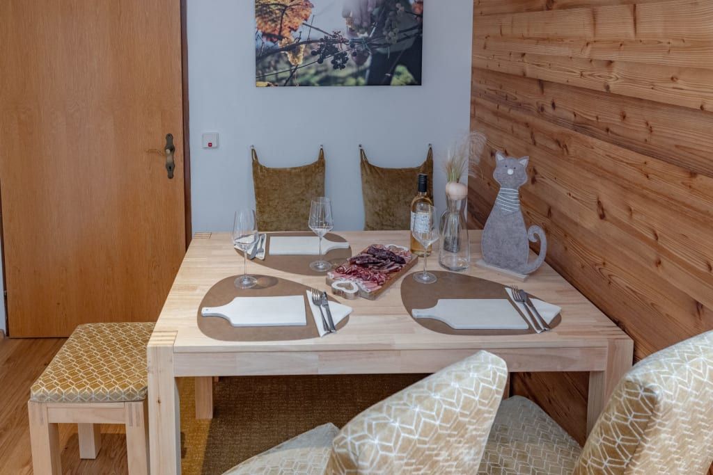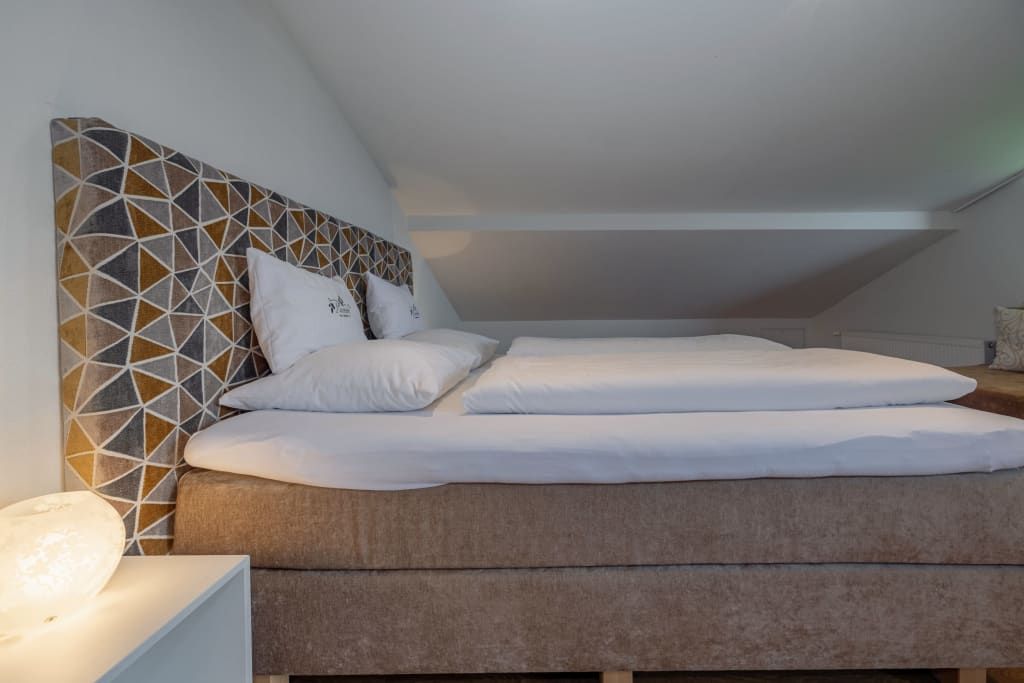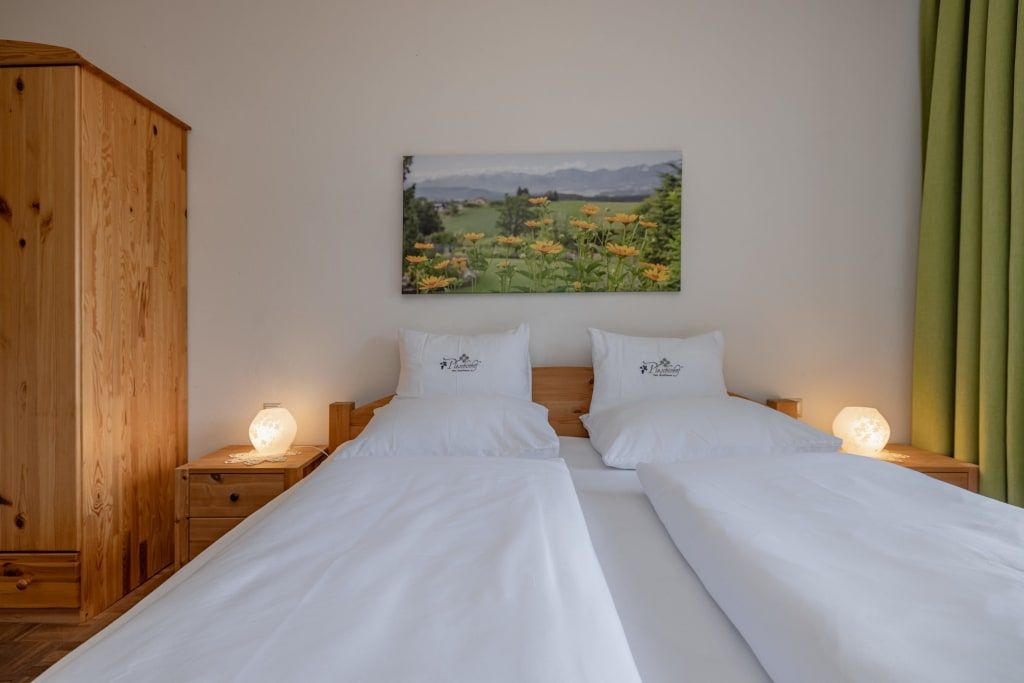 Auf ca. 65 m² erwarten Sie ein gemütliches Schlafzimmer mit Boxspringbett, Couch, TV und Panoramafenster mit Blick auf die Karawanken, ein separates Kinderzimmer mit zwei Einzelbetten sowie eine moderne Wohnküche mit Esstisch. Der Balkon lädt zum Entspannen ein – ideal für Familien, die Natur, Komfort und Erholung suchen.