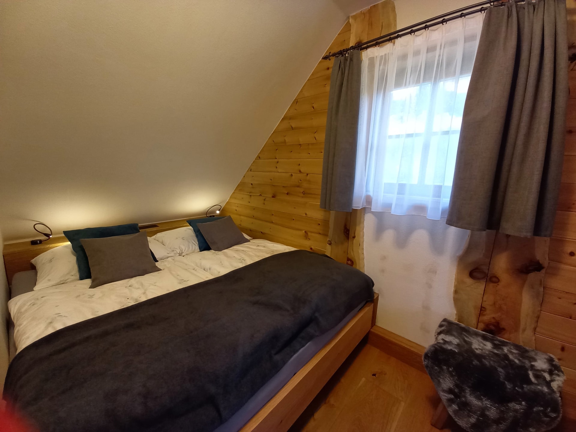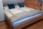 Die beiden Schlafzimmer befinden sich in der oberen Etage. Ausgestattet sind sie mit je einem Doppelbett. Zirben- bzw. Eichenholz, sowie Lehmputz und Hanfisolierung, diese Elemente sorgen für ein erholsames und gesundes Raumklima. Der Balkon lädt zum Durchatmen an der frischen Luft ein.