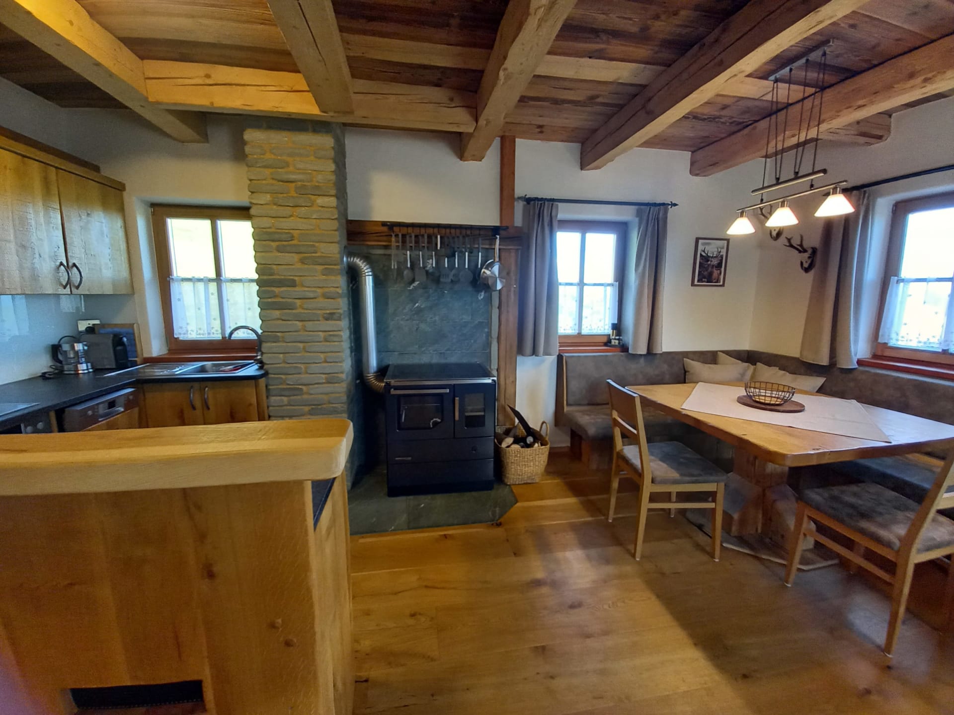 Der gemütliche Wohnraum mit Holzofen im Erdgeschoss lädt zum Entspannen auf der Couch ein. Ebenfalls im Erdgeschoss befindet sich die voll ausgestattete Vollholzküche mit Esstisch, der Vorraum mit Garderobe, WC, Dusche und Waschmaschine sowie die ebenerdige Terrasse.