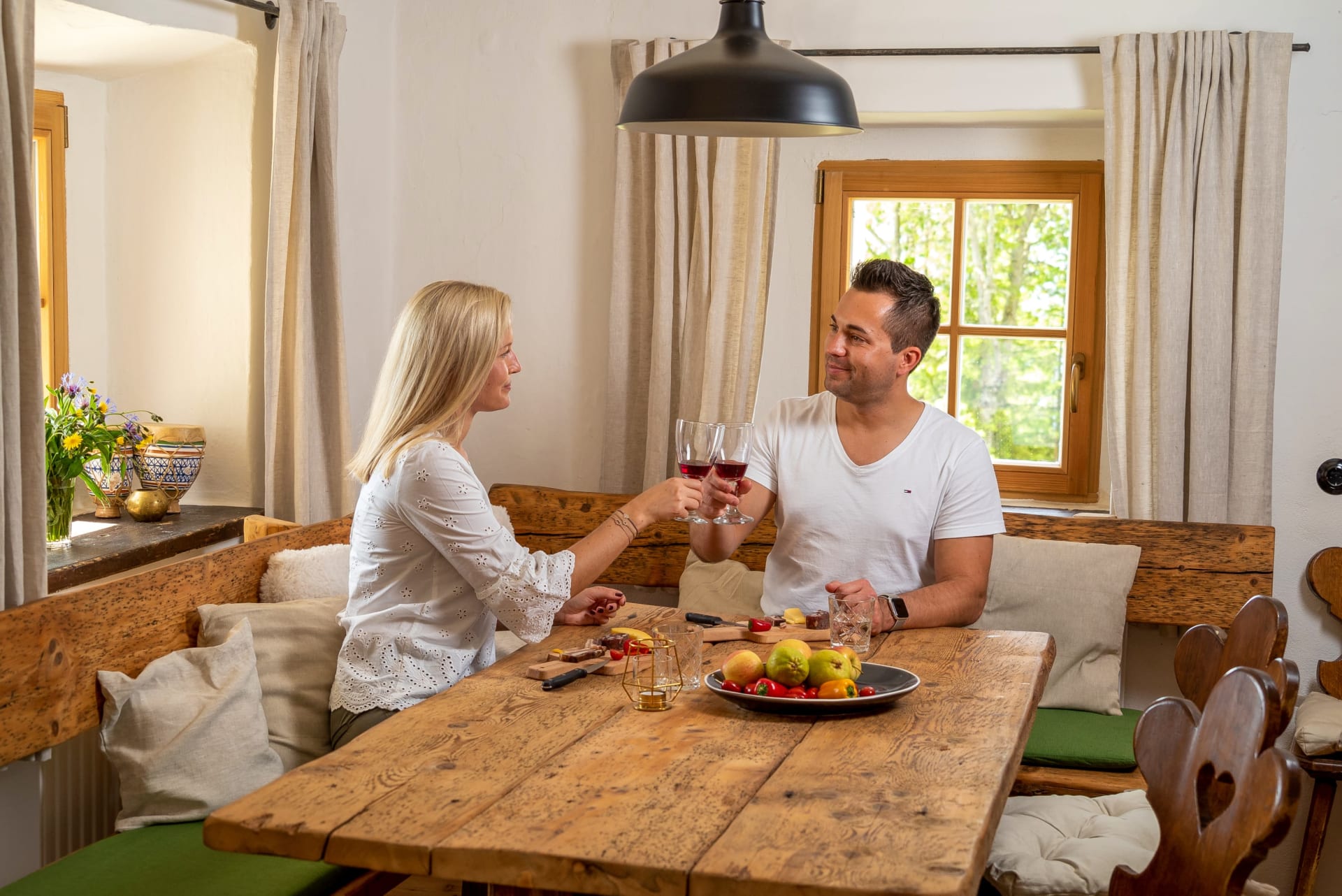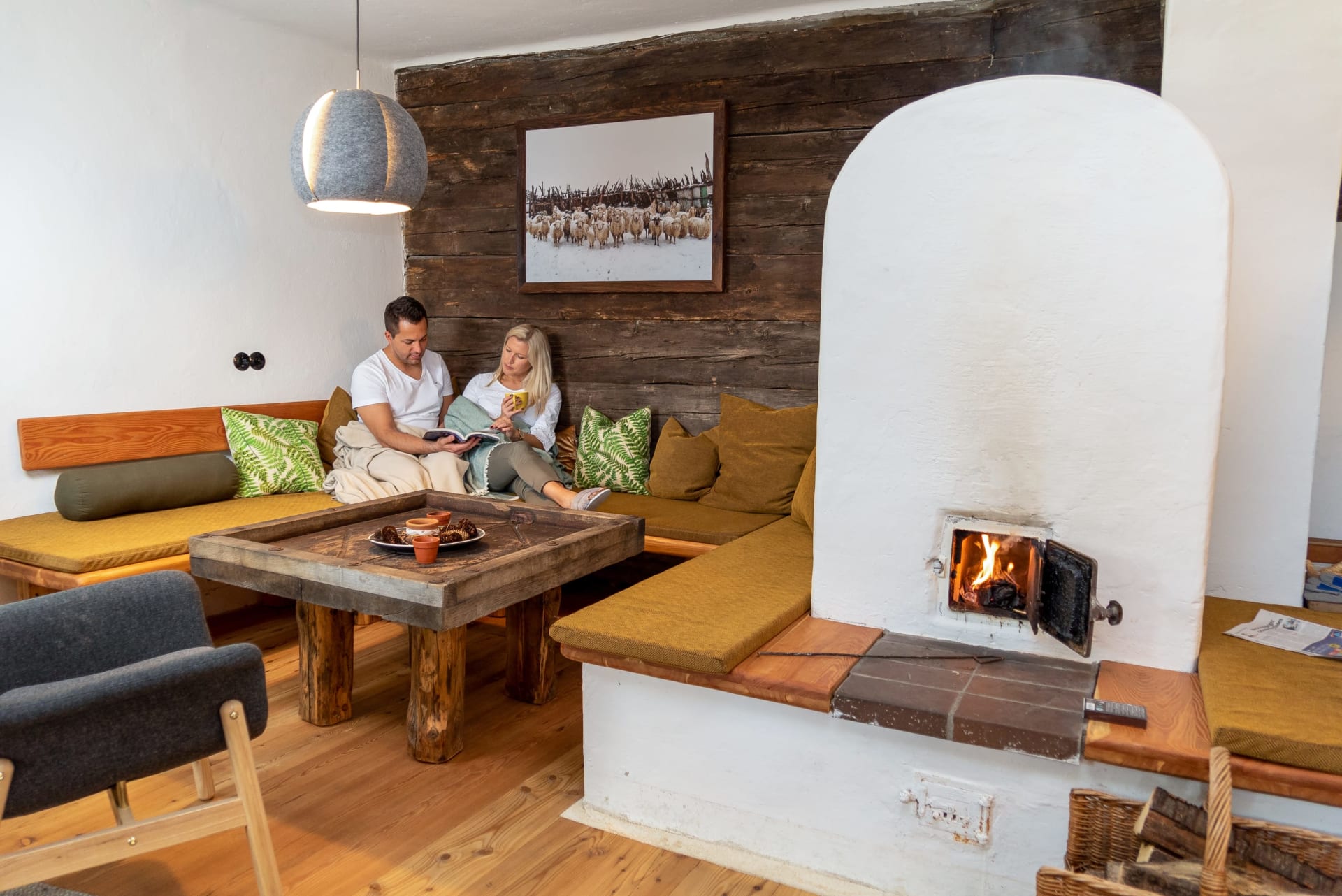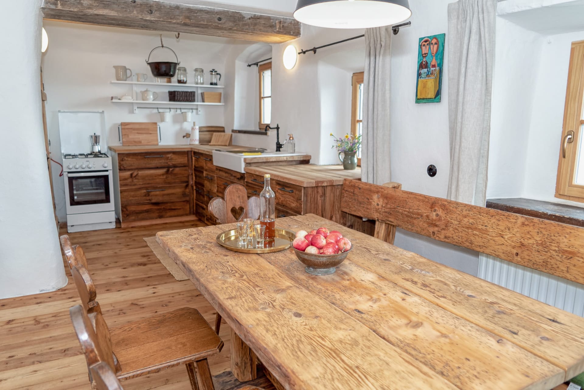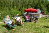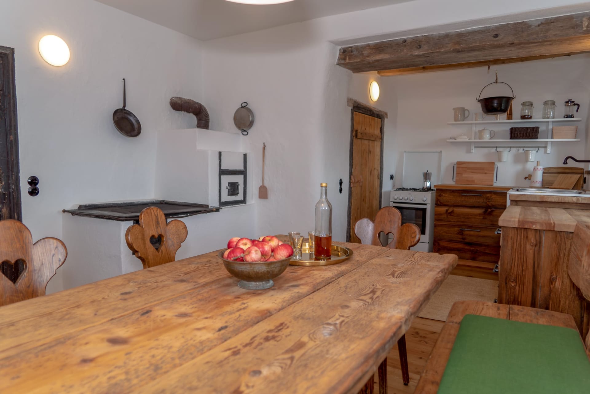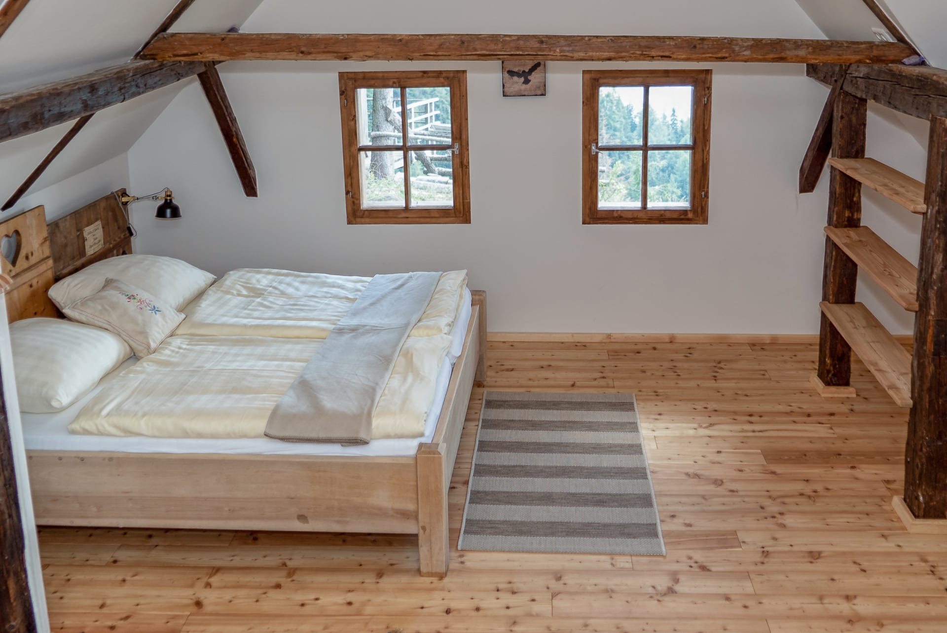 Heute finden Sie hier eine hochwertig ausgestattete Almhütte mit zwei Schlafeinheiten zu je vier Betten mit Badezimmer und Toilette. Die gesamte Einrichtung erfüllt jede Anforderung an ein komfortables Wohnen mit Kachelofen, Holzherd und Zentralheizung. Das Brennholz liegt für Sie vor der Hütte bereit. Der Außenbereich bietet eine schöne Sitzgelegenheit und eine Feuerstelle für schöne Abendstunden.