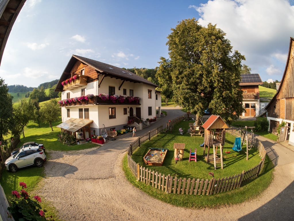 Unser Hof liegt auf 1150 m Seehöhe mit traumhaften Panoramablick ins Lavanttal und auf die Koralpe, den Sie vom jeweiligen Balkon der beiden Ferienwohnungen aus genießen können.