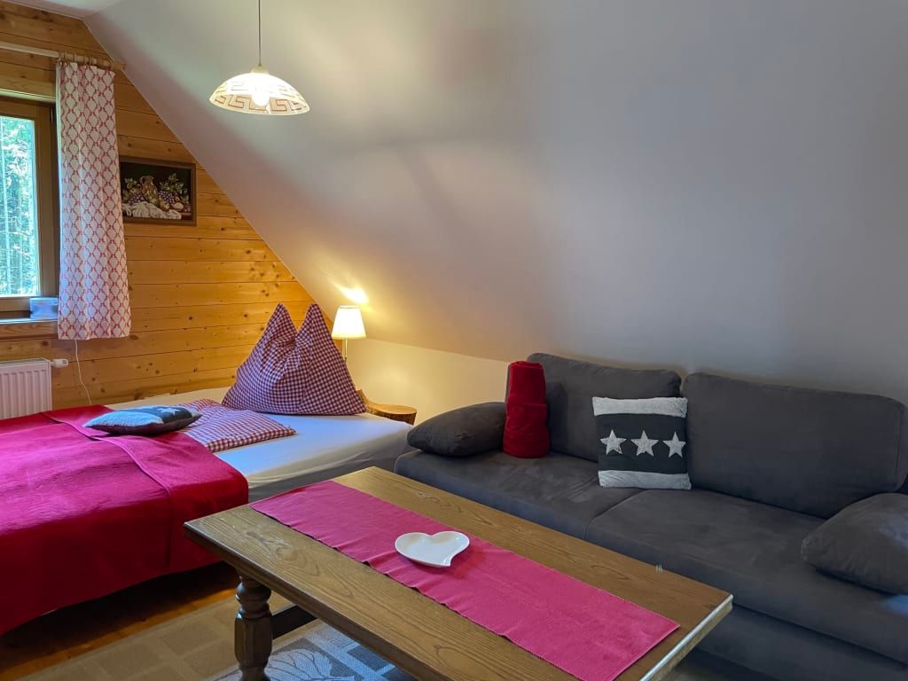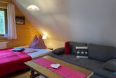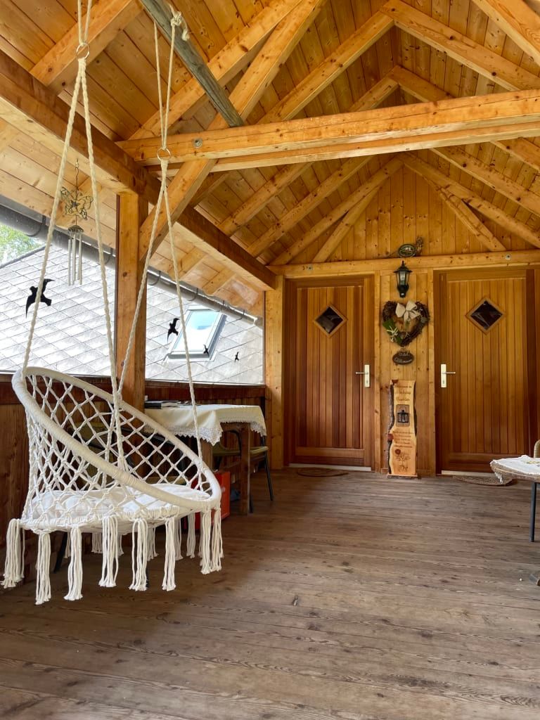 Vor dem Haus befinden sich Sitzgelegenheiten, eine Lagerfeuerstelle, Hängematten, Liegestühle und für unsere kleinen Gäste sind natürlich Schaukel, Rutsche und Spielsachen vorhanden. Weiters laden der Bach und der Wald zum Spielen und Entdecken ein.