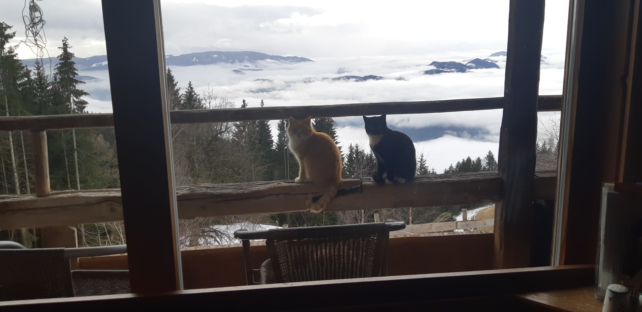 Im Stall und rund um die Hütte leben unsere Kühe, die sich immer wieder auf neue Bekanntschaften freuen, besonders wenn Sie in Winter mit Heu und Schrot versorgt werden.