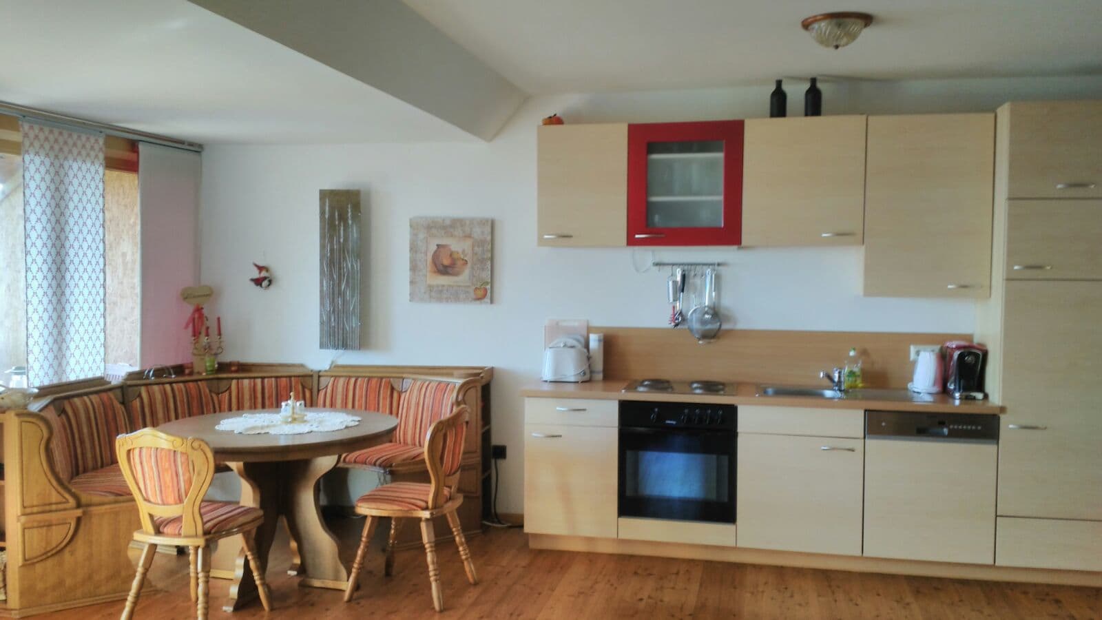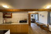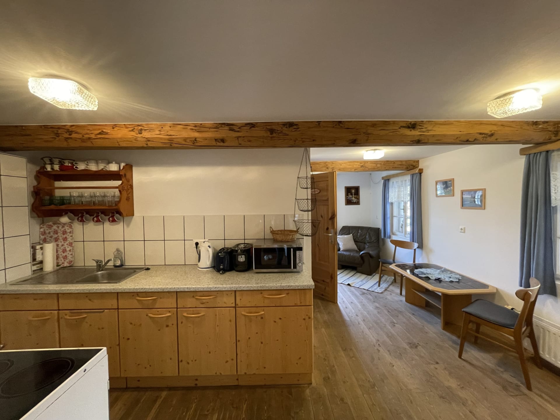 Es steht Ihnen eine vollausgestattete Küche mit E-Herd, Holzherd, Kühlschrank und einer Kaffemaschine zur Verfügung. Weiters verfügt das idyllisch, urig eingerichtete Apartment über ein Schlafzimmer mit Doppelbett und einen Einzelbett, ein Doppelzimmer, ein großes Wohnzimmer mit Couch (Schlafgelegenheit für zwei Personen) sowie über eine zweite, etwas größere Essecke. Auch der Komfort eines SAT-TVs sowie WLAN ist gegeben. Im Badezimmer befindet sich eine Dusche sowie ein WC.