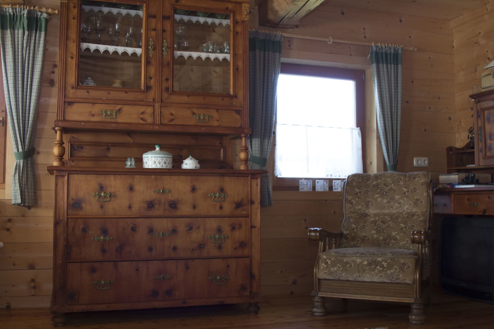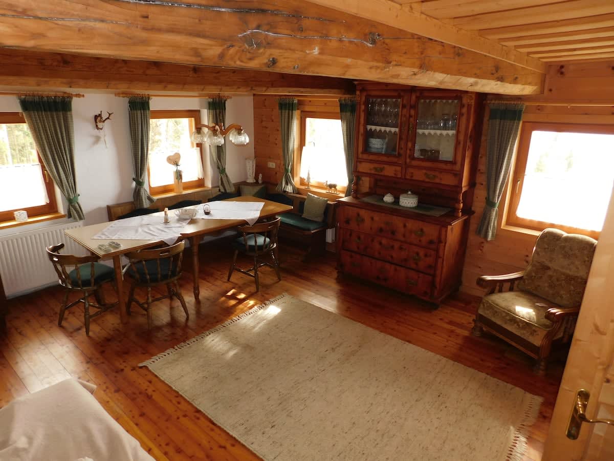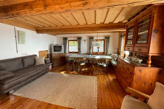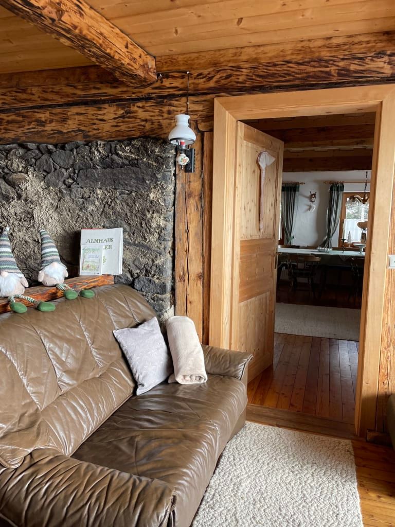 Die Urige Stube befindet sich im unteren Stock unseres Almhauses. Sie verfügt über einen geräumigen Vorraum mit einer Essecke, von welcher man durch eine große Glasfront direkt in das Tal und in die umliegende Bergwelt blickt. Außerdem lassen sich von dort aus der entspannende Kaminofen und die historischen Mauern aus Steinen gut bestaunen.