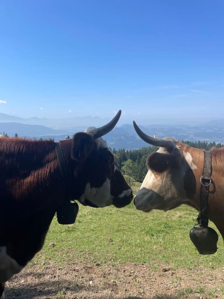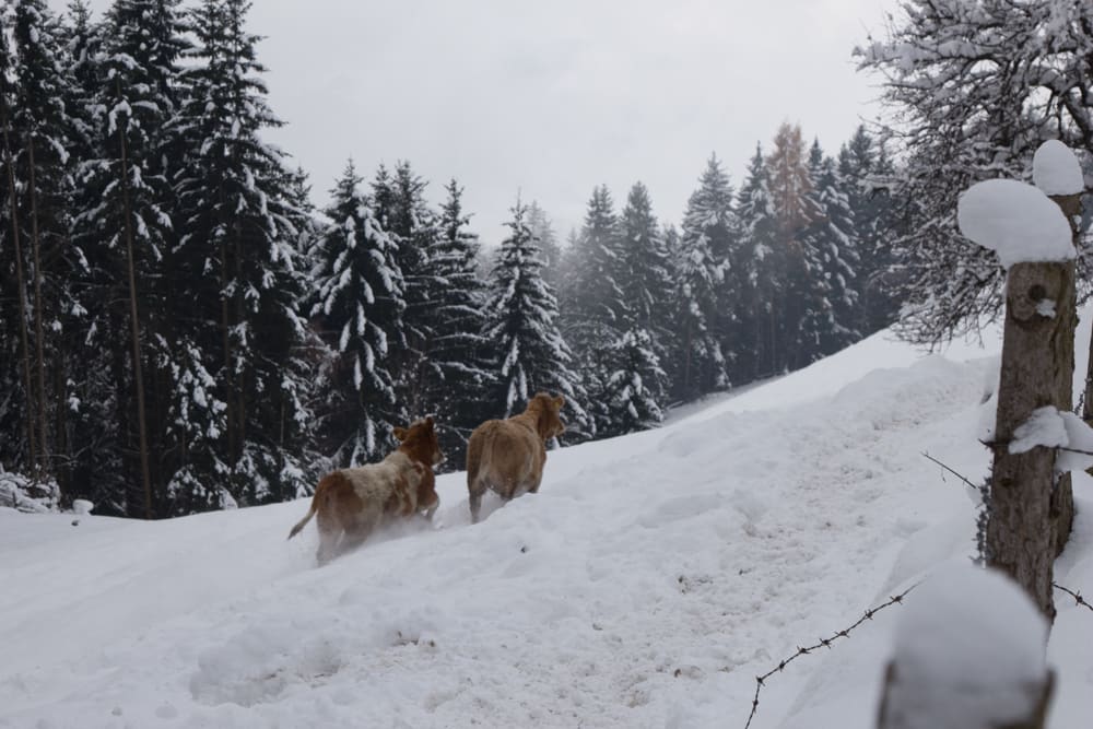 Im Stall und rund um die Hütte leben unsere Kühe, die sich immer wieder auf neue Bekanntschaften freuen, besonders wenn Sie in Winter mit Heu und Schrot versorgt werden.