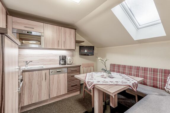 Ferienwohnung-Ausstattung: 3-Zimmer-Wohnung, 2. Etage, ca. 55 m². Vorraum. Wohn-/Schlafraum, geräumige Küche mit Küchenzeile (4 Ceranfelder, Mikrowelle, Backofen, Geschirrspüler, Wasserkocher, Kaffeemaschine)und Sitzecke. Abgetrenntes Schlafzimmer mit Doppelbett und Einzelbett und Bad/WC. WIFI.