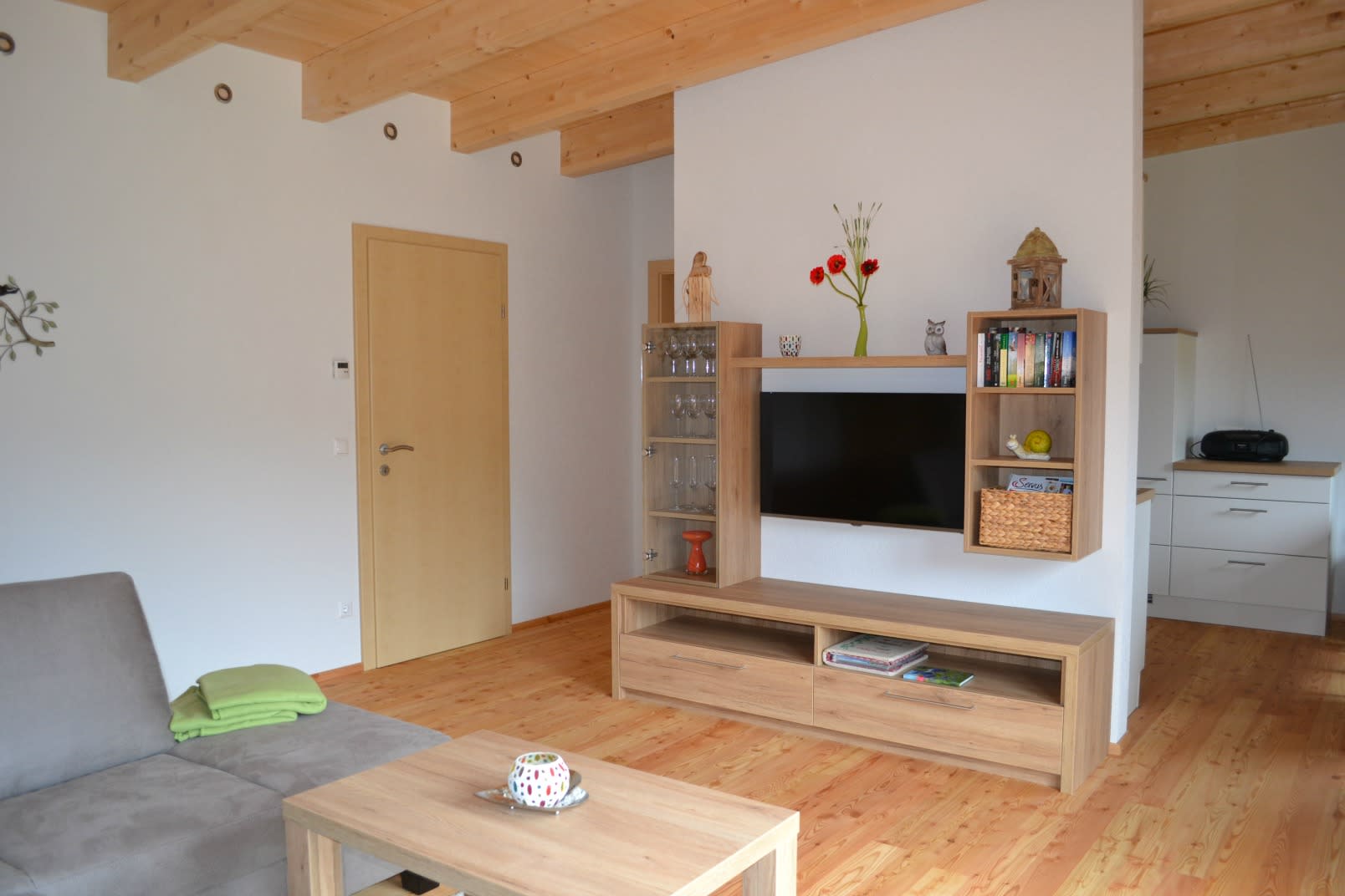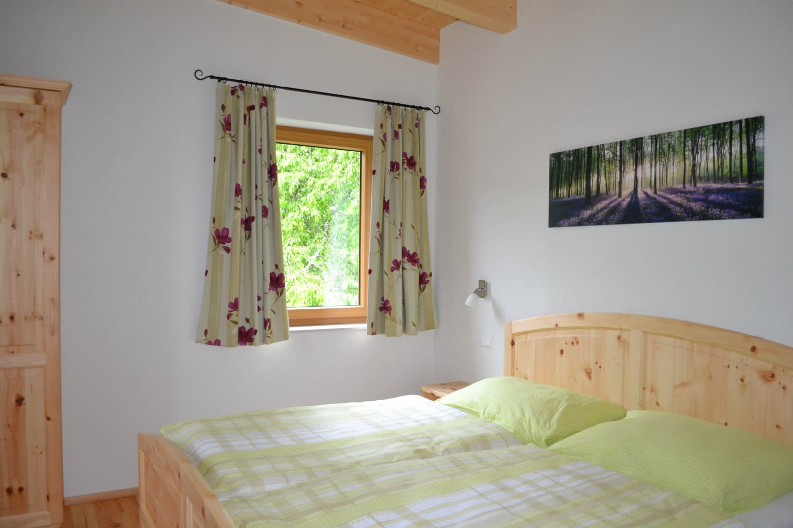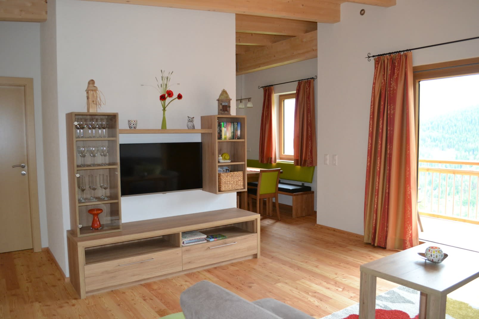 Die Ferienwohnung Fernblick befindet sich im Nebengebäude im 2. Stock. Die Wohnung besteht aus 2 Schlafzimmern mit 1 Doppelbett und 1 Stockbett. Das Bad ist mit offener Dusche, komfortablem Waschplatz und WC ausgestattet. Die Wohnküche hat eine großzügige Essecke. Der Wohnraum lädt mit der gemütlichen Eckcouch zum relaxen ein. Durch eine Schiebetüre gelangt man auf den Balkon mit einzigartigem Panoramablick.
