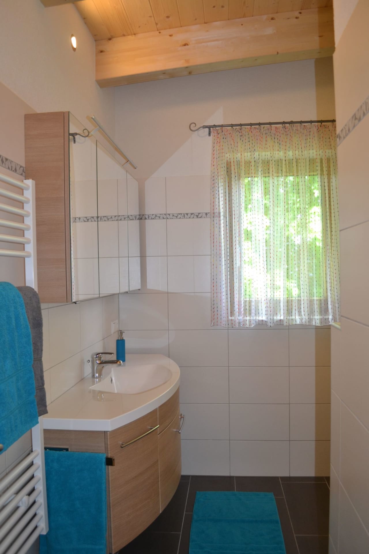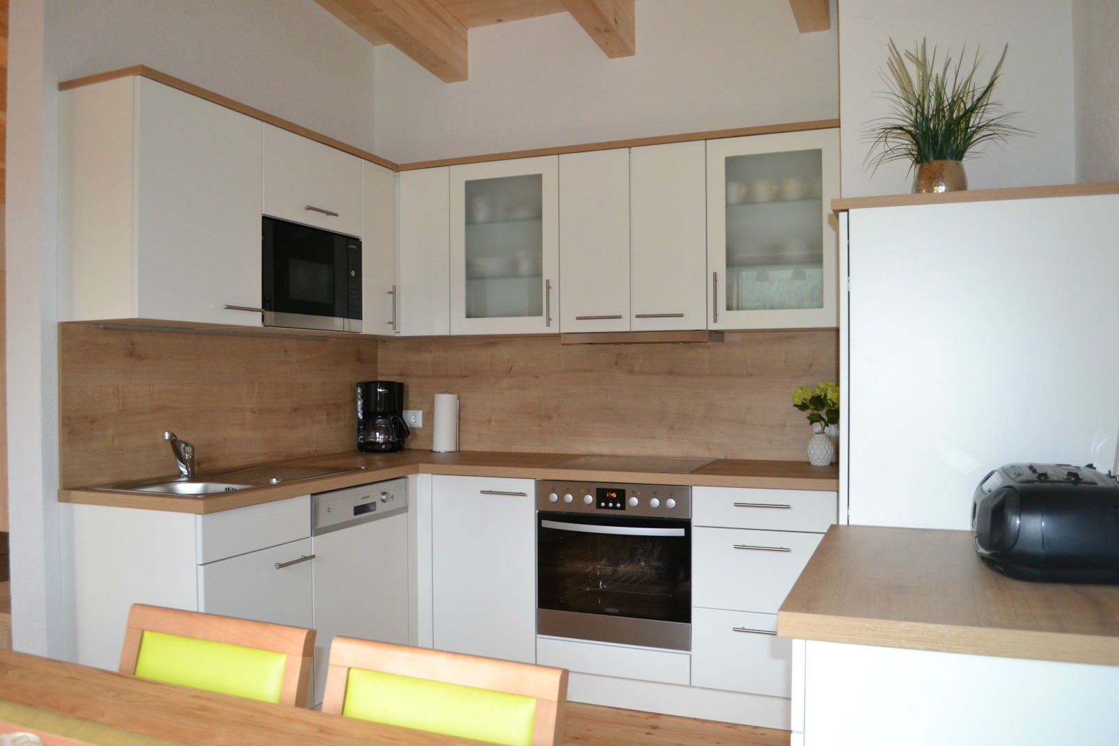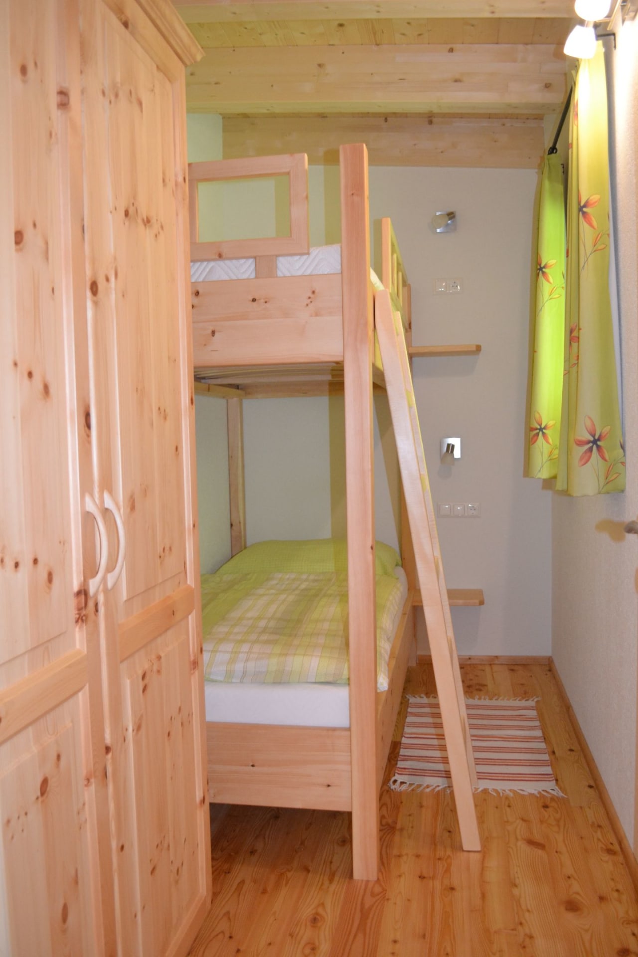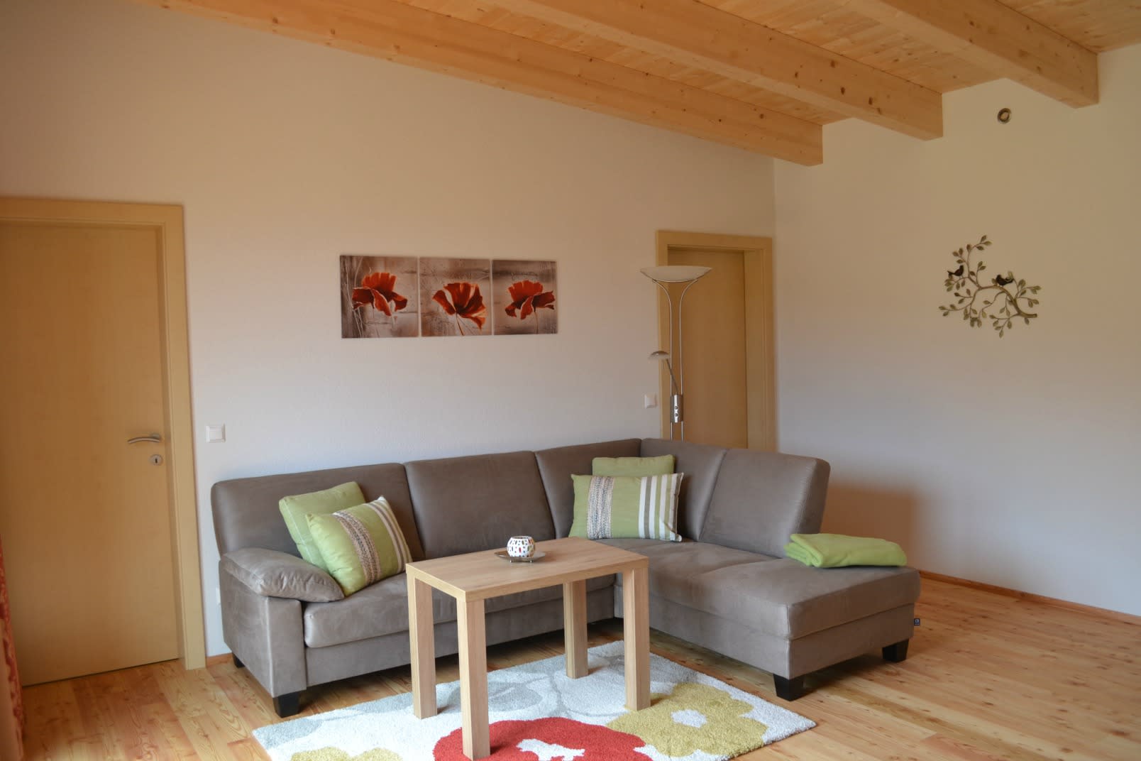Die Ferienwohnung Fernblick befindet sich im Nebengebäude im 2. Stock. Die Wohnung besteht aus 2 Schlafzimmern mit 1 Doppelbett und 1 Stockbett. Das Bad ist mit offener Dusche, komfortablem Waschplatz und WC ausgestattet. Die Wohnküche hat eine großzügige Essecke. Der Wohnraum lädt mit der gemütlichen Eckcouch zum relaxen ein. Durch eine Schiebetüre gelangt man auf den Balkon mit einzigartigem Panoramablick.