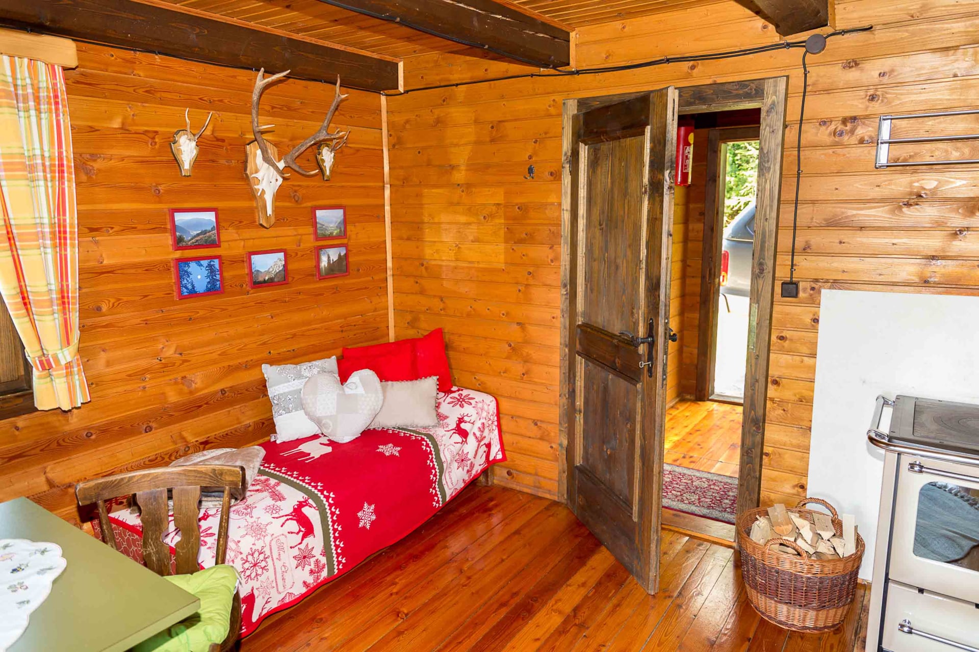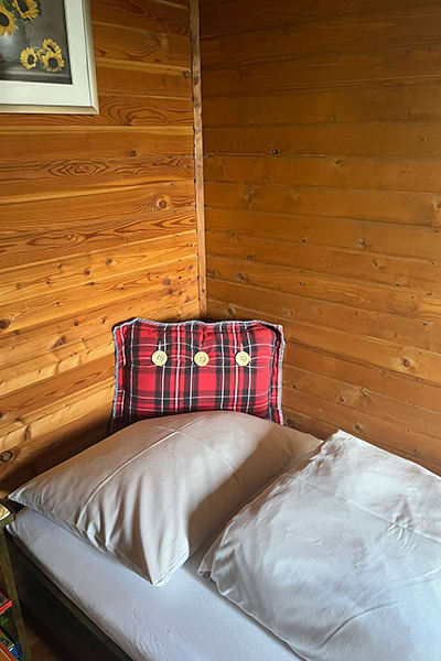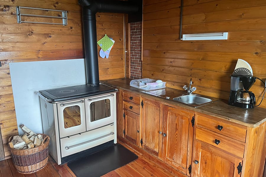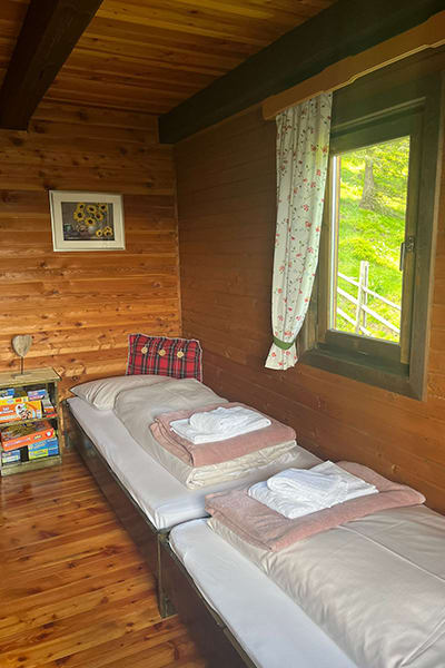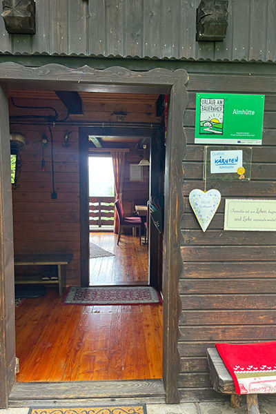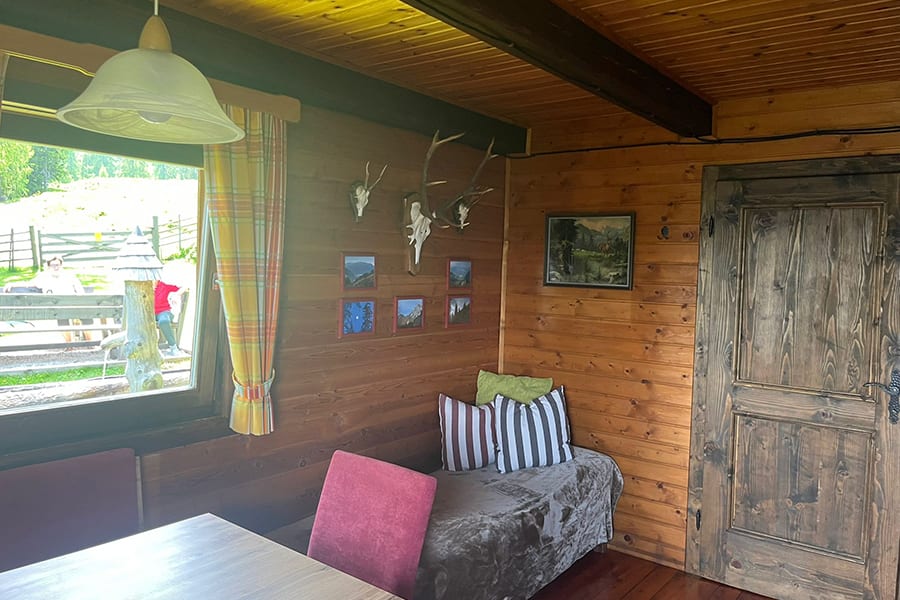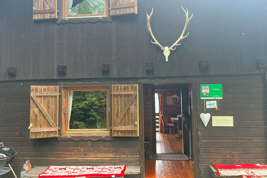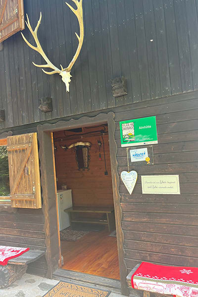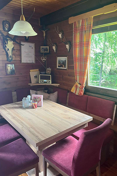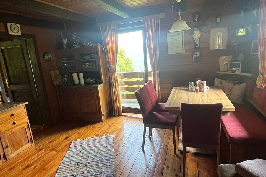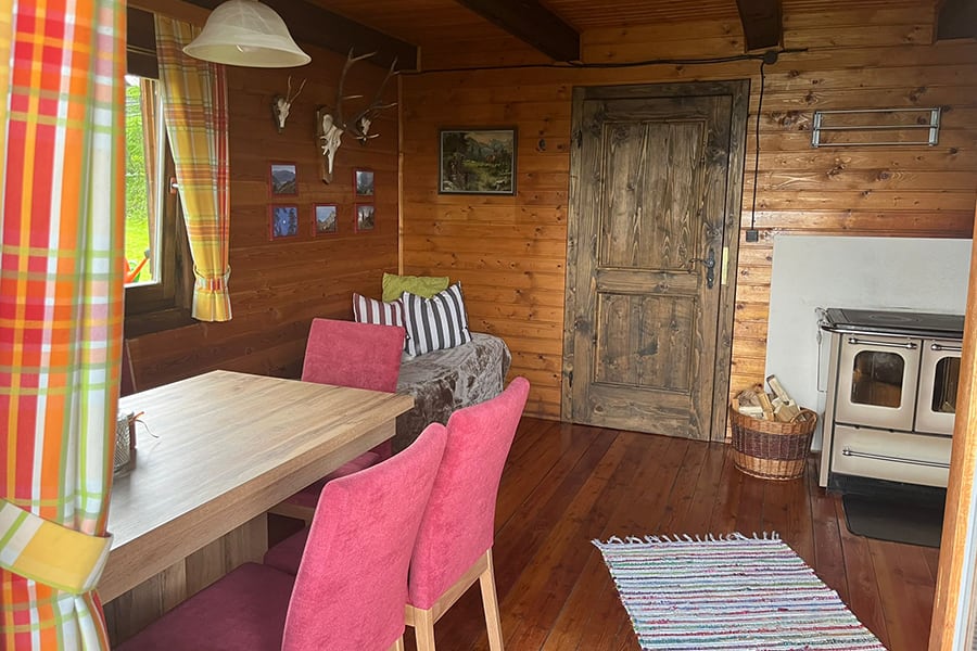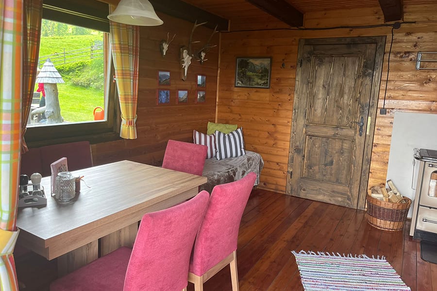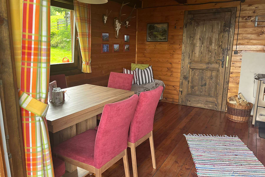 Gemütliche Almhütte mit Vorraum; ausgestattete Küche mit Holzherd, Kühlschrank, Sitzecke, Couch, Warm-Fließwasser. EG: Doppelzimmer. WC mit Waschbecken (Fließwasser). Über eine Treppe 2 Doppelzimmer. Duschkabine mit Warmfließwasser (Gastherme).