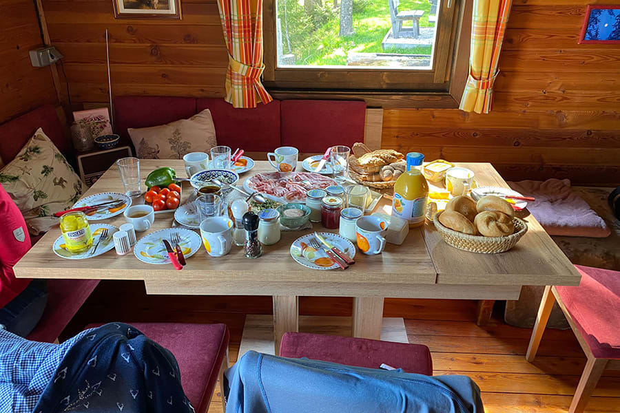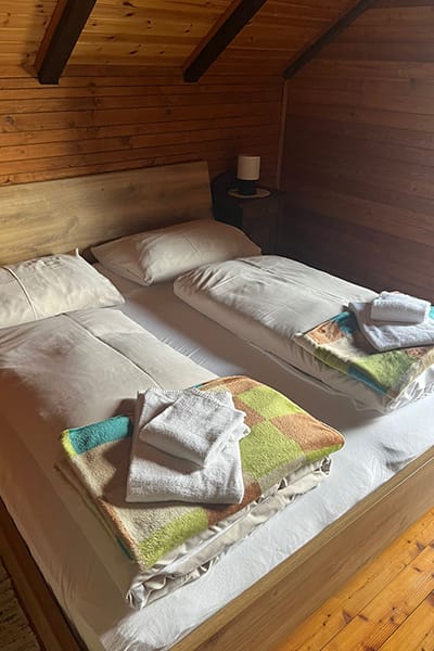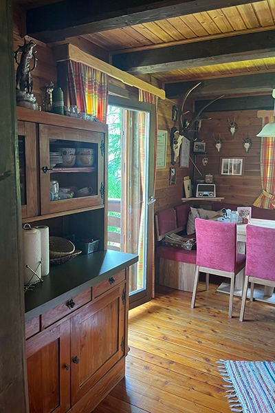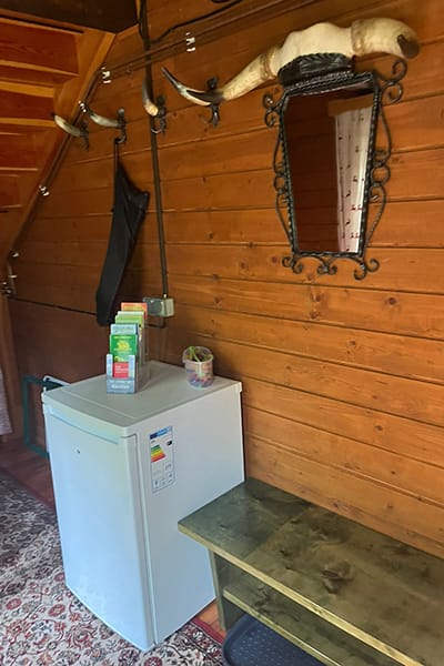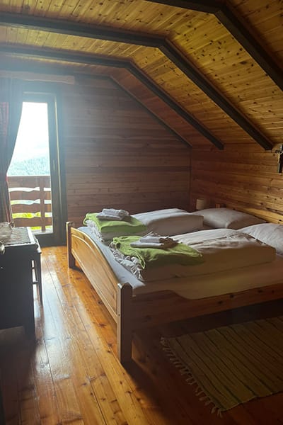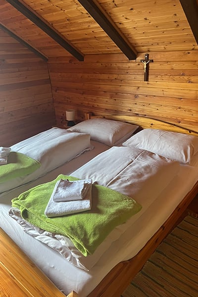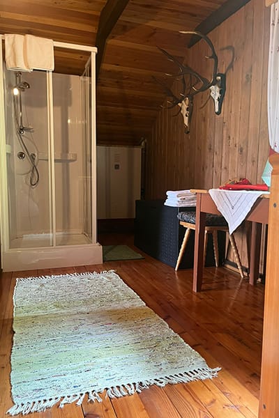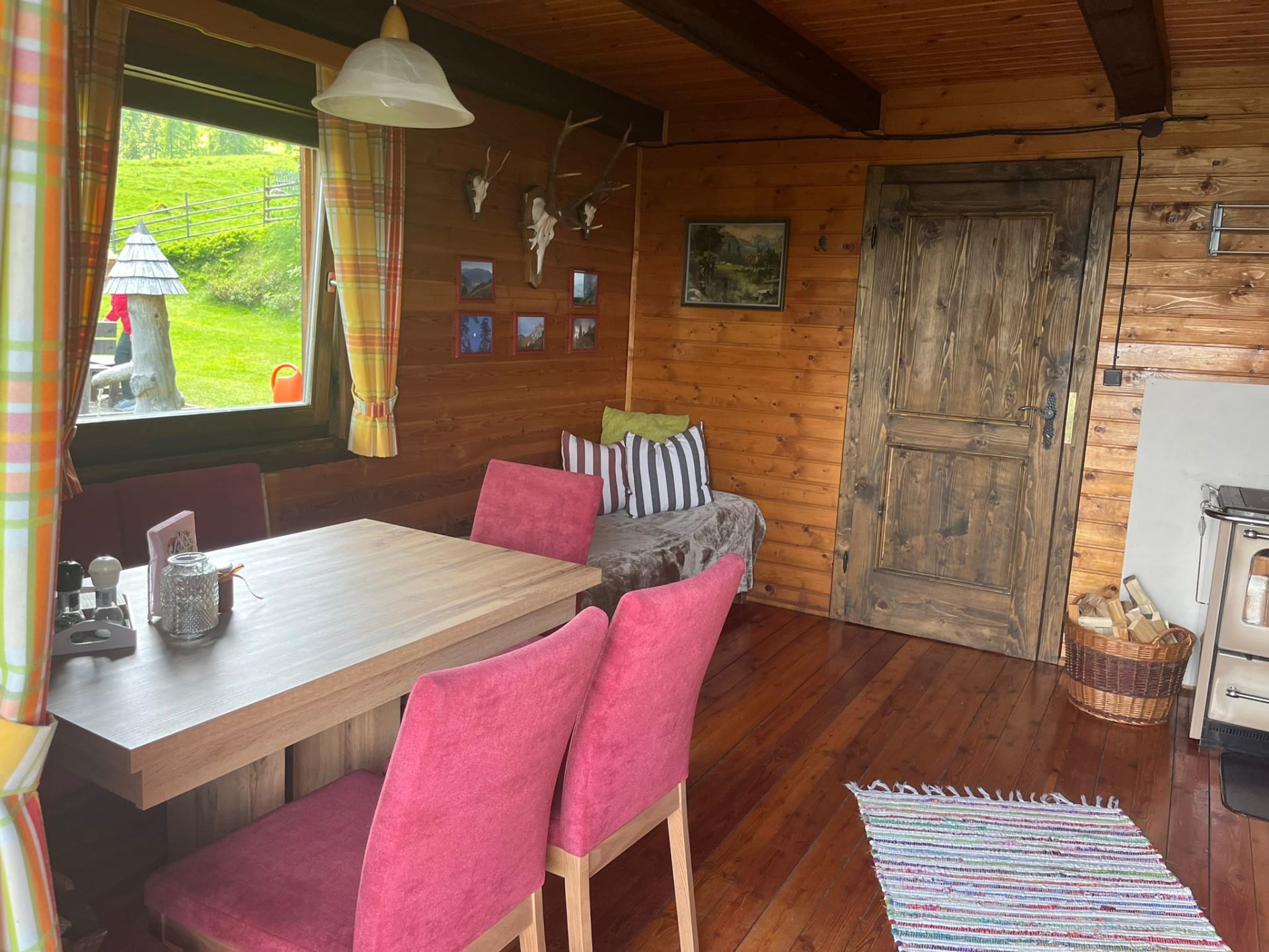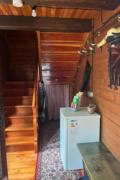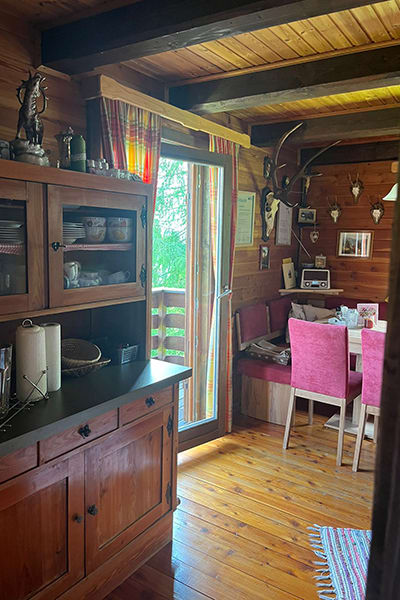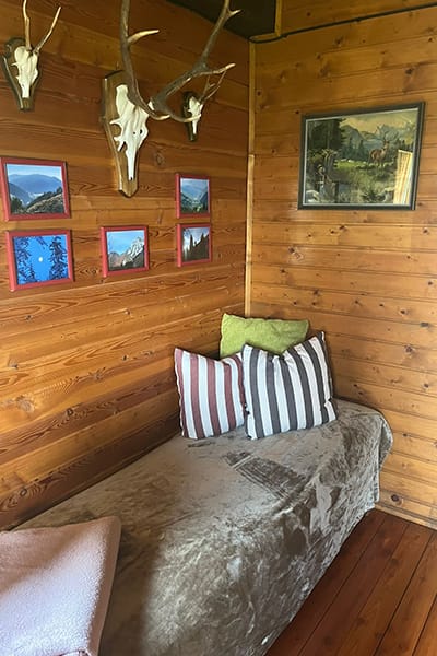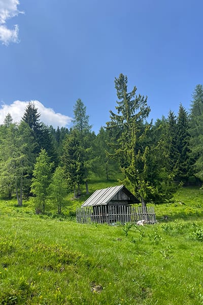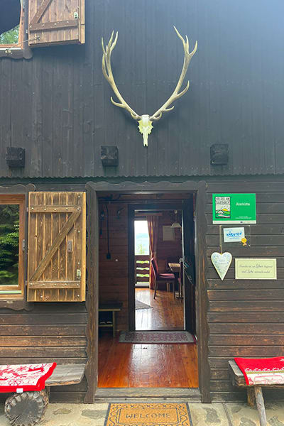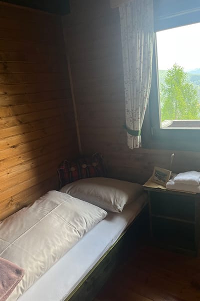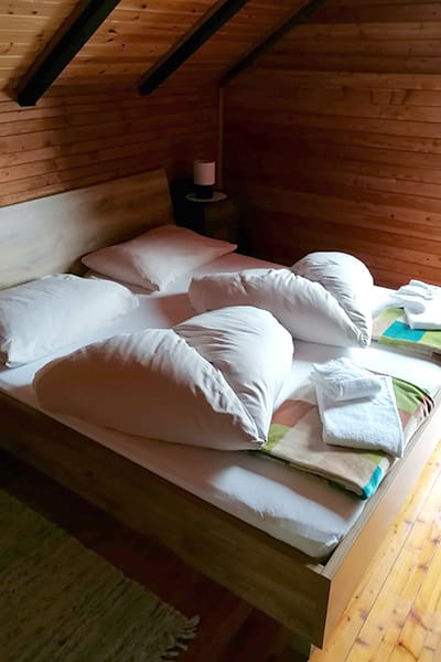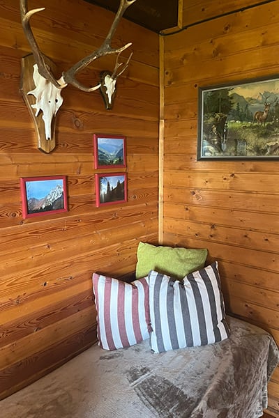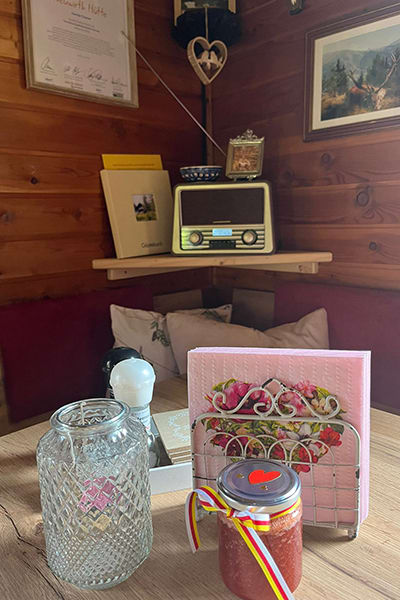 Gemütliche Almhütte mit Vorraum; ausgestattete Küche mit Holzherd, Kühlschrank, Sitzecke, Couch, Warm-Fließwasser. EG: Doppelzimmer. WC mit Waschbecken (Fließwasser). Über eine Treppe 2 Doppelzimmer. Duschkabine mit Warmfließwasser (Gastherme).
