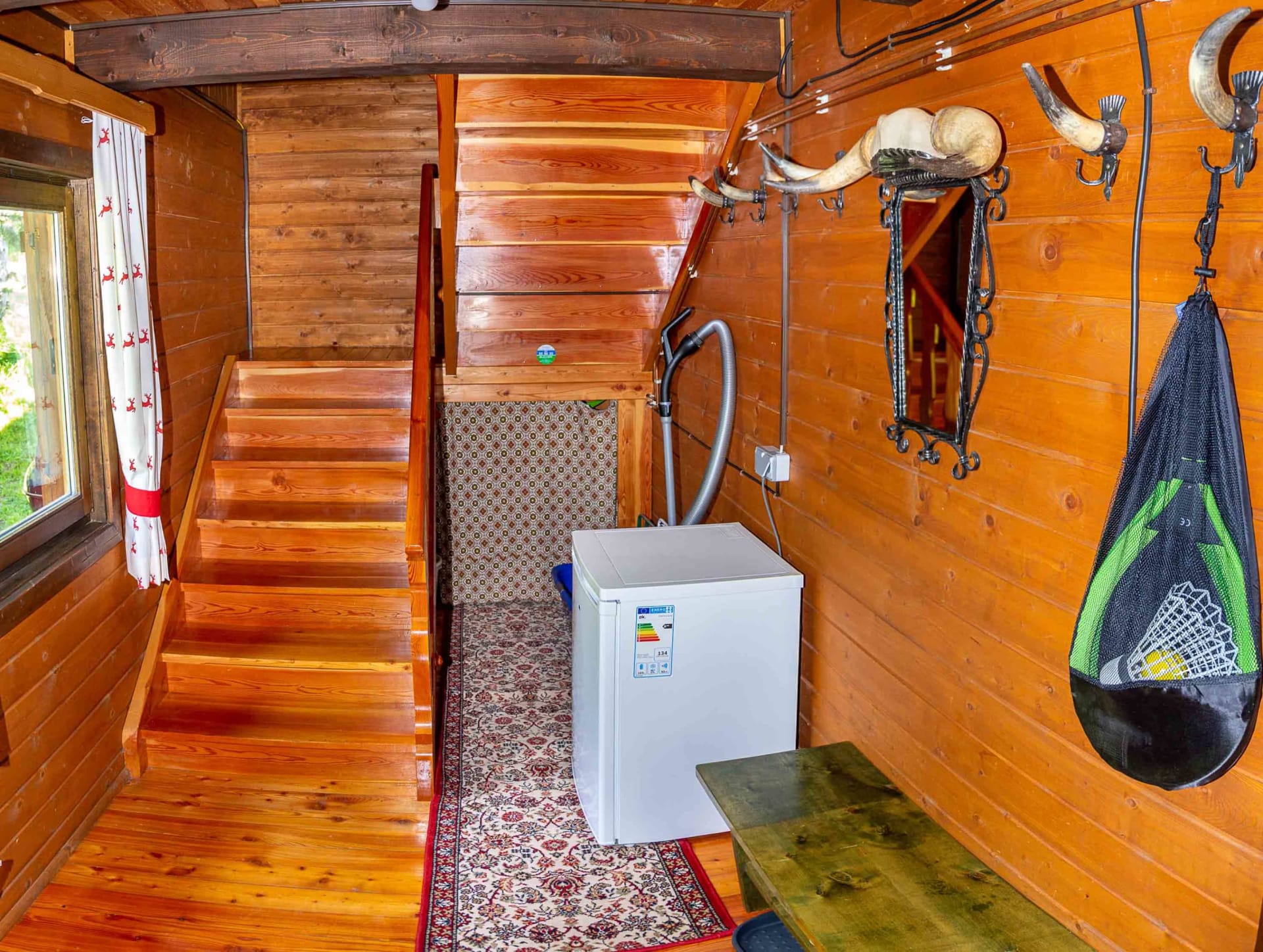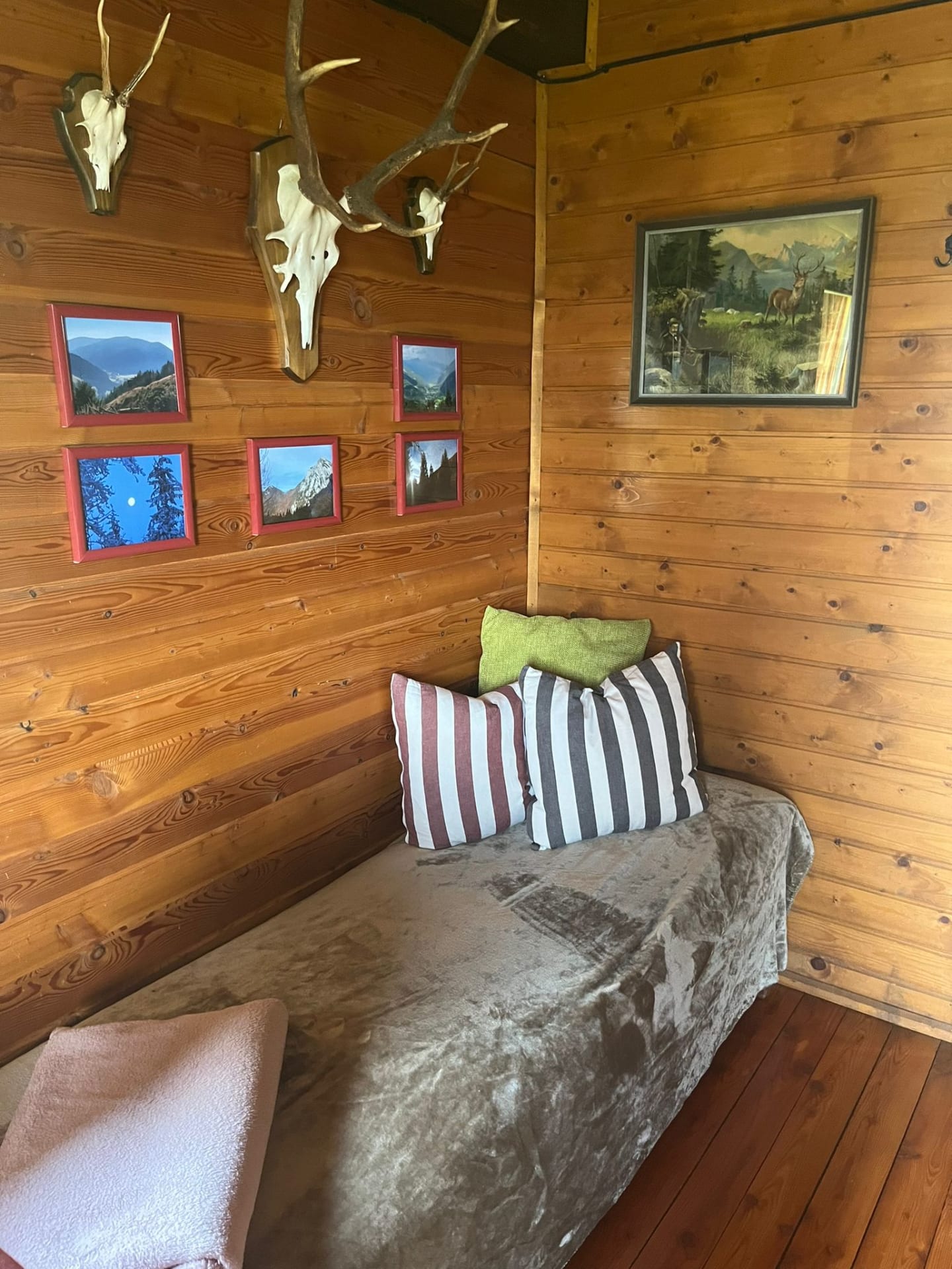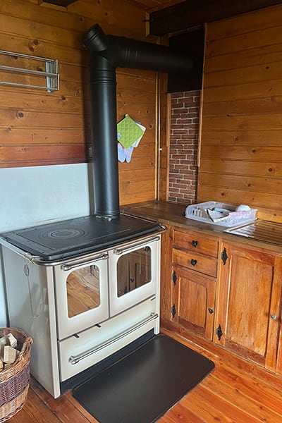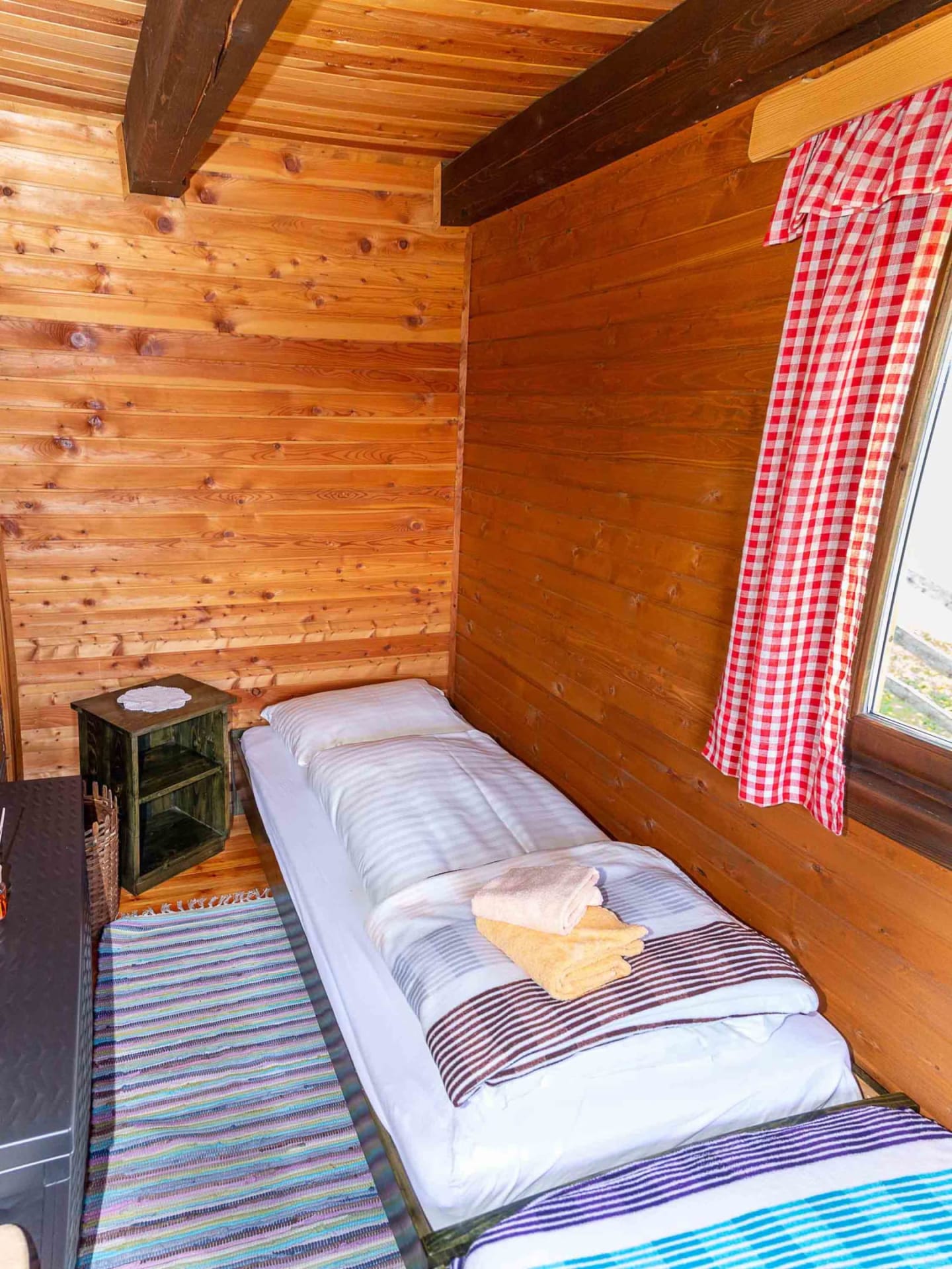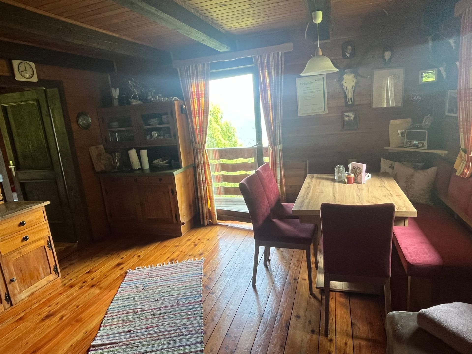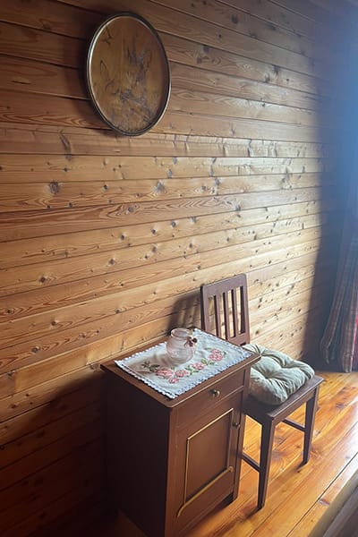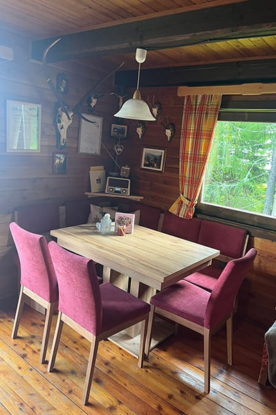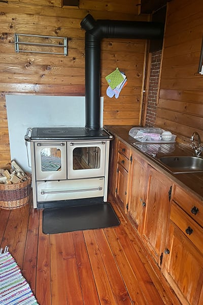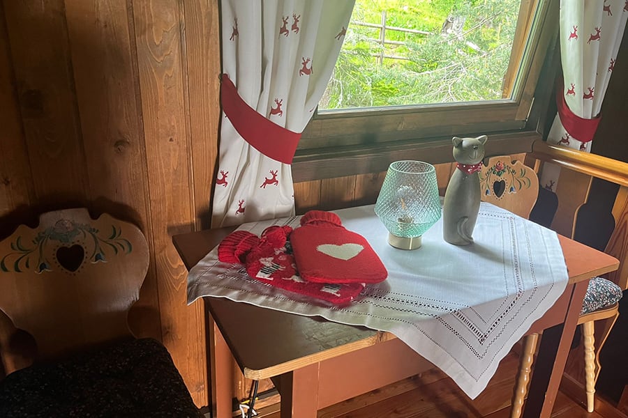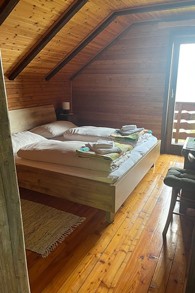 Gemütliche Almhütte mit Vorraum; ausgestattete Küche mit Holzherd, Kühlschrank, Sitzecke, Couch, Warm-Fließwasser. EG: Doppelzimmer. WC mit Waschbecken (Fließwasser). Über eine Treppe 2 Doppelzimmer. Duschkabine mit Warmfließwasser (Gastherme).