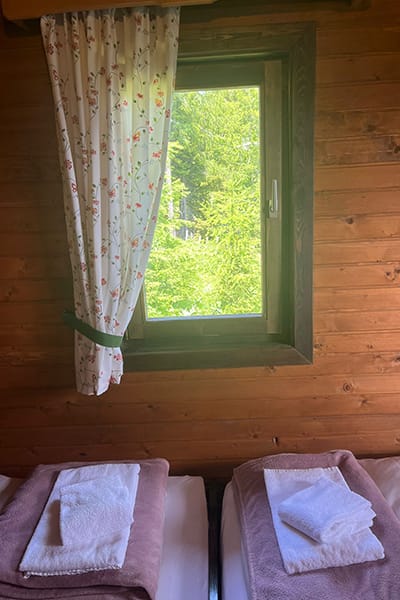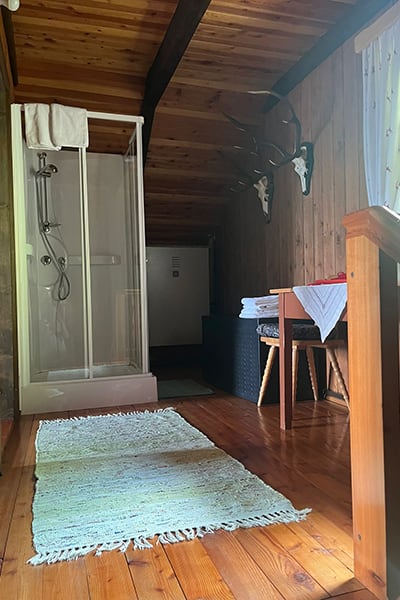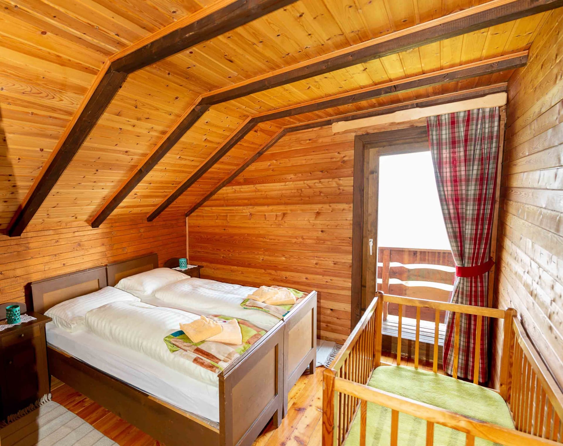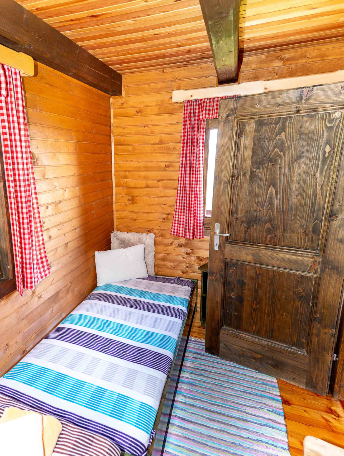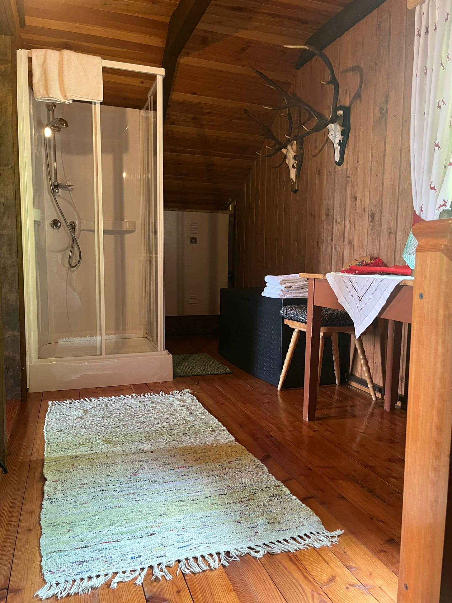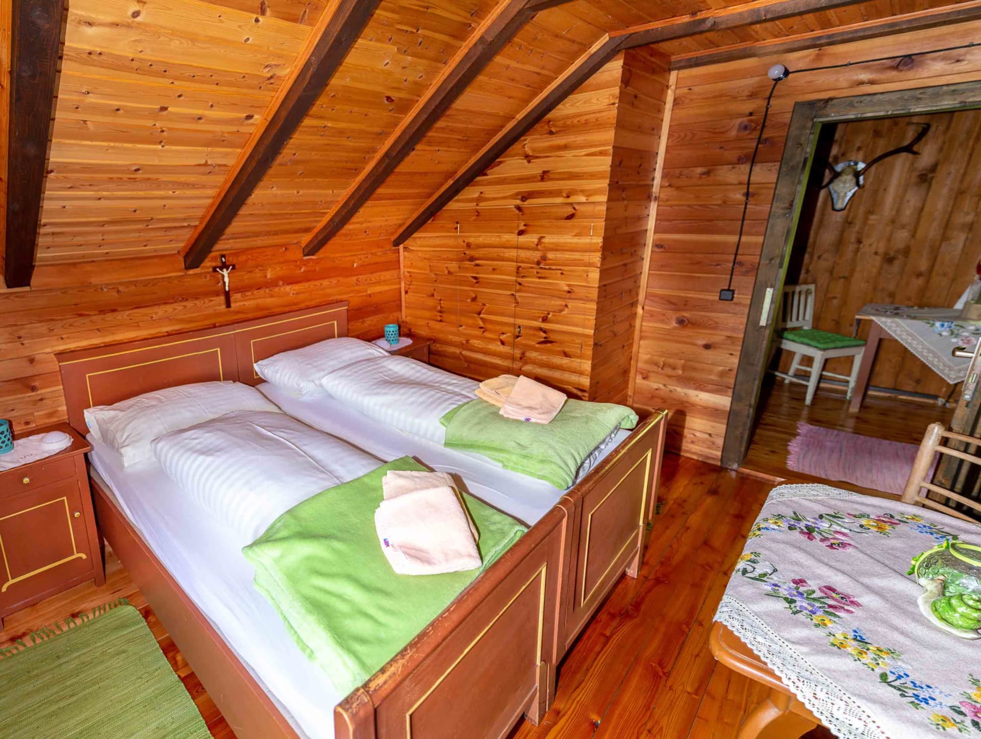Gemütliche Almhütte mit Vorraum; ausgestattete Küche mit Holzherd, Kühlschrank, Sitzecke, Couch, Warm-Fließwasser. EG: Doppelzimmer. WC mit Waschbecken (Fließwasser). Über eine Treppe 2 Doppelzimmer. Duschkabine mit Warmfließwasser (Gastherme).