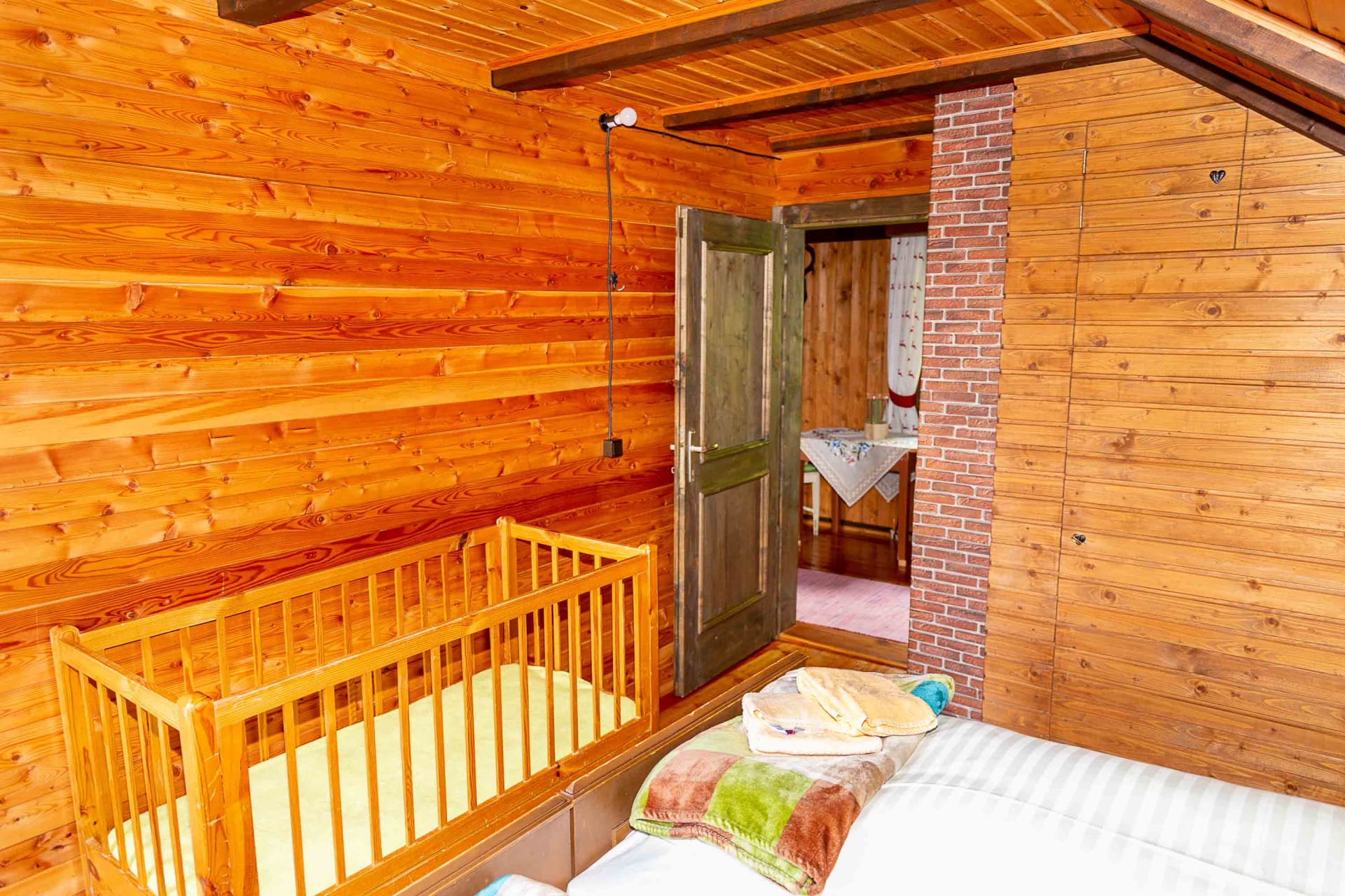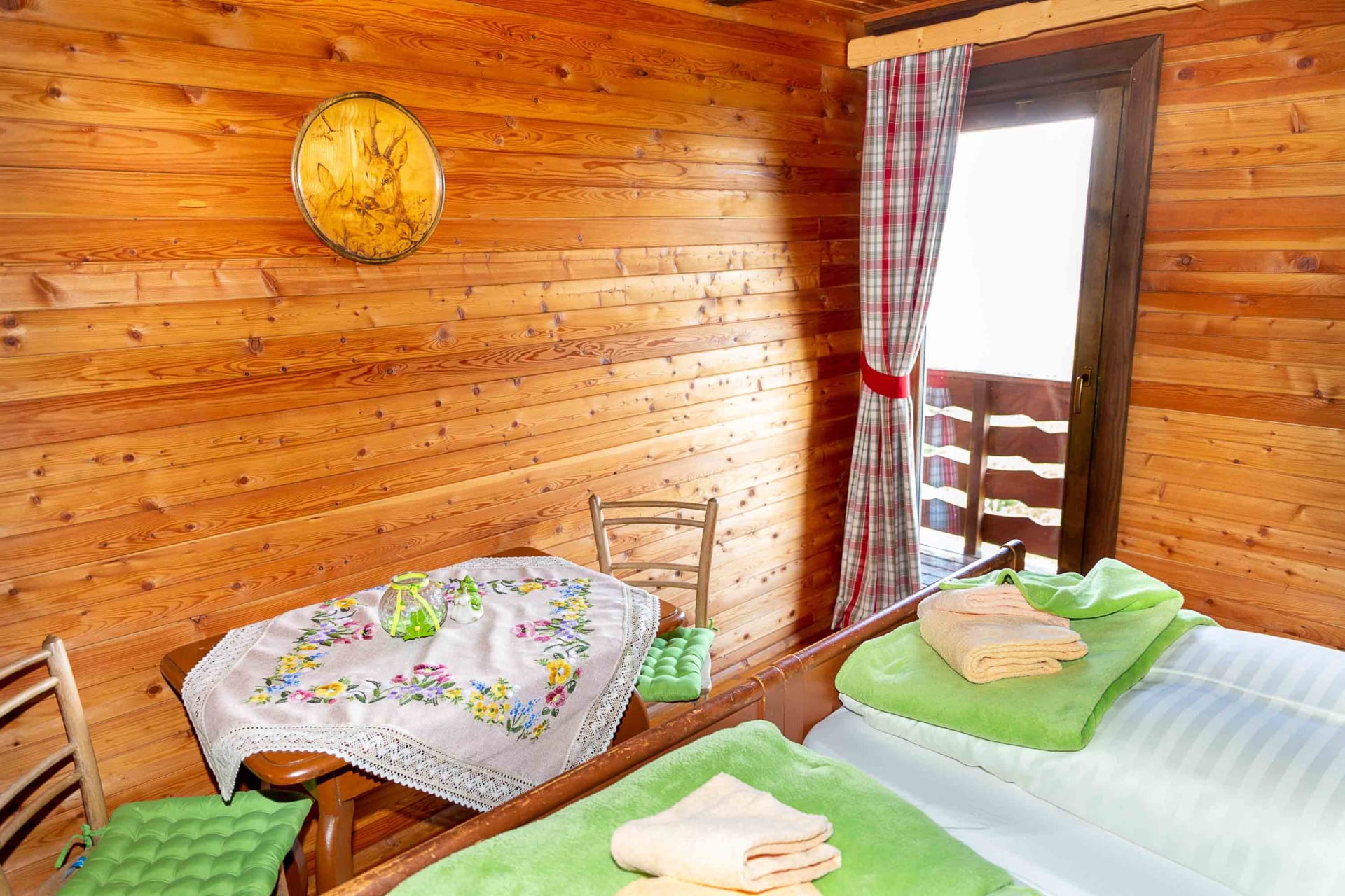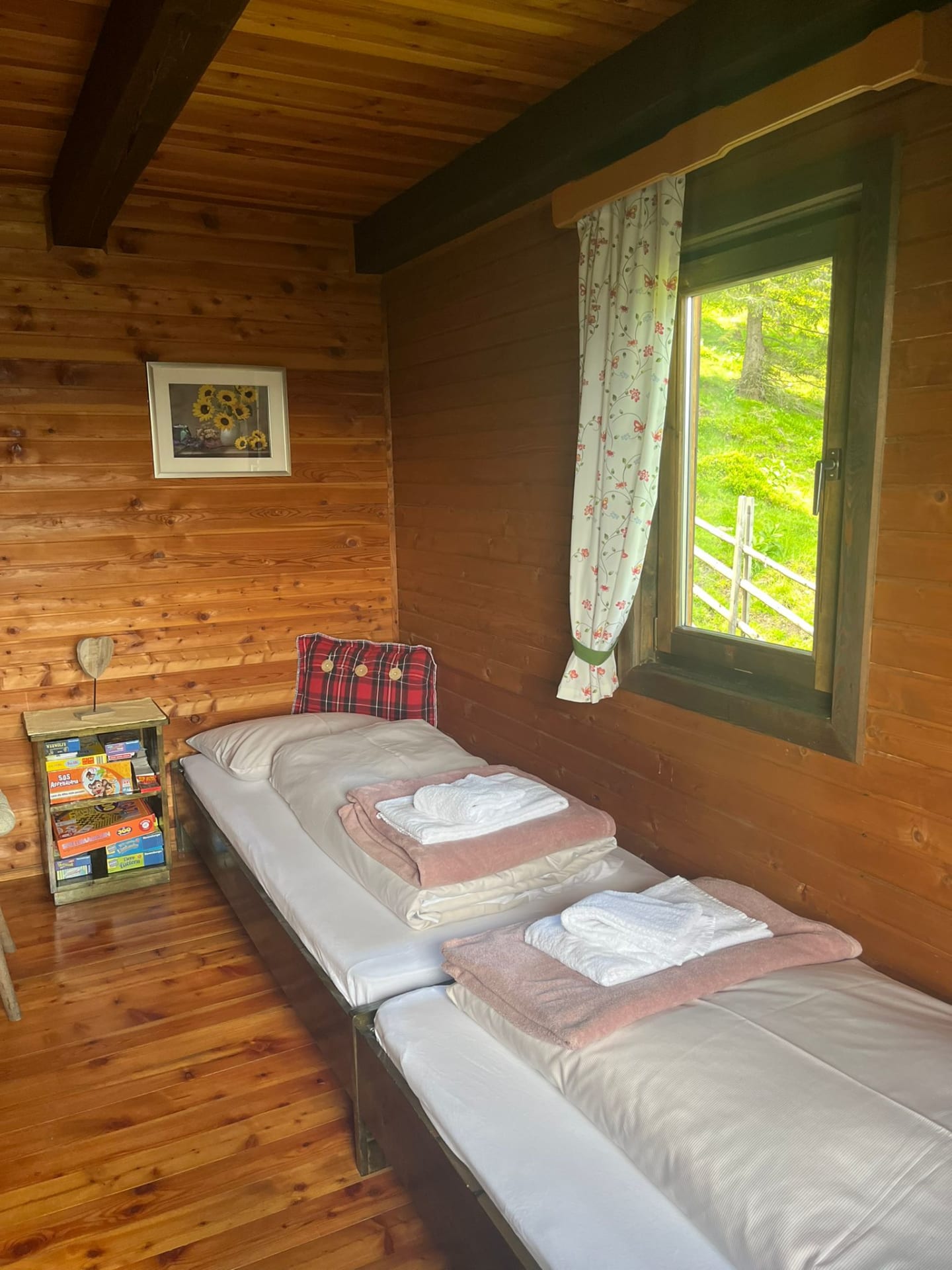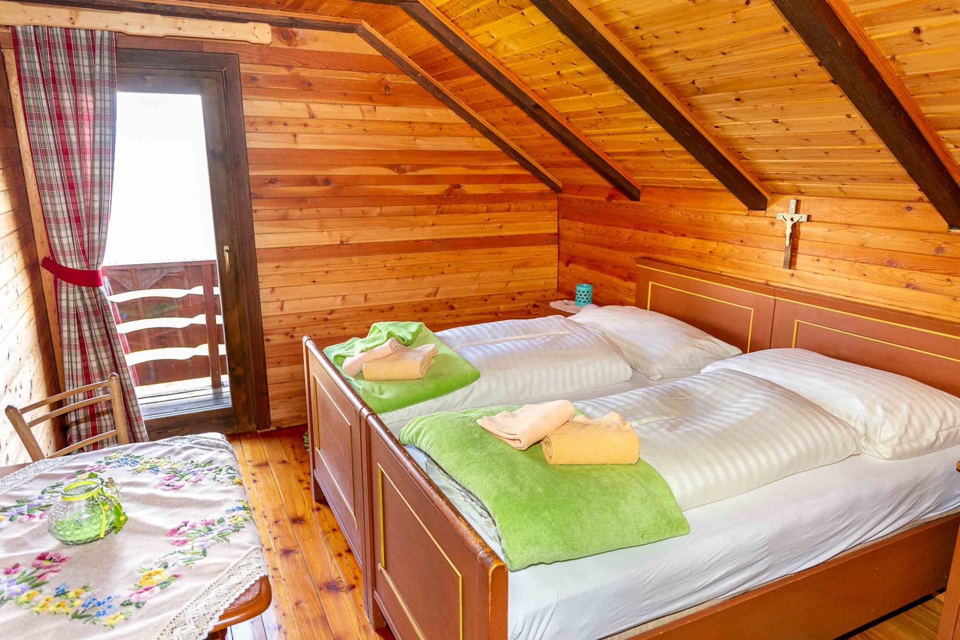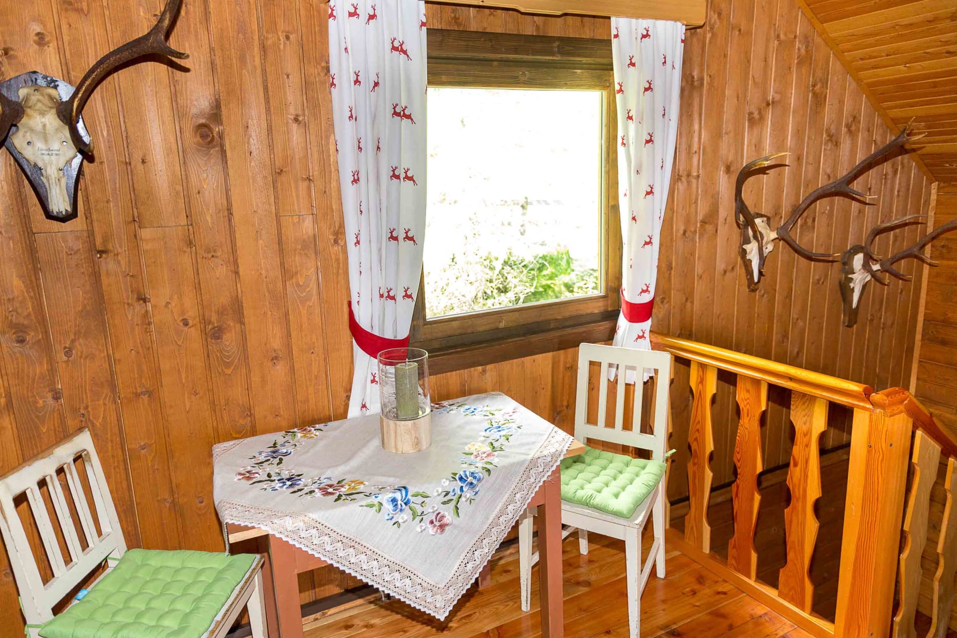 Gemütliche Almhütte mit Vorraum; ausgestattete Küche mit Holzherd, Kühlschrank, Sitzecke, Couch, Warm-Fließwasser. EG: Doppelzimmer. WC mit Waschbecken (Fließwasser). Über eine Treppe 2 Doppelzimmer. Duschkabine mit Warmfließwasser (Gastherme).